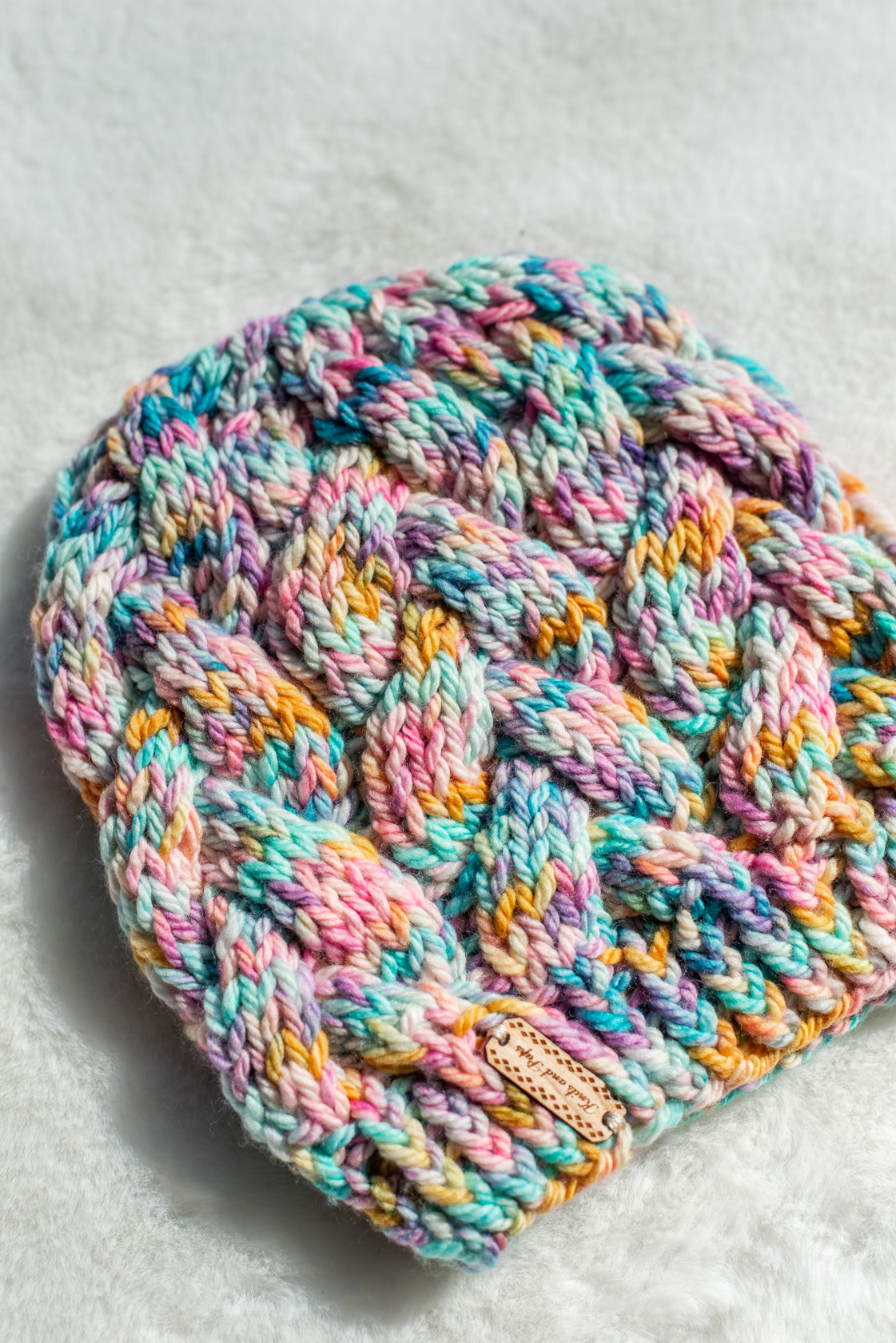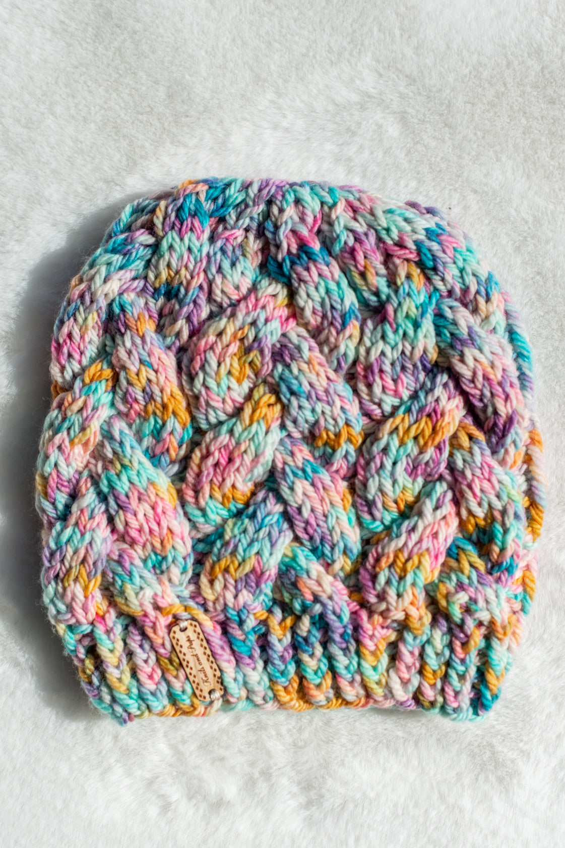 All one of a kind hats are knit with hand dyed, 100% merino wool. Because of how the wool we use is dyed by hand, each skein is unique. Combined with the braided pattern, even if we use the same colorway, each hat is totally one of a kind.
