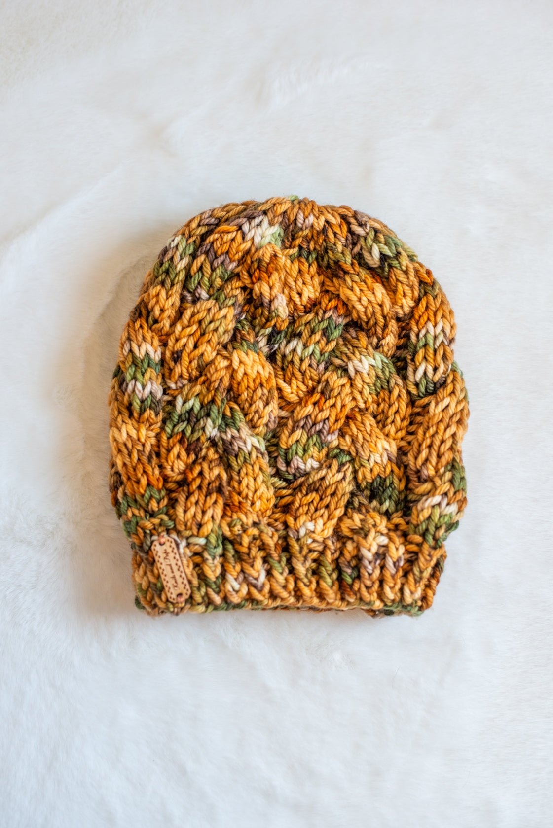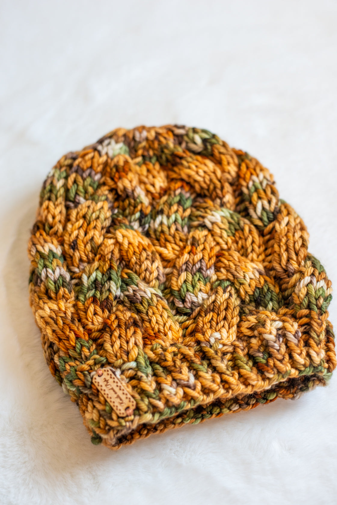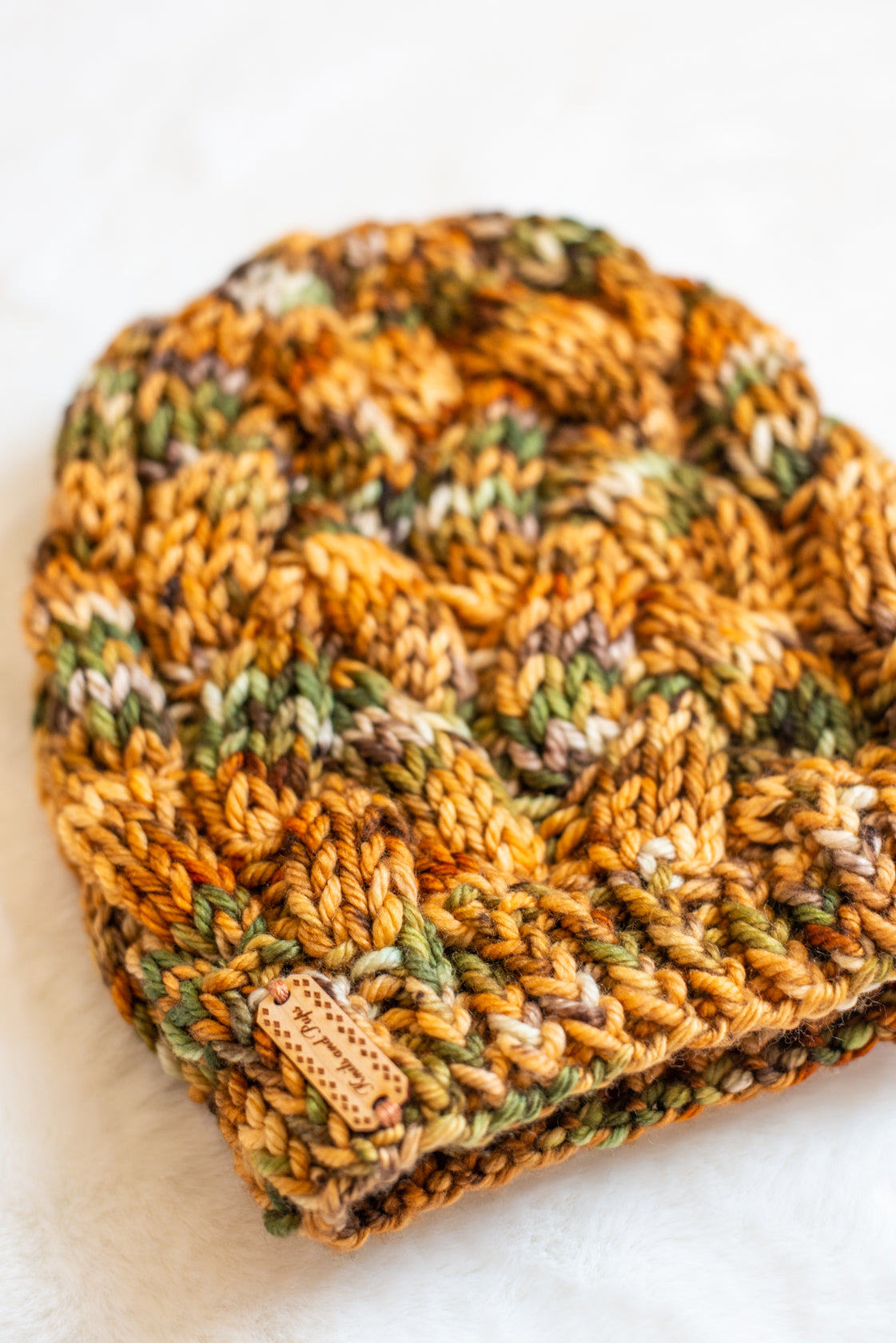 All one of a kind hats are knit with hand dyed, 100% merino wool. Because of how the wool we use is dyed by hand, each skein is unique. Combined with the braided pattern, even if we use the same colorway, each hat is totally one of a kind.
