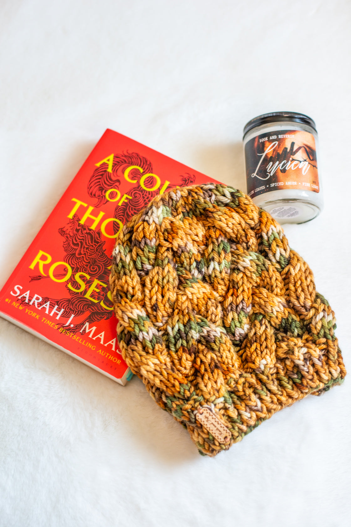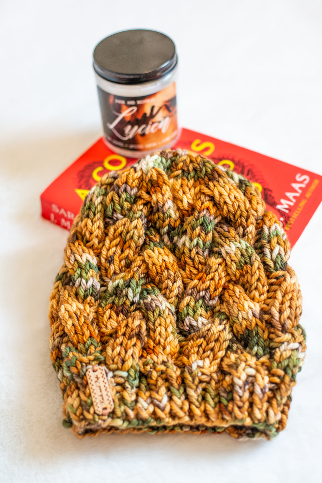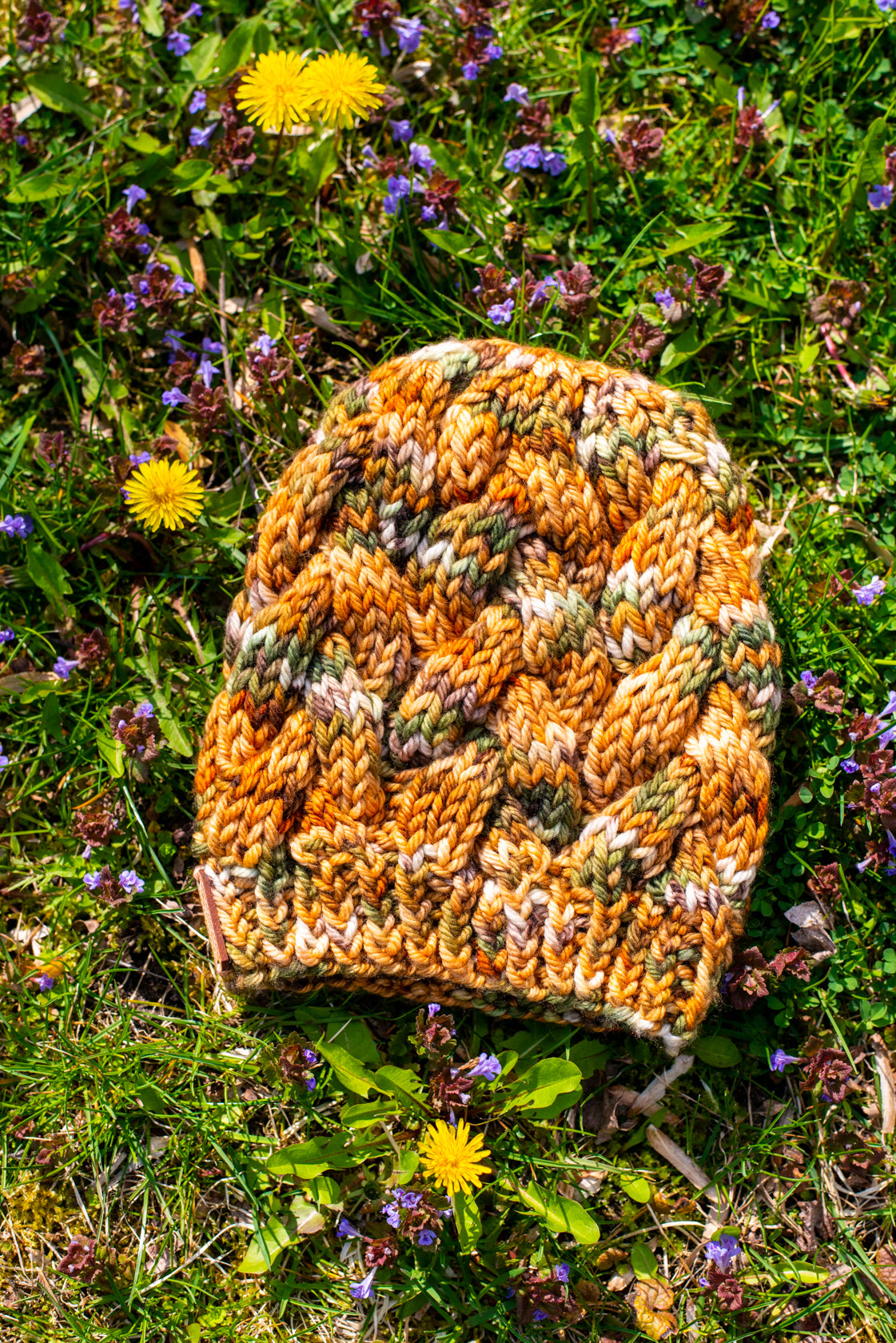 All one of a kind hats are knit with hand dyed, 100% merino wool. Because of how the wool we use is dyed by hand, each skein is unique. Combined with the braided pattern, even if we use the same colorway, each hat is totally one of a kind.