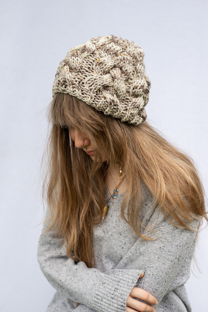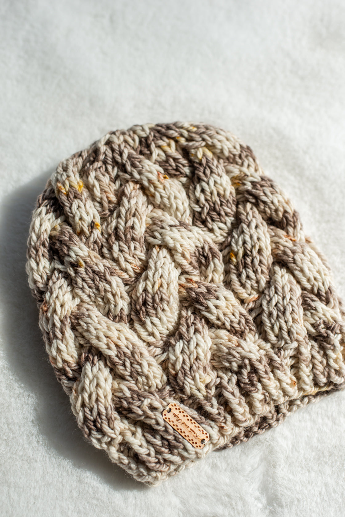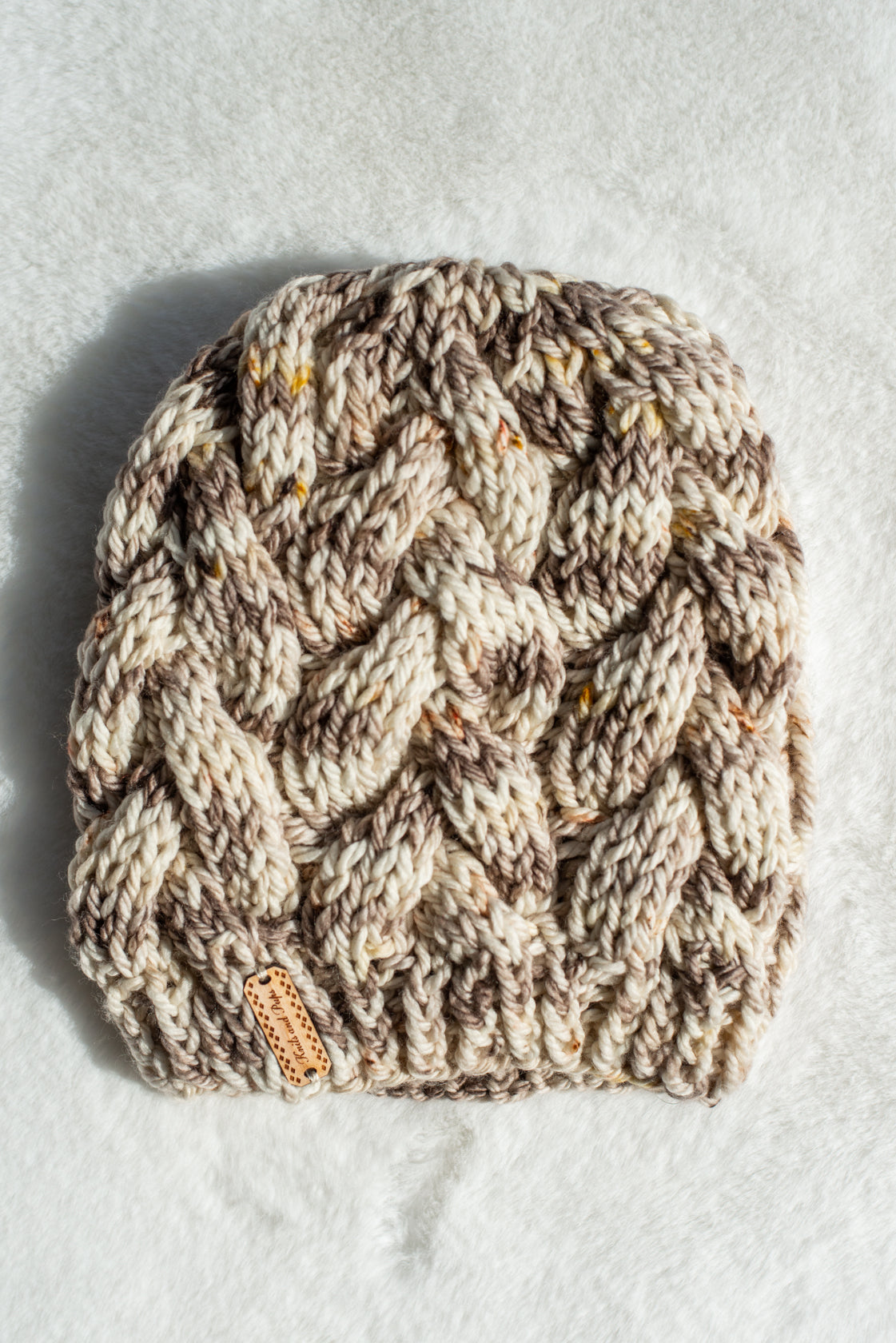 All one of a kind hats are knit with hand dyed, 100% merino wool. Because of how the wool we use is dyed by hand, each skein is unique. Combined with the braided pattern, even if we use the same colorway, each hat is totally one of a kind.