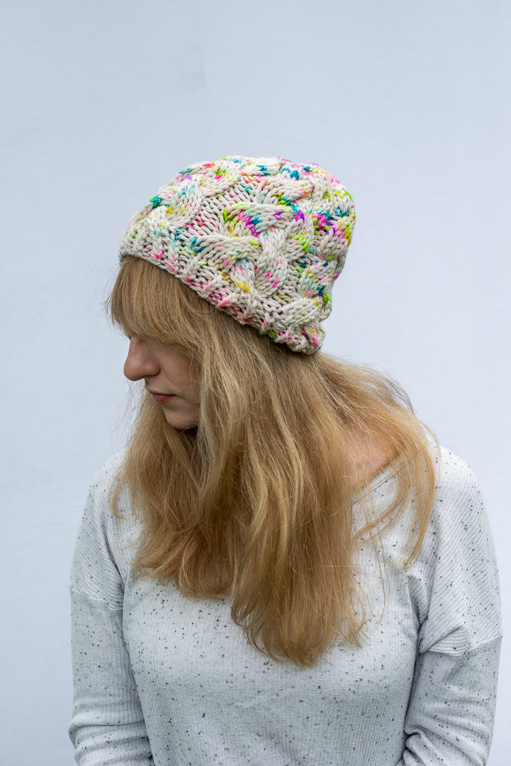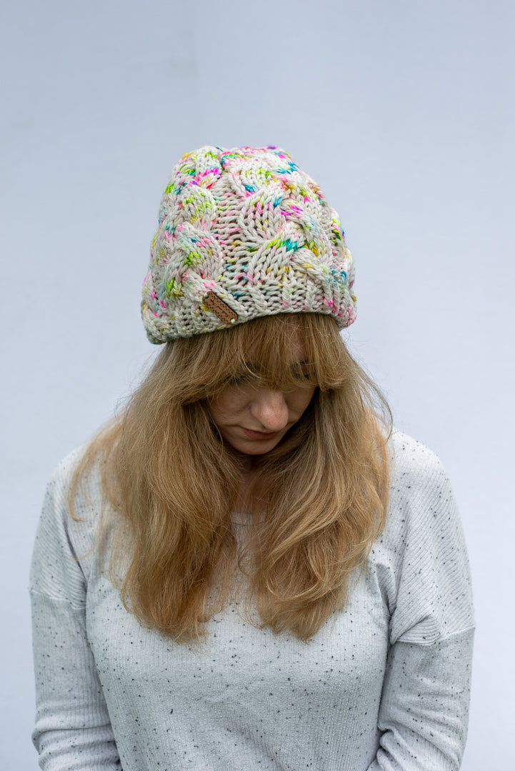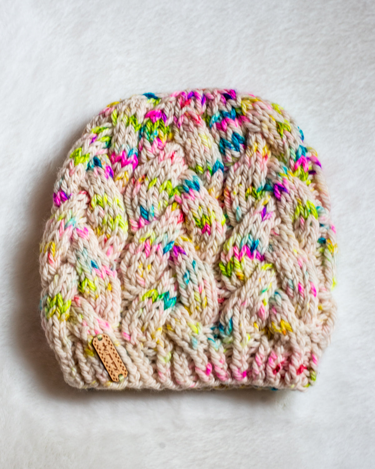All one of a kind hats are knit with hand dyed, 100% merino wool. Because of how the wool we use is dyed by hand, each skein is unique. Combined with the braided pattern, even if we use the same colorway, each hat is totally one of a kind.