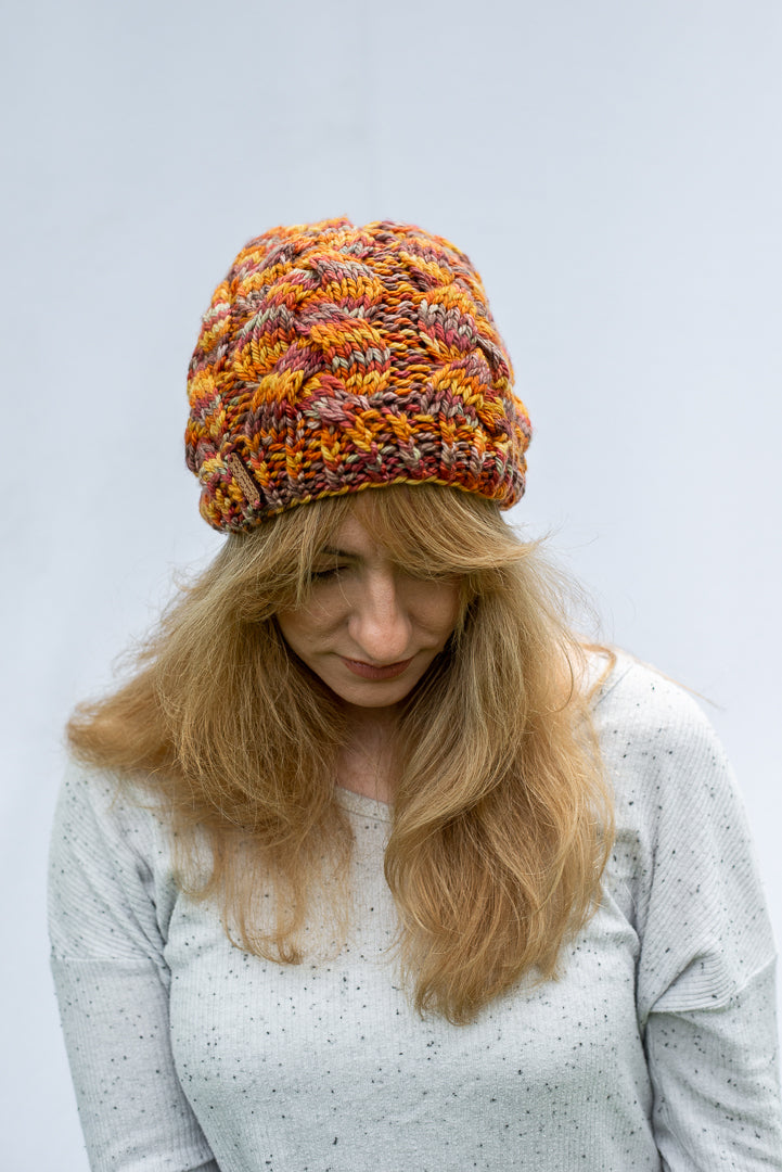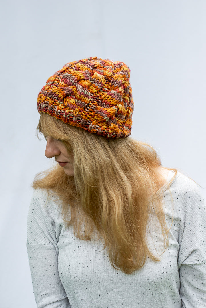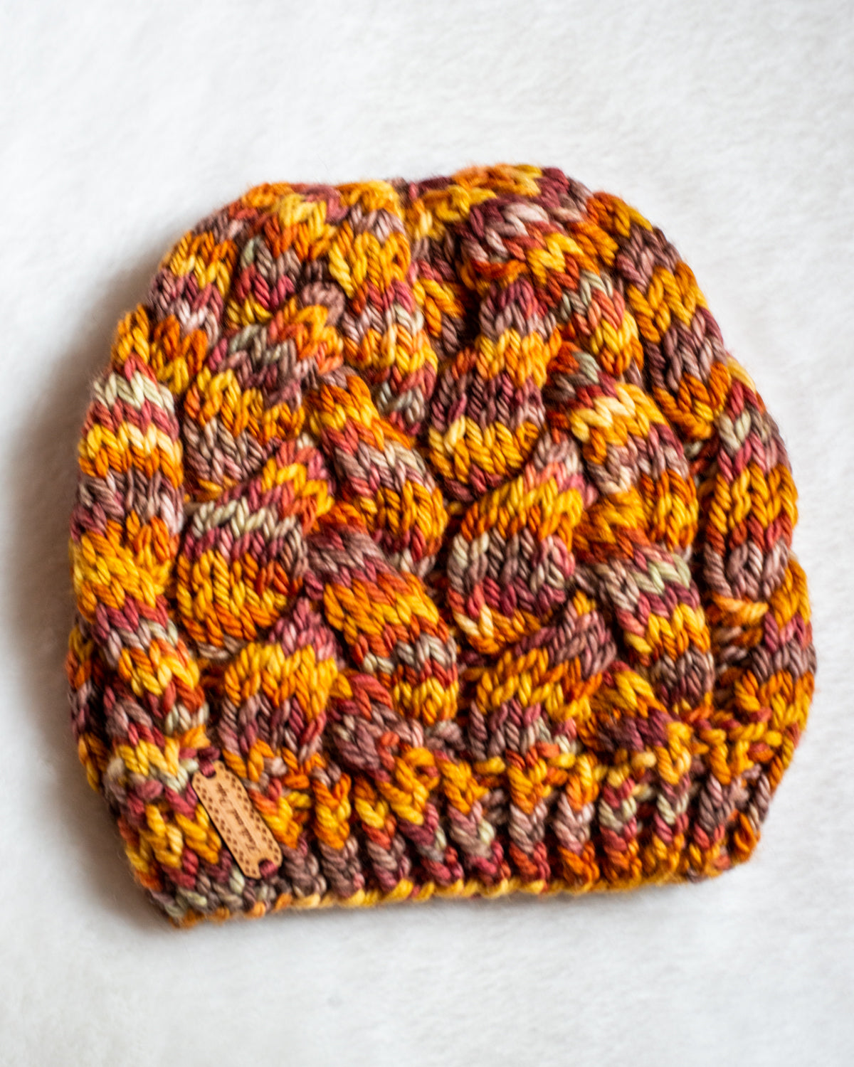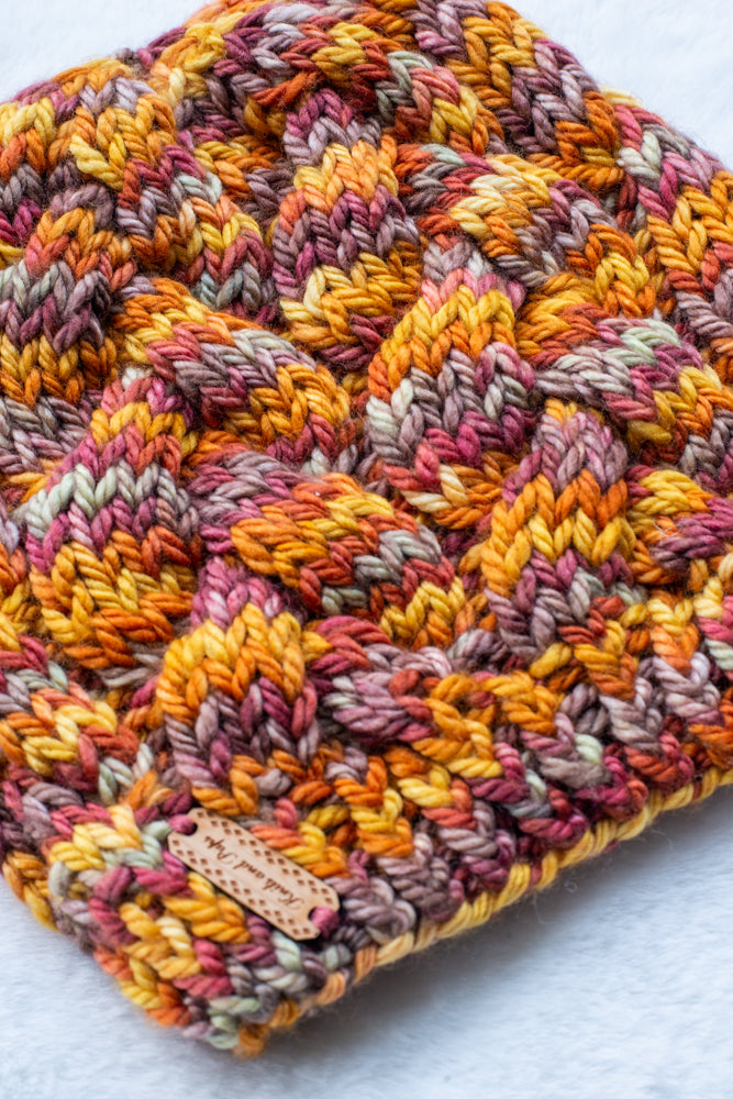 All one of a kind hats are knit with hand dyed, 100% merino wool. Because of how the wool we use is dyed by hand, each skein is unique. Combined with the braided pattern, even if we use the same colorway, each hat is totally one of a kind.