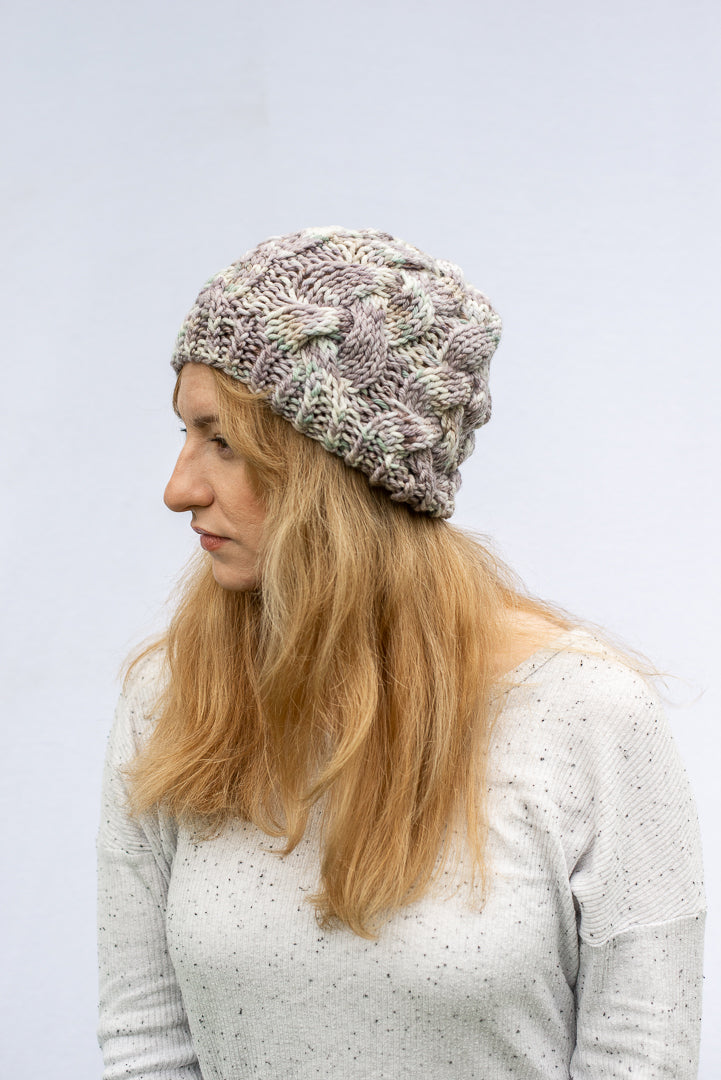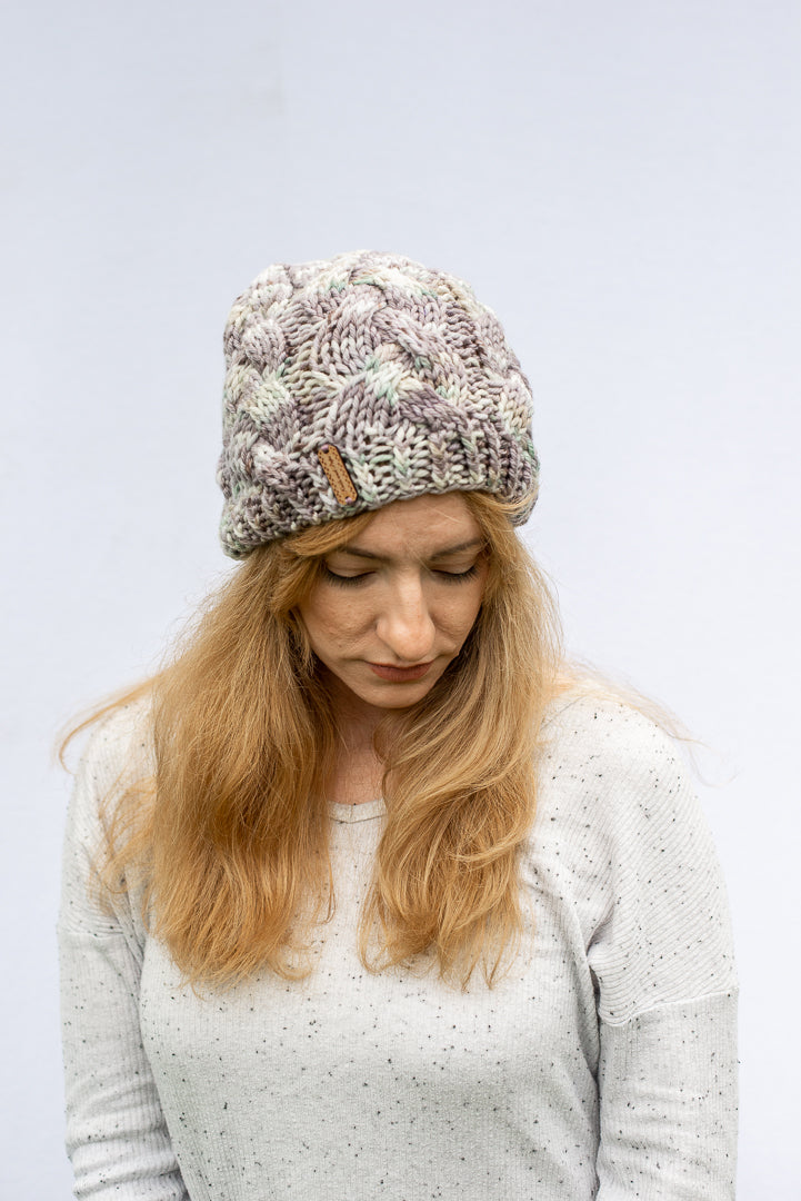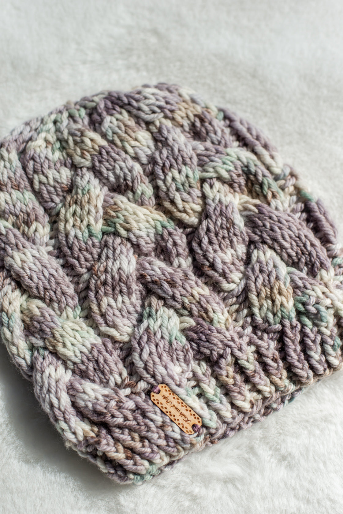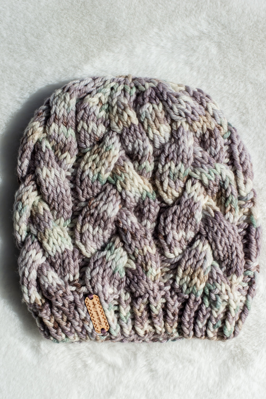 All one of a kind hats are knit with hand dyed, 100% merino wool. Because of how the wool we use is dyed by hand, each skein is unique. Combined with the braided pattern, even if we use the same colorway, each hat is totally one of a kind.