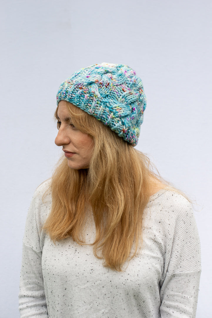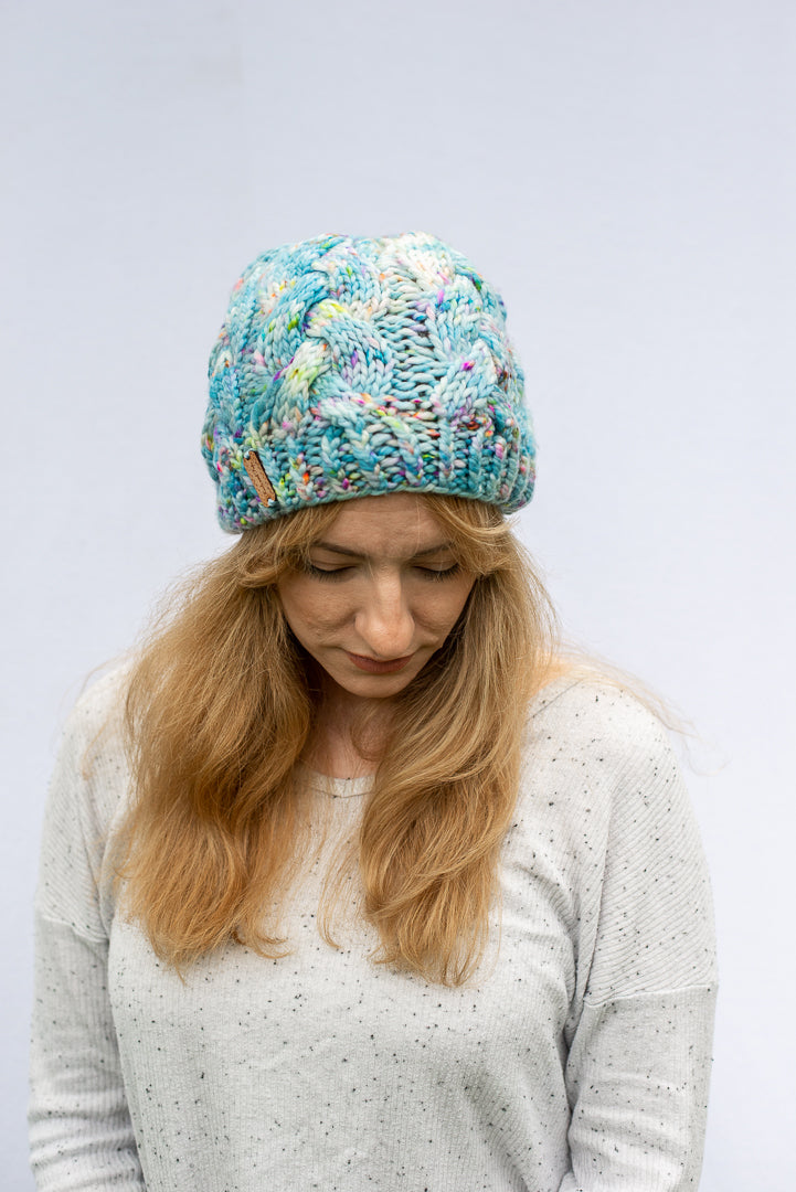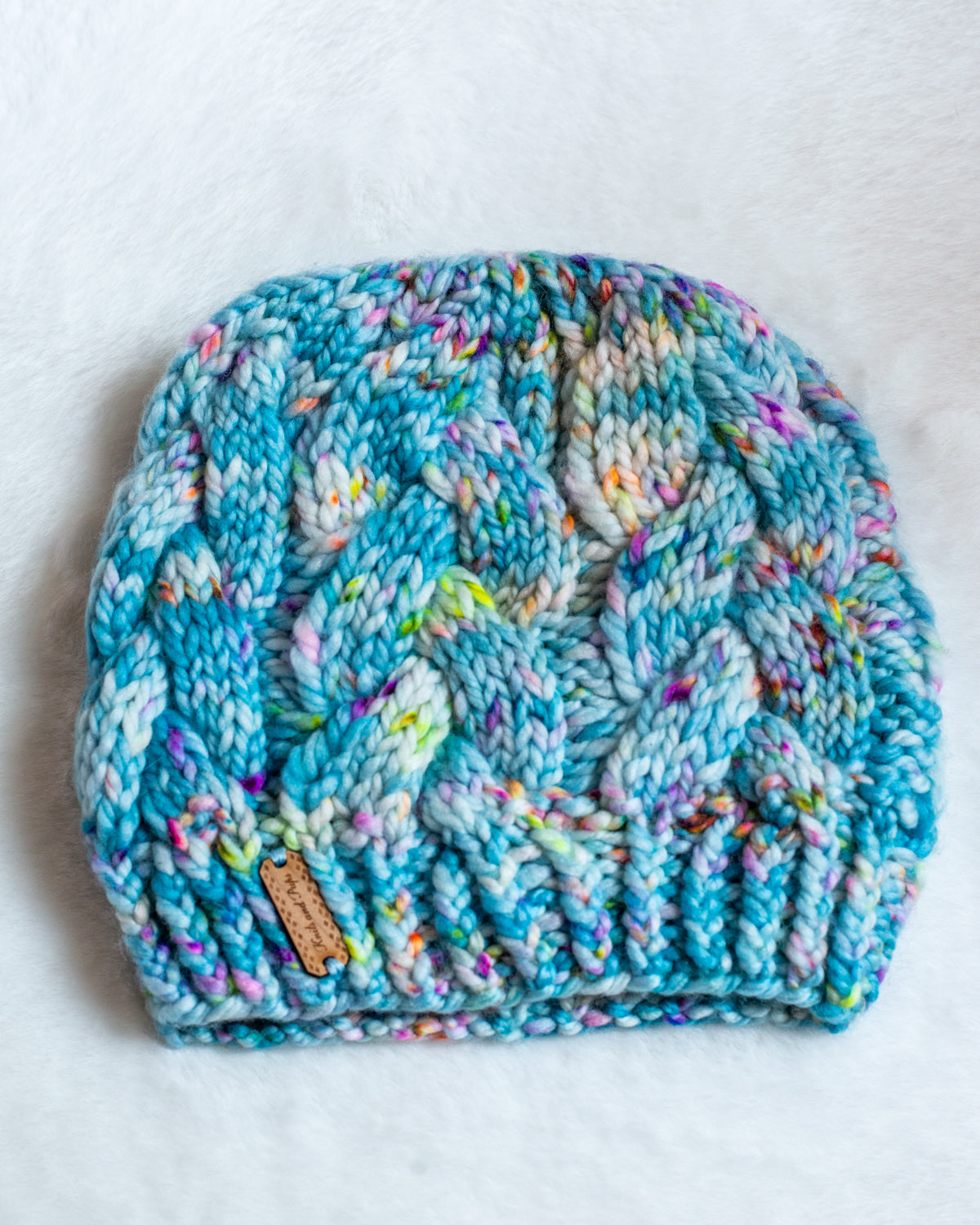 All one of a kind hats are knit with hand dyed, 100% merino wool. Because of how the wool we use is dyed by hand, each skein is unique. Combined with the braided pattern, even if we use the same colorway, each hat is totally one of a kind.