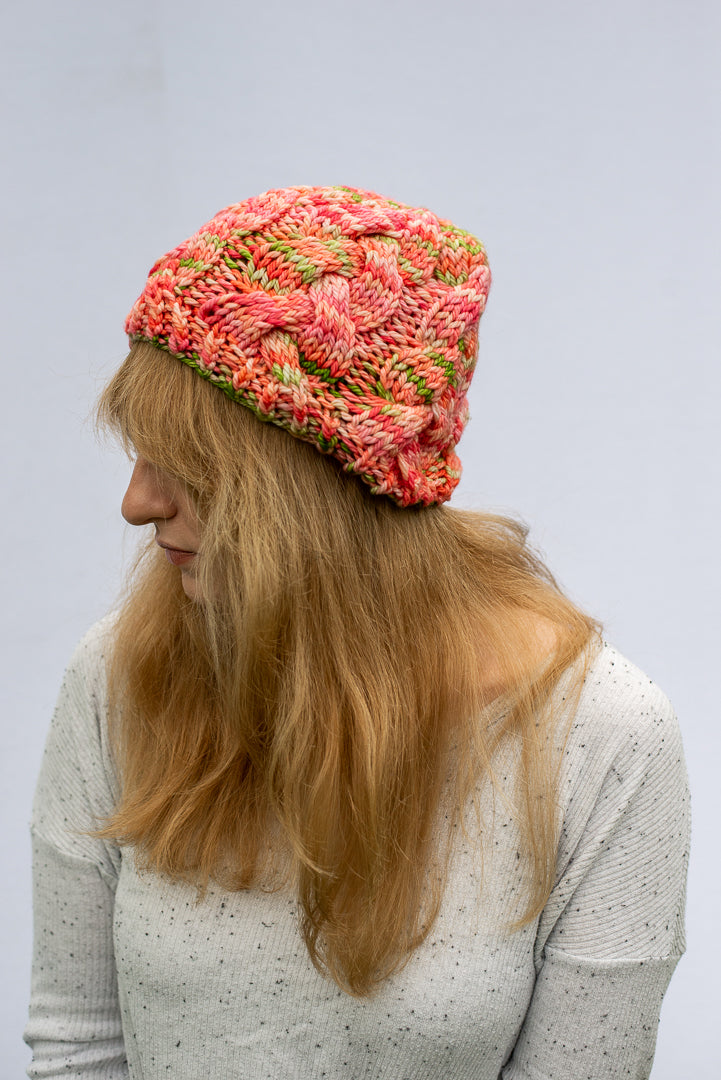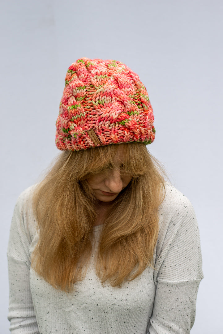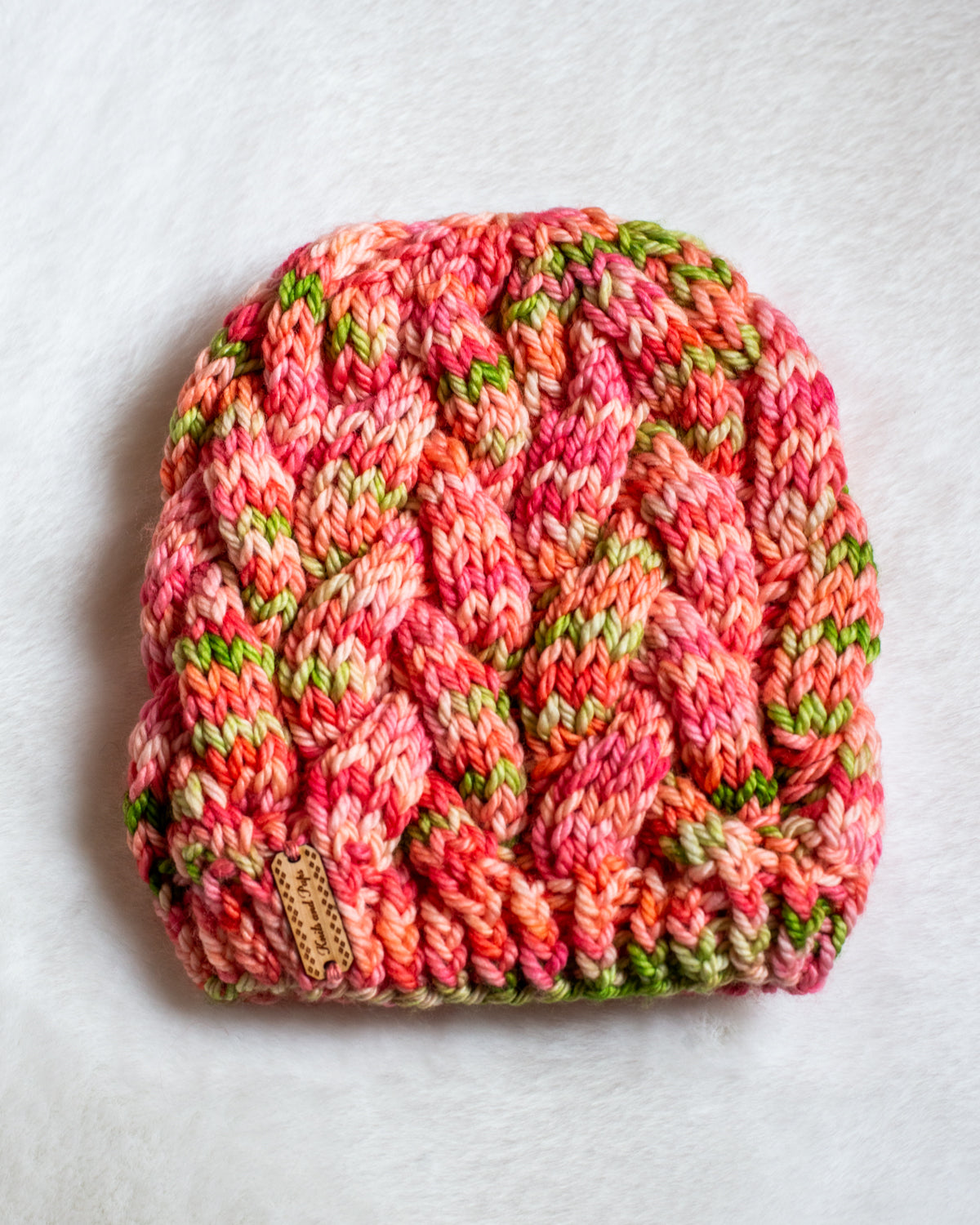 All one of a kind hats are knit with hand dyed, 100% merino wool. Because of how the wool we use is dyed by hand, each skein is unique. Combined with the braided pattern, even if we use the same colorway, each hat is totally one of a kind.