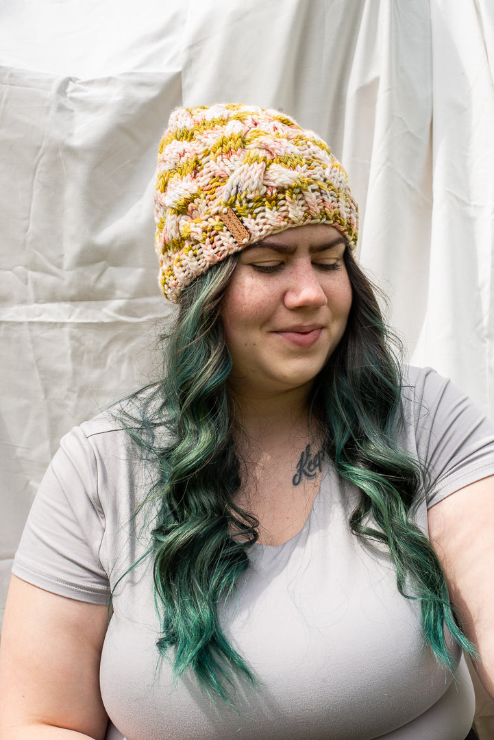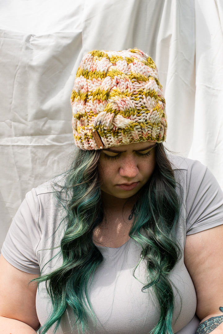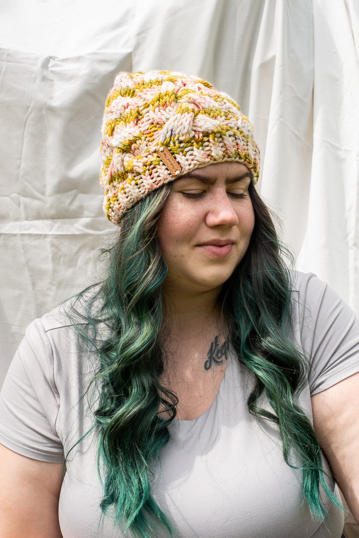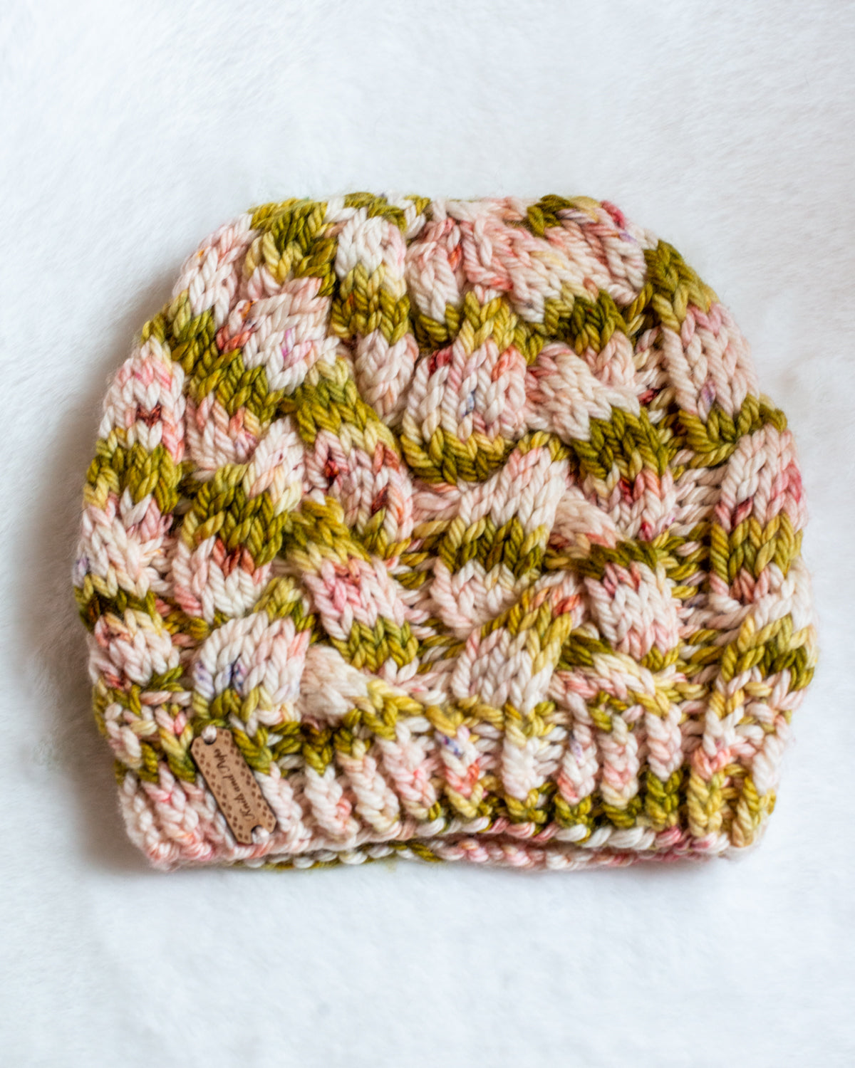 All one of a kind hats are knit with hand dyed, 100% merino wool. Because of how the wool we use is dyed by hand, each skein is unique. Combined with the braided pattern, even if we use the same colorway, each hat is totally one of a kind.