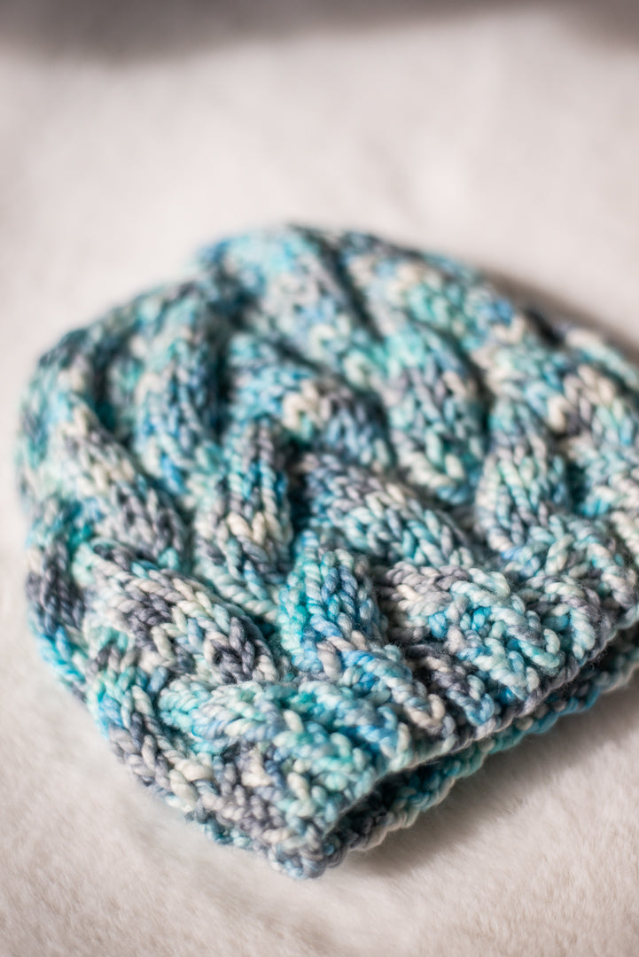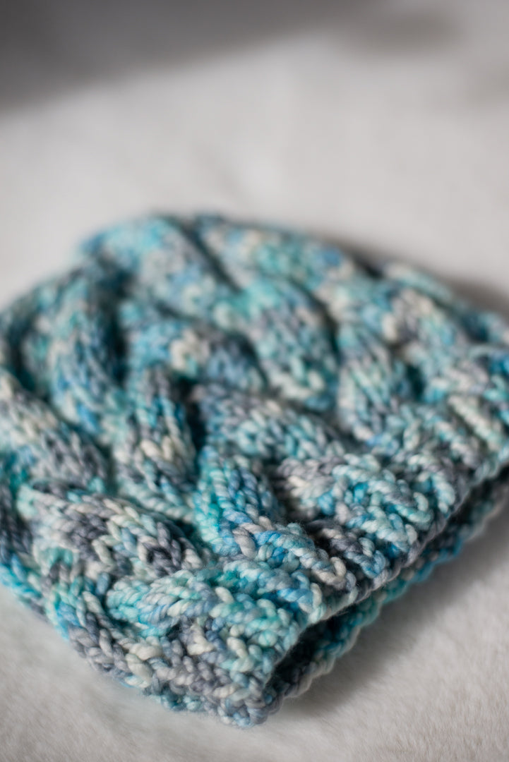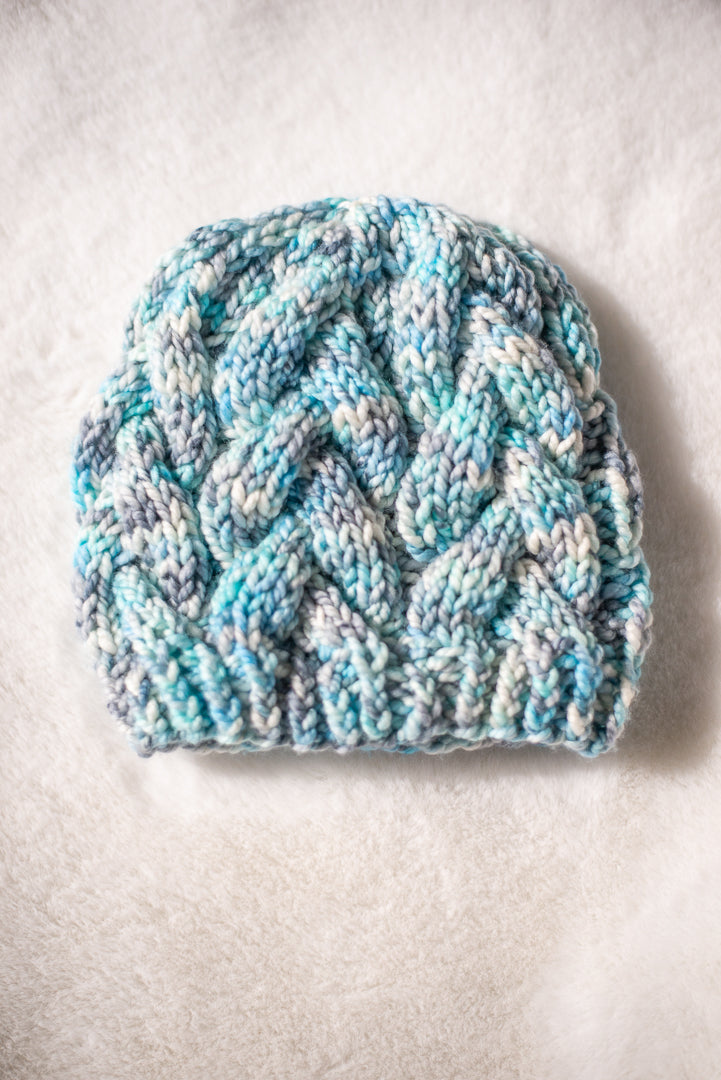 All one of a kind hats are knit with hand dyed, 100% merino wool. Because of how the wool we use is dyed by hand, each skein is unique. Combined with the braided pattern, even if we use the same colorway, each hat is totally one of a kind.