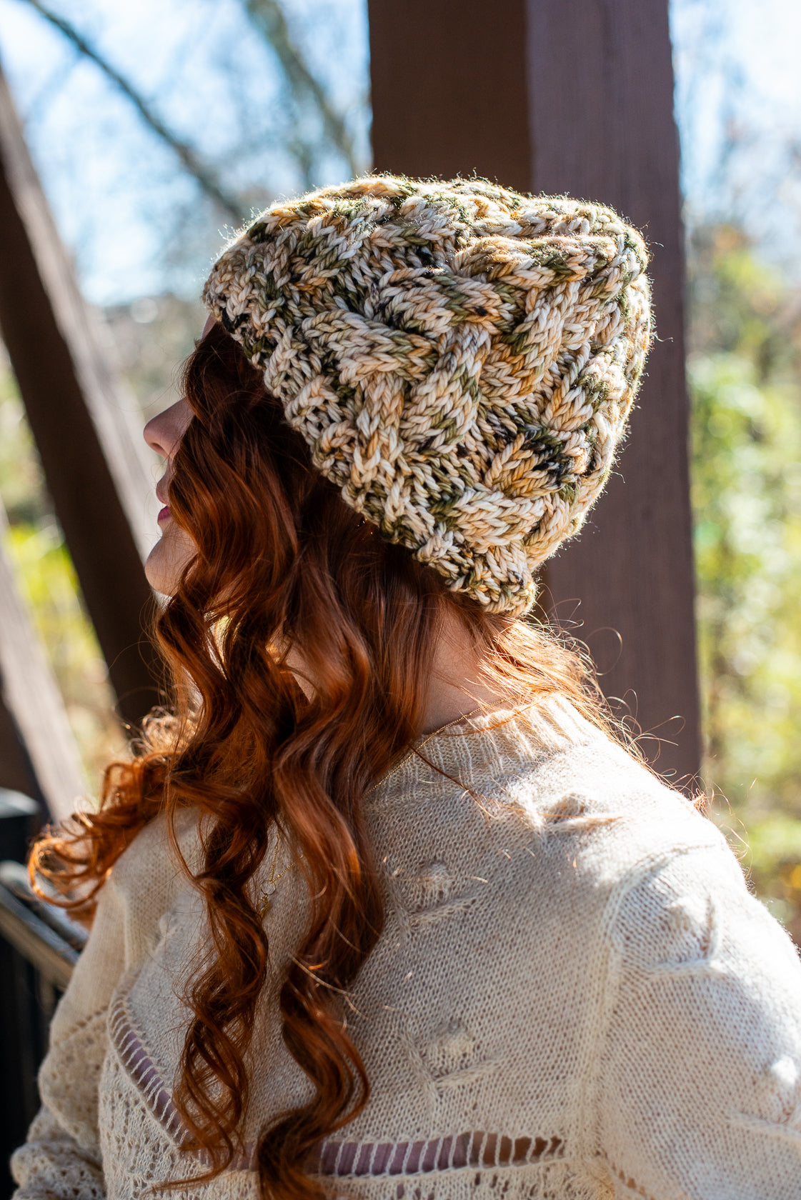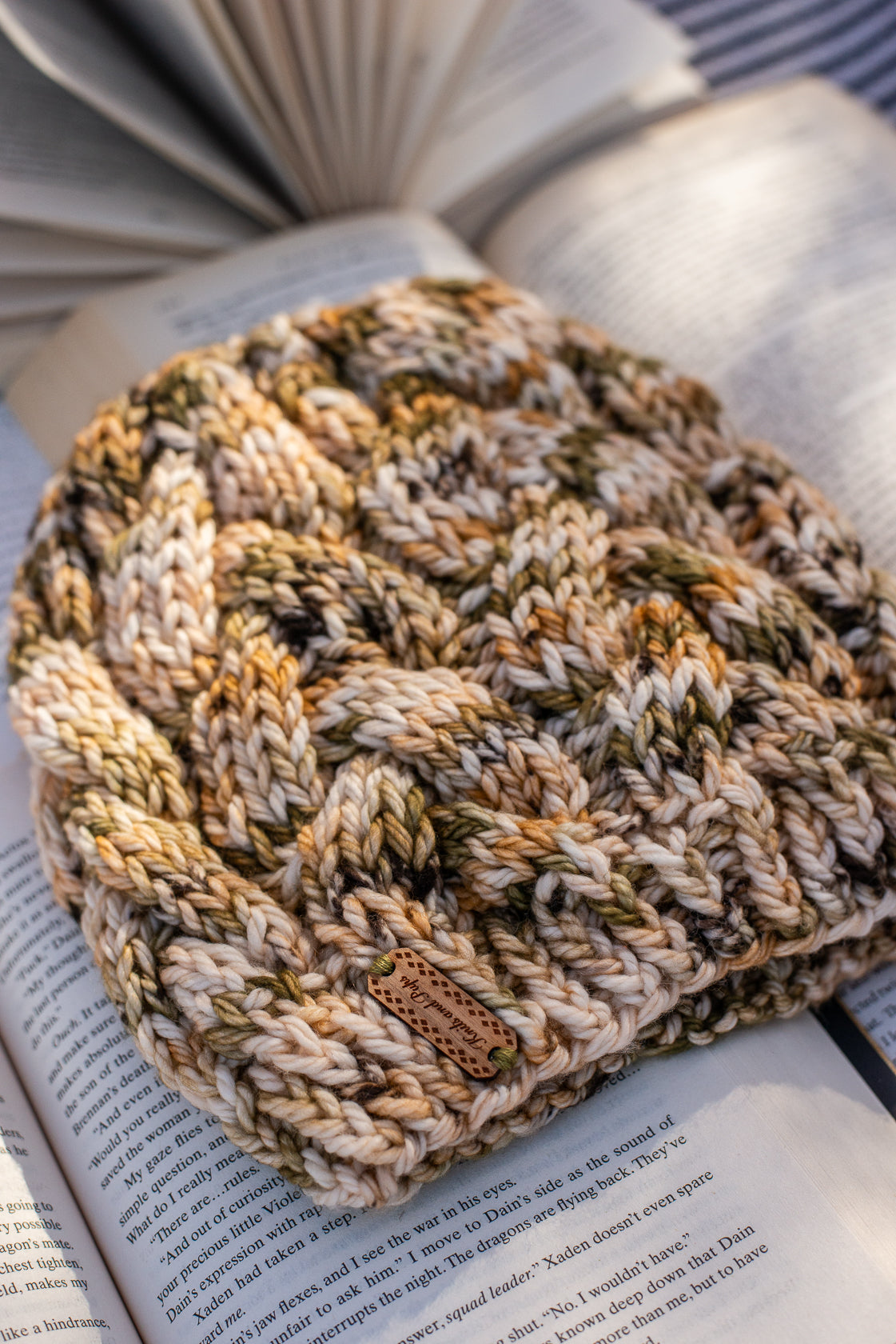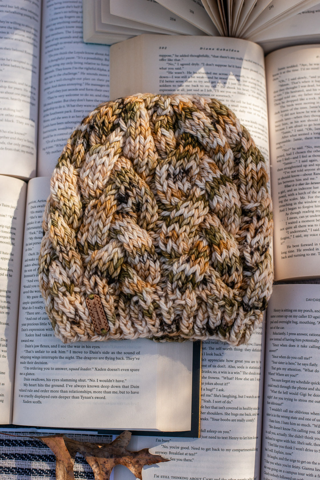 All one of a kind hats are knit with hand dyed, 100% merino wool. Because of how the wool we use is dyed by hand, each skein is unique. Combined with the braided pattern, even if we use the same colorway, each hat is totally one of a kind.