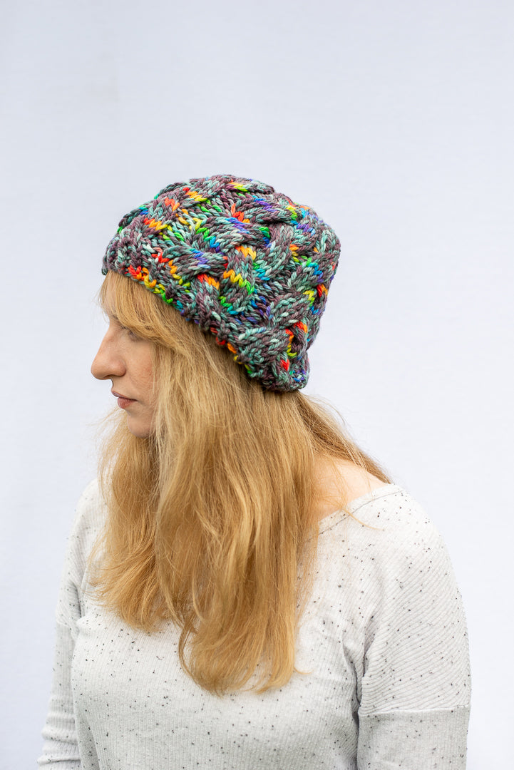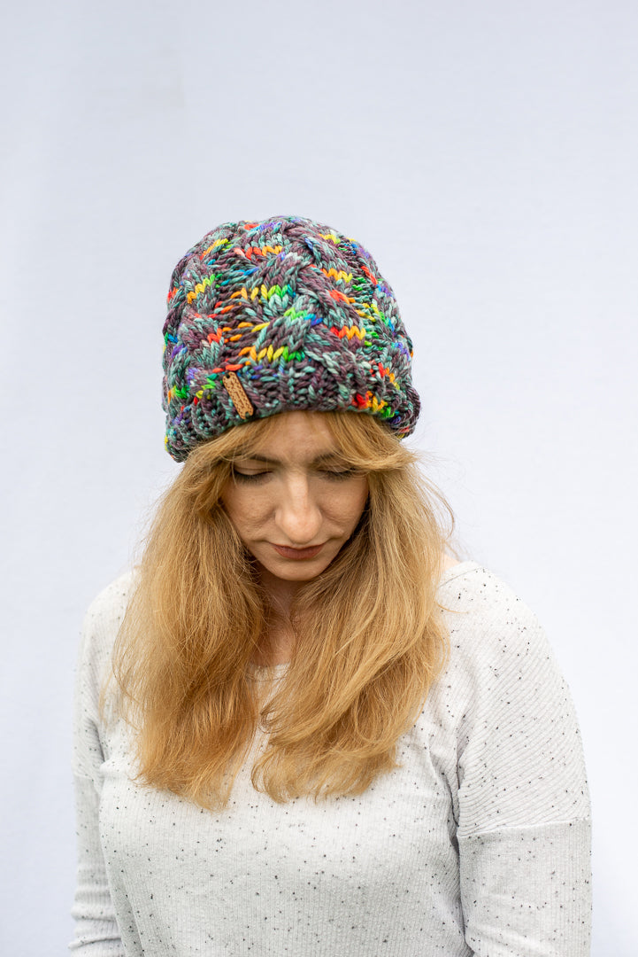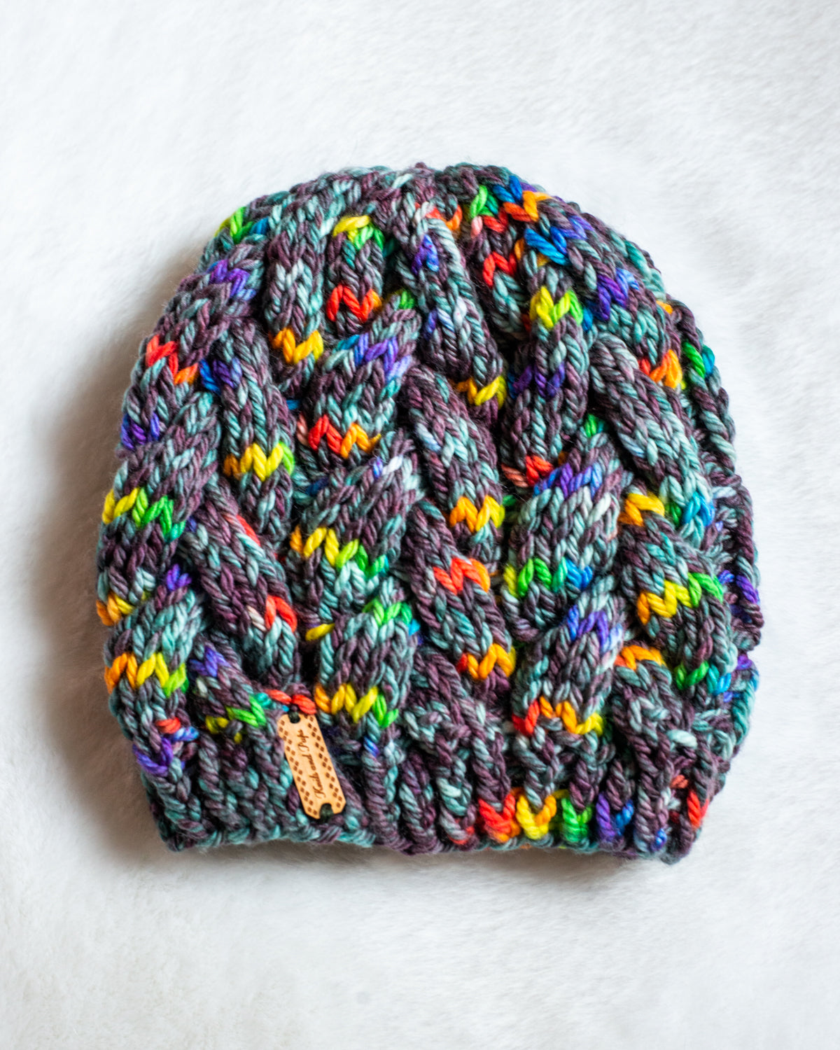 All one of a kind hats are knit with hand dyed, 100% merino wool. Because of how the wool we use is dyed by hand, each skein is unique. Combined with the braided pattern, even if we use the same colorway, each hat is totally one of a kind.