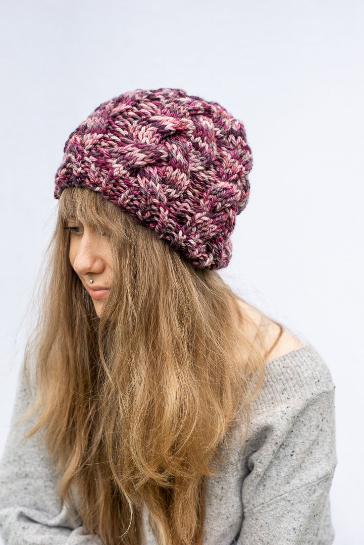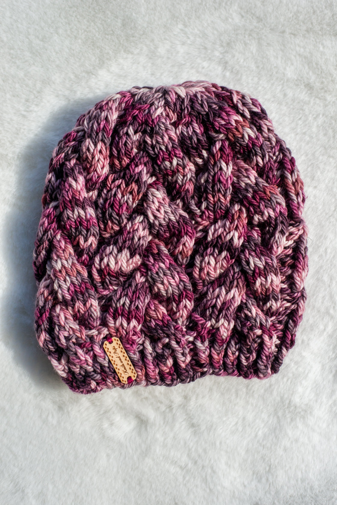All one of a kind hats are knit with hand dyed, 100% merino wool. Because of how the wool we use is dyed by hand, each skein is unique. Combined with the braided pattern, even if we use the same colorway, each hat is totally one of a kind.