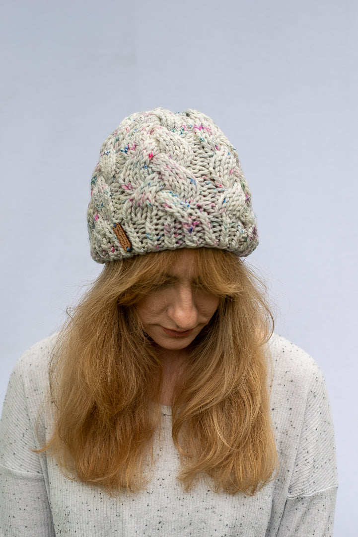 All one of a kind hats are knit with hand dyed, 100% merino wool. Because of how the wool we use is dyed by hand, each skein is unique. Combined with the braided pattern, even if we use the same colorway, each hat is totally one of a kind.