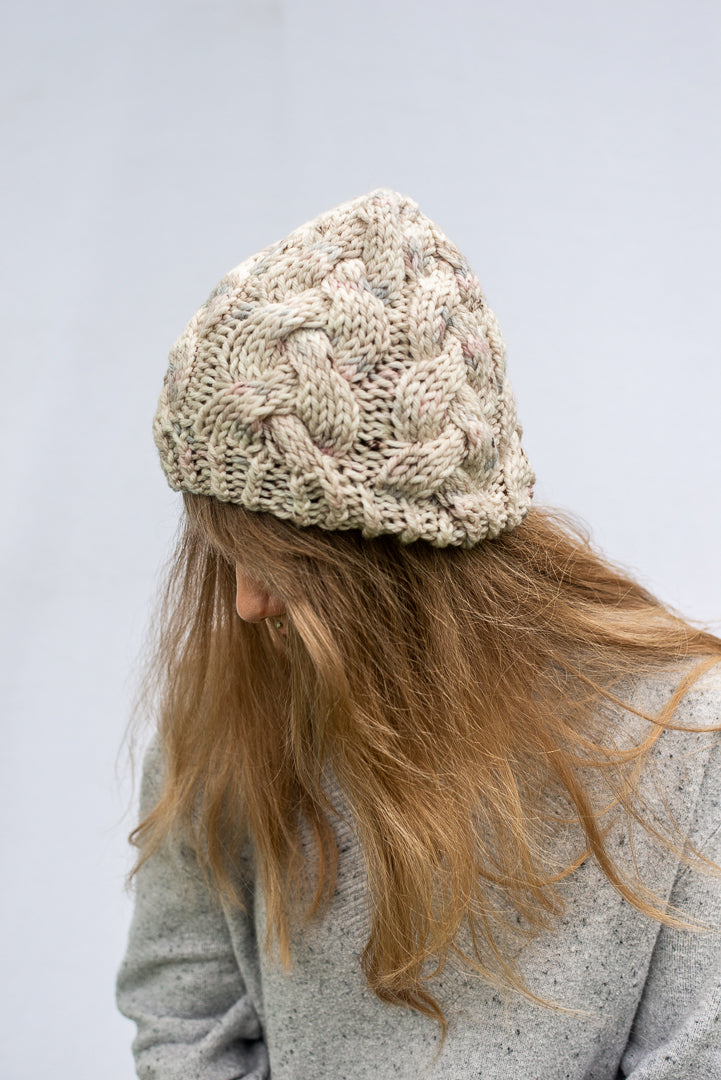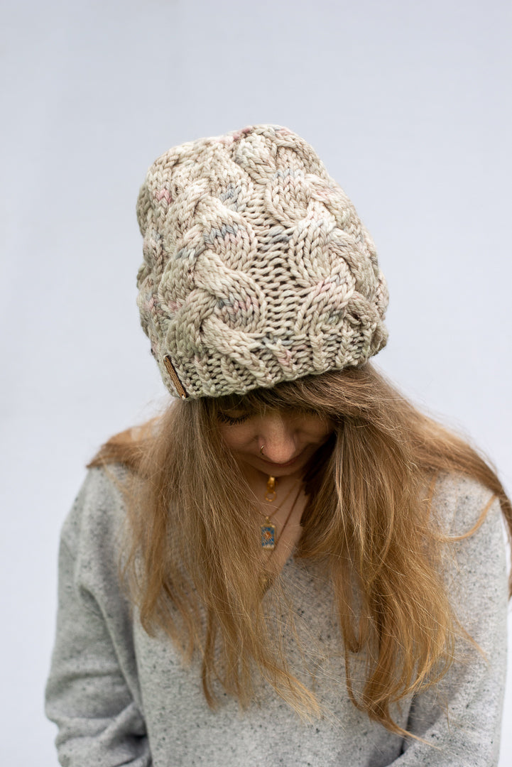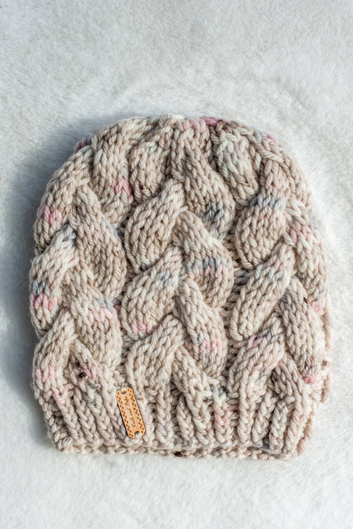 All one of a kind hats are knit with hand dyed, 100% merino wool. Because of how the wool we use is dyed by hand, each skein is unique. Combined with the braided pattern, even if we use the same colorway, each hat is totally one of a kind.