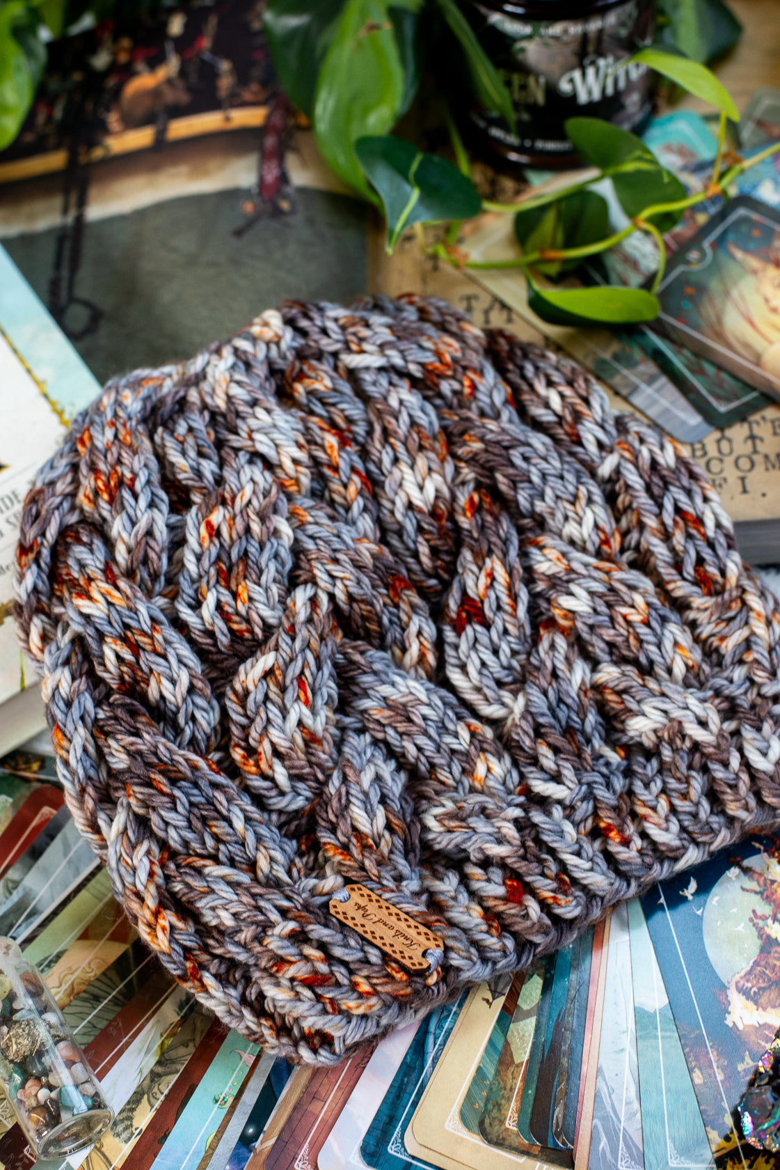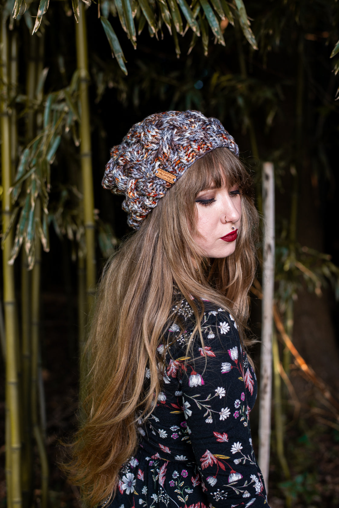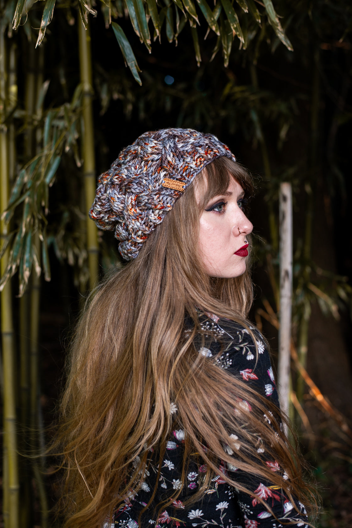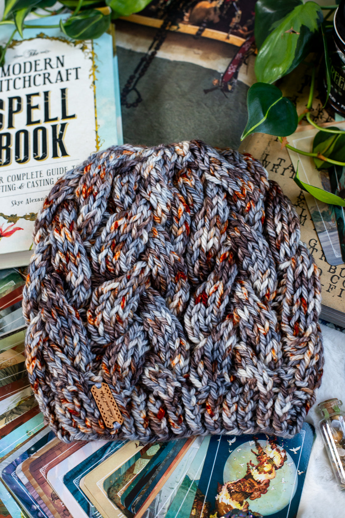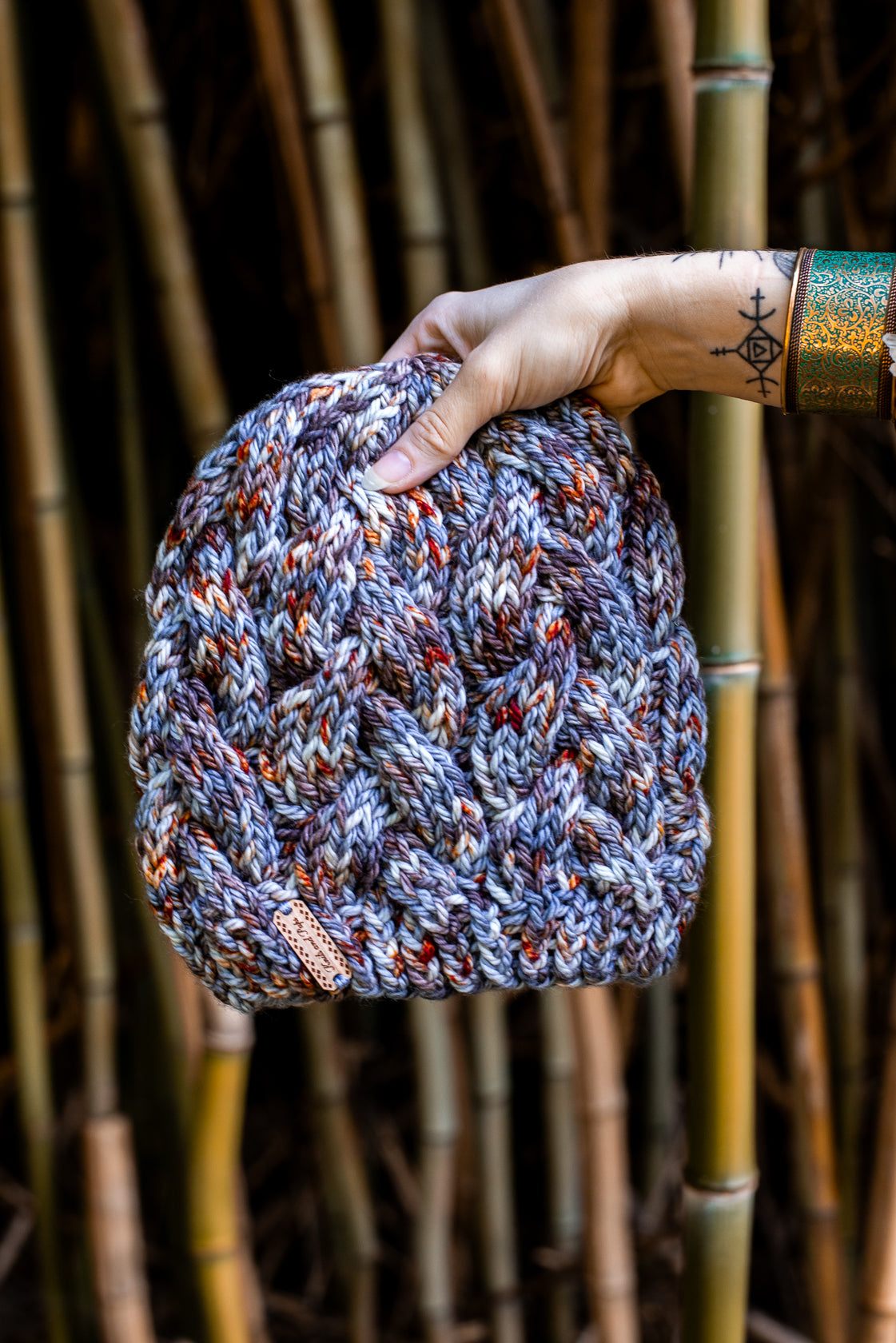 All one of a kind hats are knit with hand dyed, 100% merino wool. Because of how the wool we use is dyed by hand, each skein is unique. Combined with the braided pattern, even if we use the same colorway, each hat is totally one of a kind.