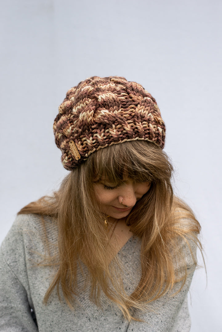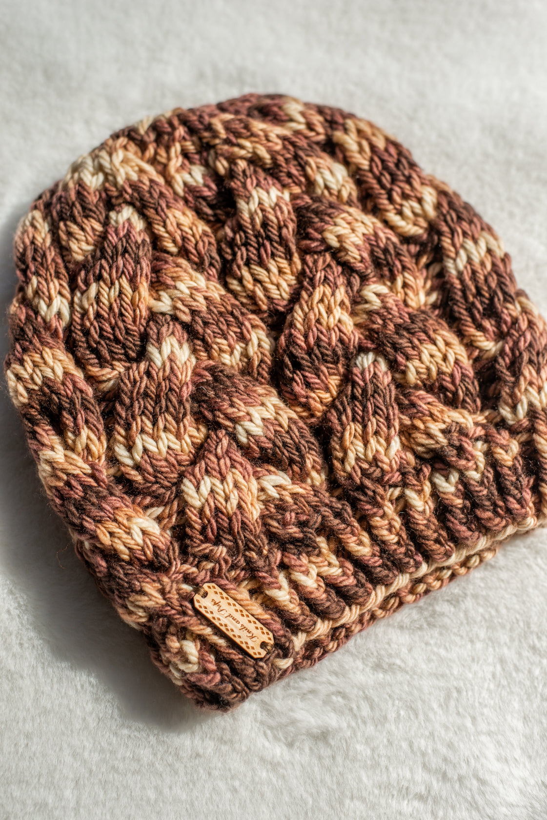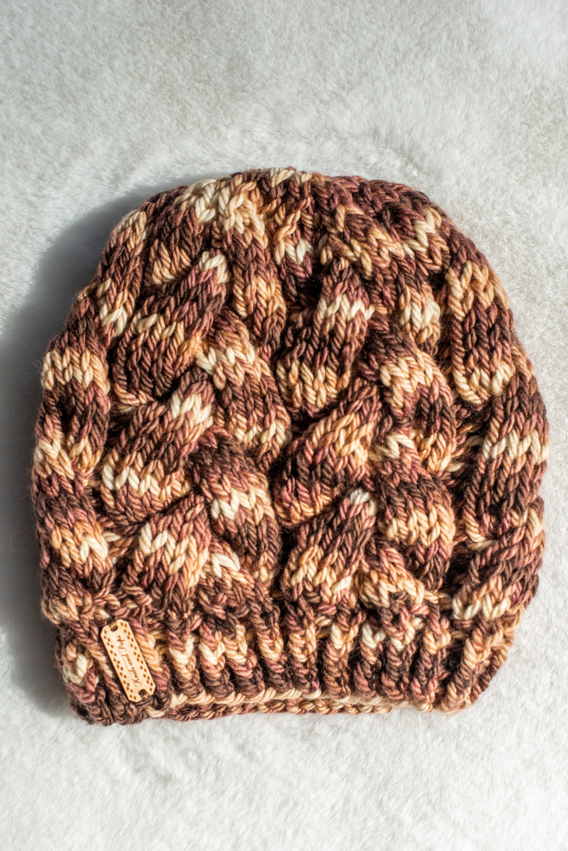 All one of a kind hats are knit with hand dyed, 100% merino wool. Because of how the wool we use is dyed by hand, each skein is unique. Combined with the braided pattern, even if we use the same colorway, each hat is totally one of a kind.