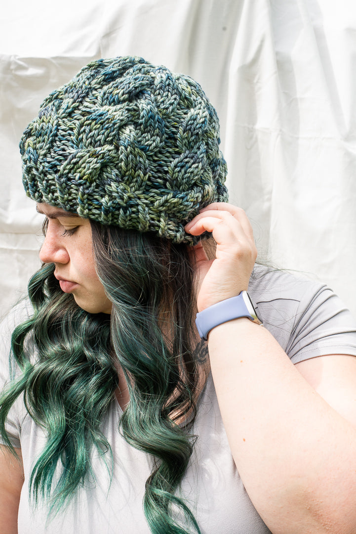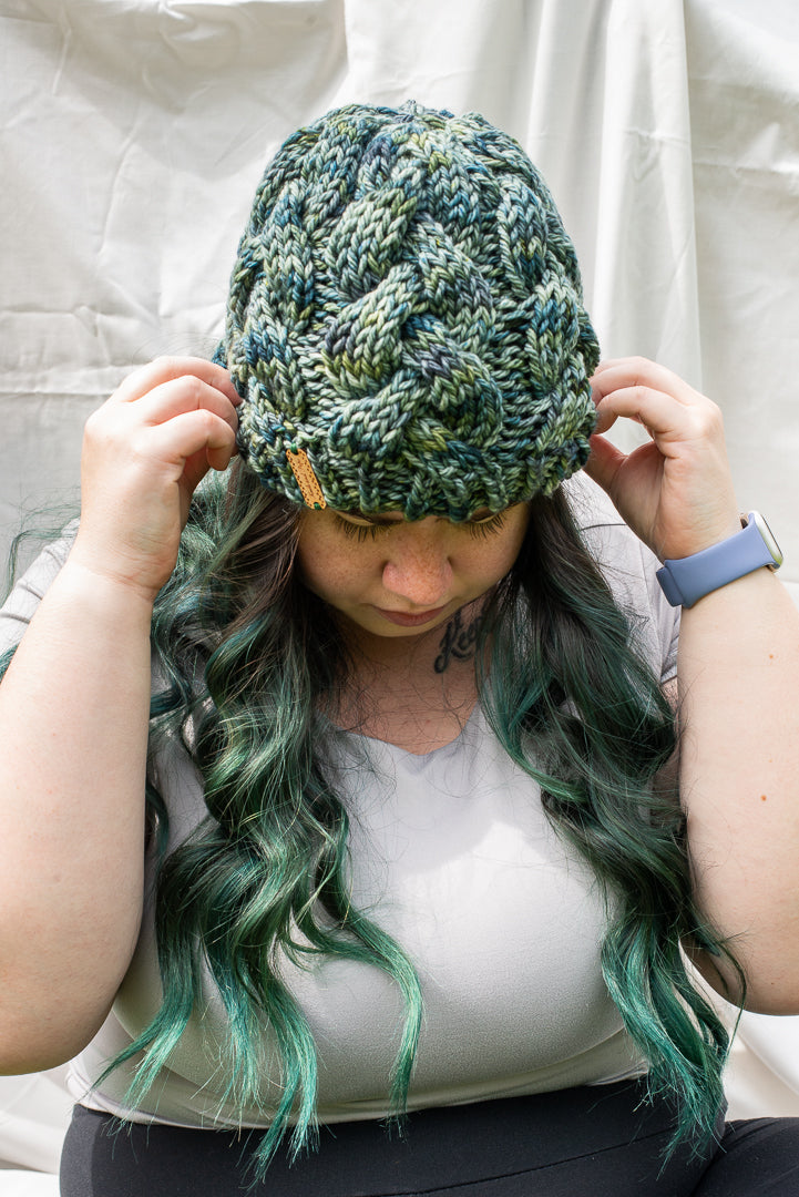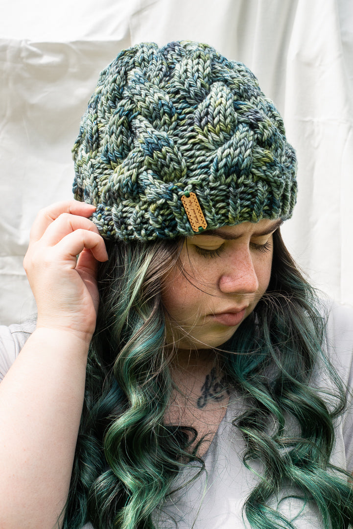 All one of a kind hats are knit with hand dyed, 100% merino wool. Because of how the wool we use is dyed by hand, each skein is unique. Combined with the braided pattern, even if we use the same colorway, each hat is totally one of a kind.