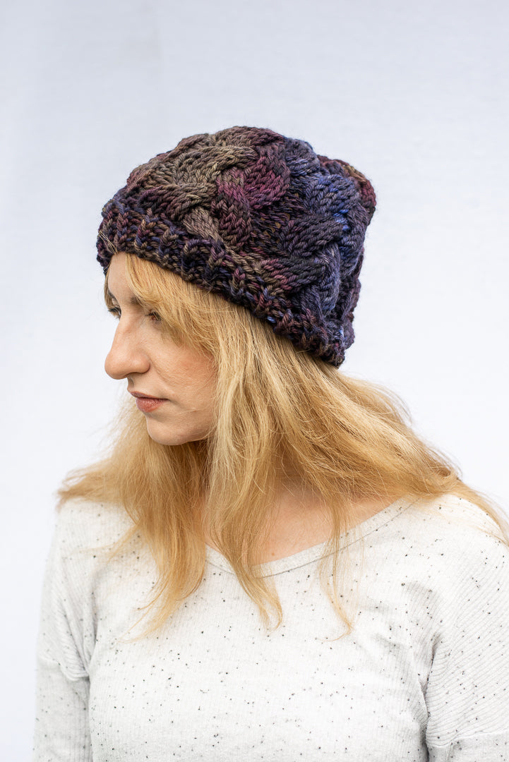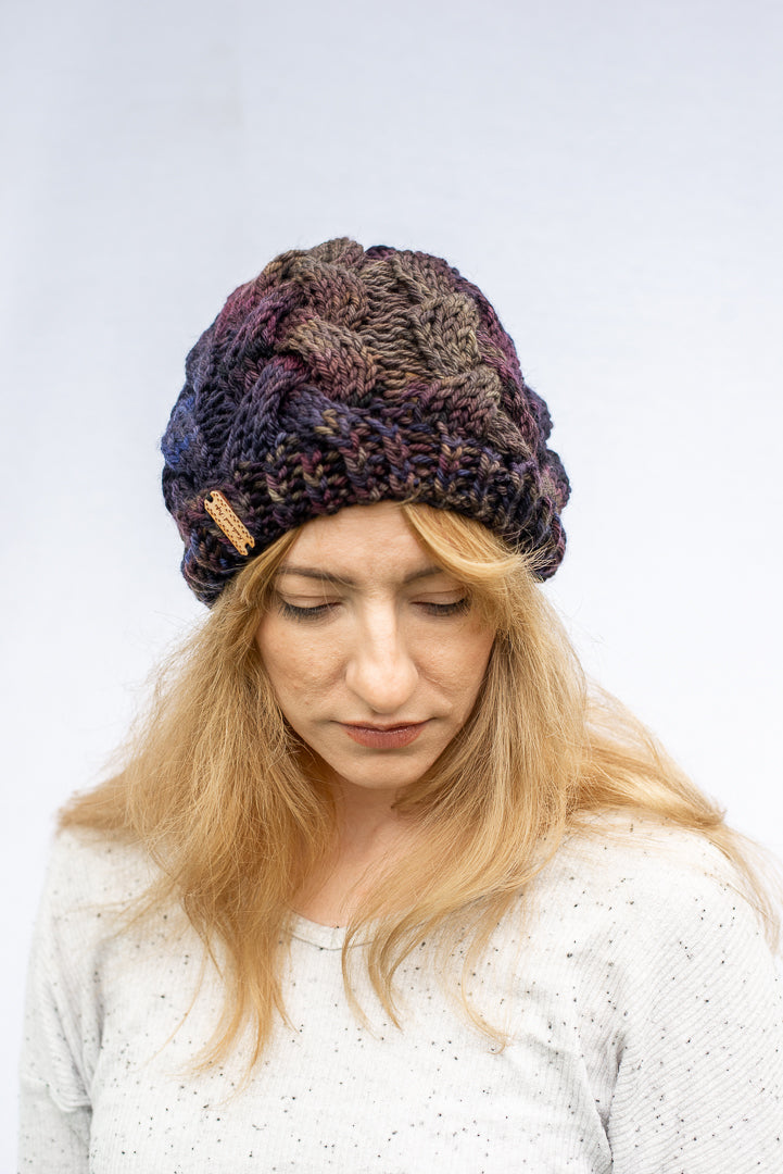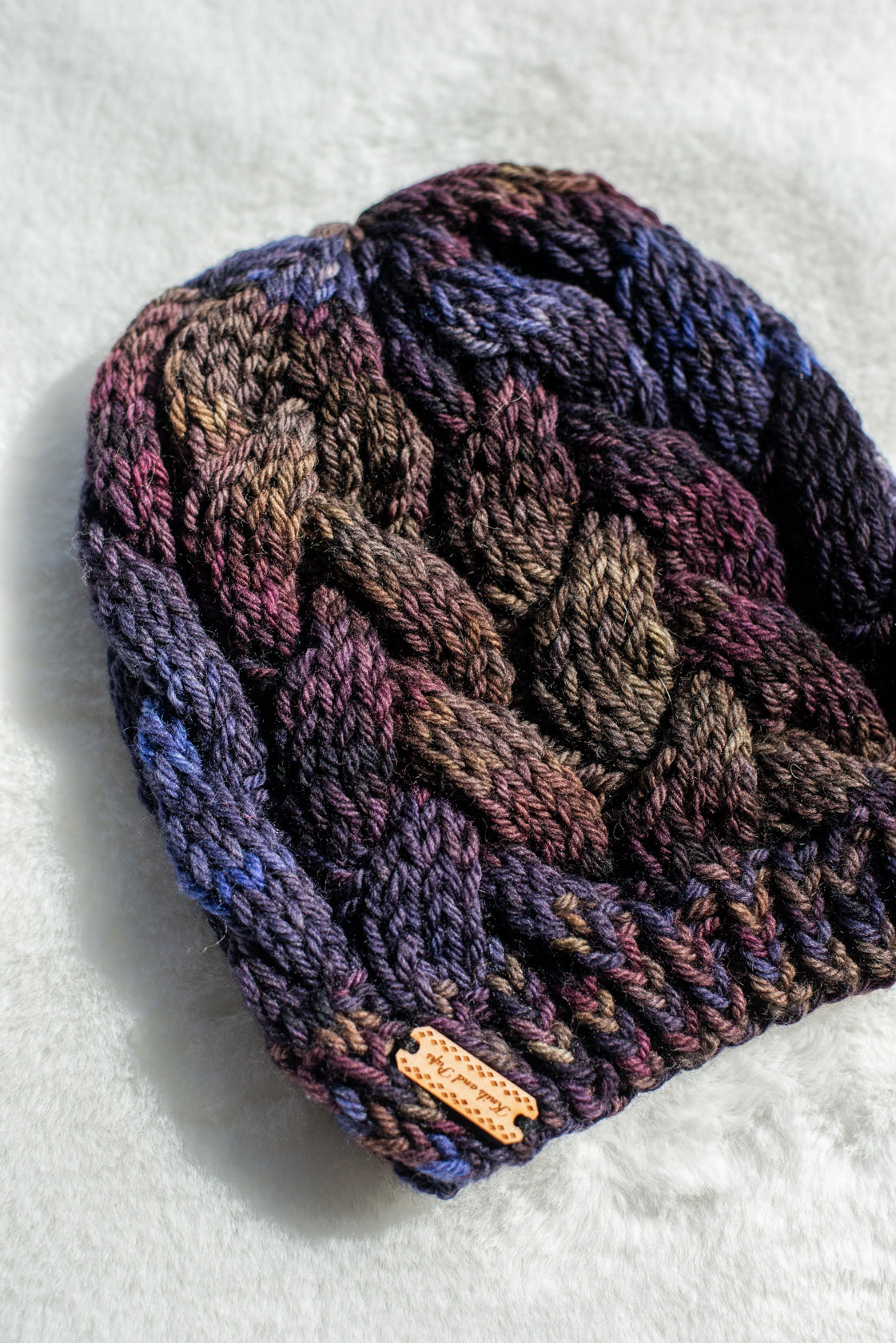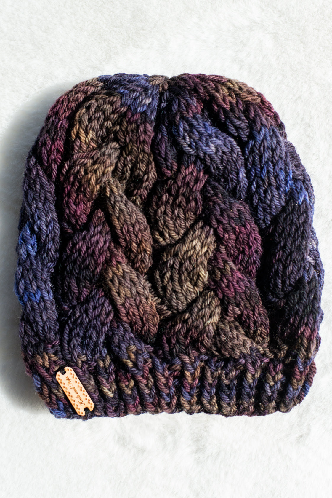 All one of a kind hats are knit with hand dyed, 100% merino wool. Because of how the wool we use is dyed by hand, each skein is unique. Combined with the braided pattern, even if we use the same colorway, each hat is totally one of a kind.