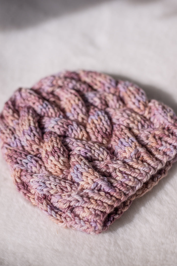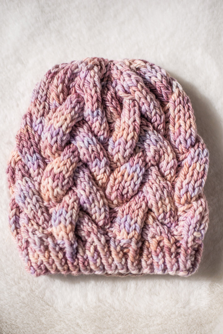 All one of a kind hats are knit with hand dyed, 100% merino wool. Because of how the wool we use is dyed by hand, each skein is unique. Combined with the braided pattern, even if we use the same colorway, each hat is totally one of a kind.