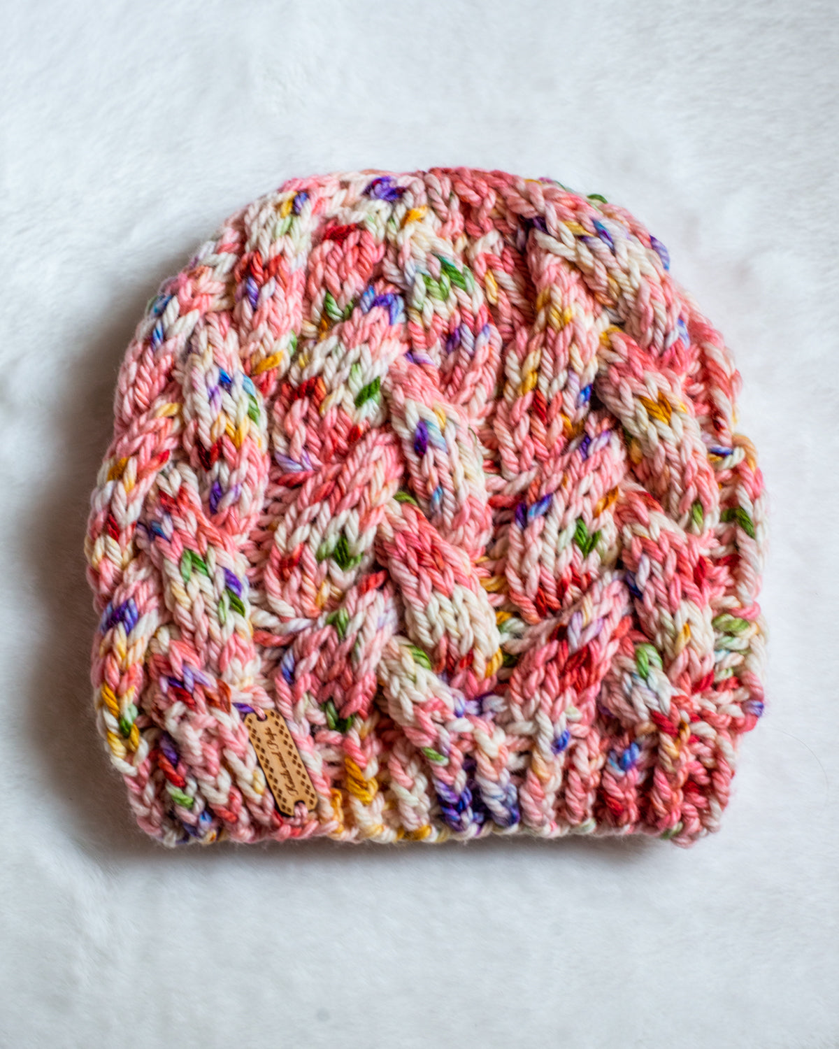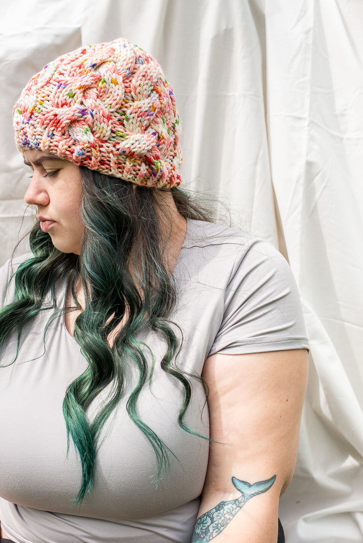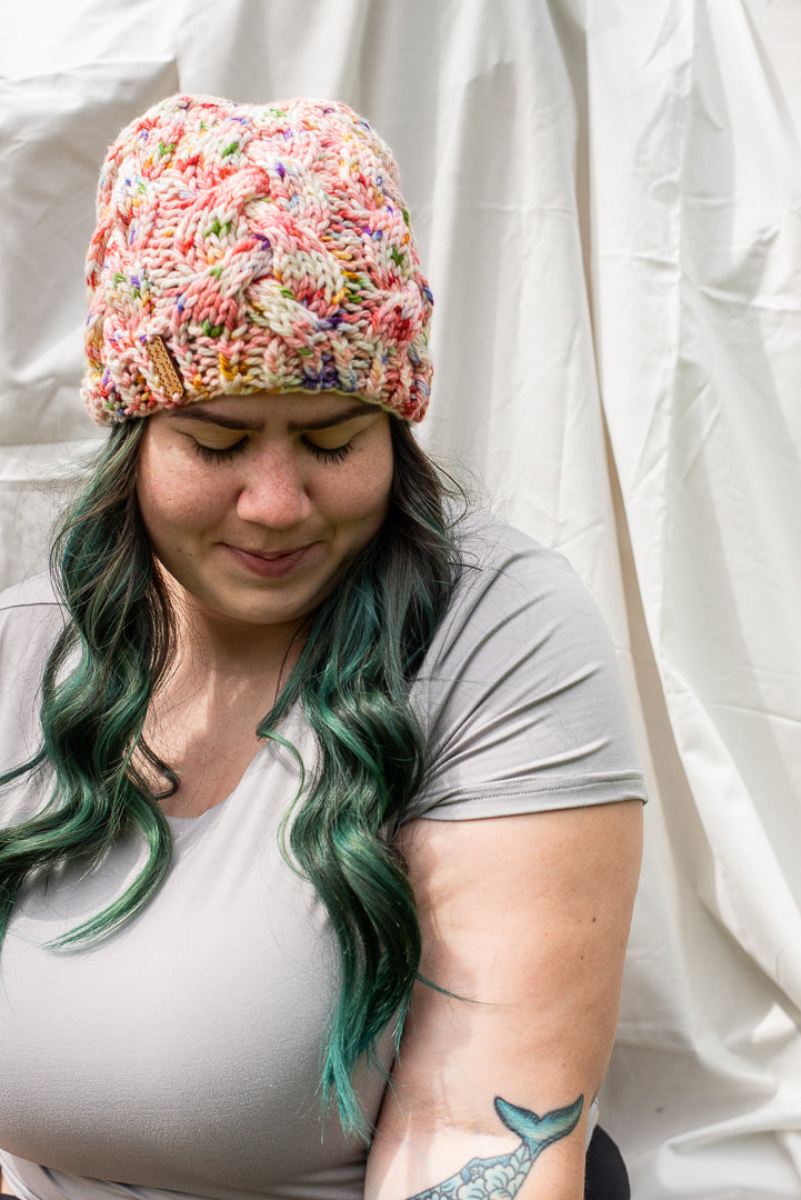 All one of a kind hats are knit with hand dyed, 100% merino wool. Because of how the wool we use is dyed by hand, each skein is unique. Combined with the braided pattern, even if we use the same colorway, each hat is totally one of a kind.