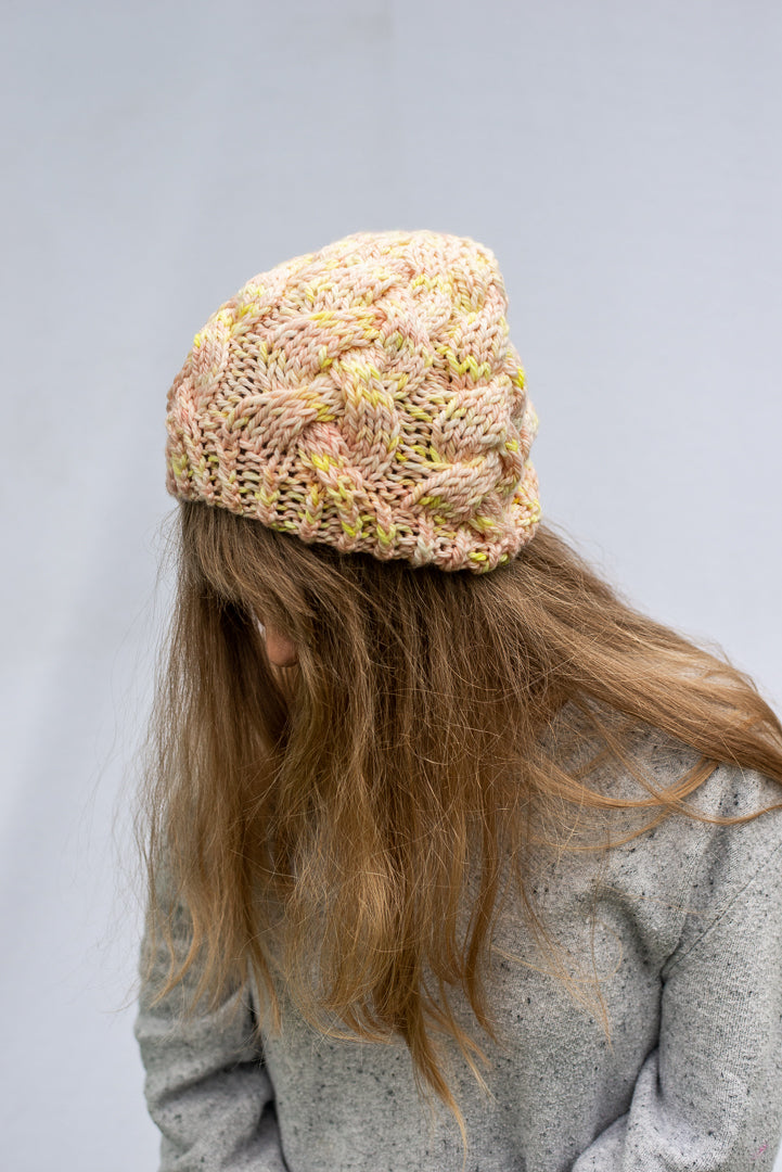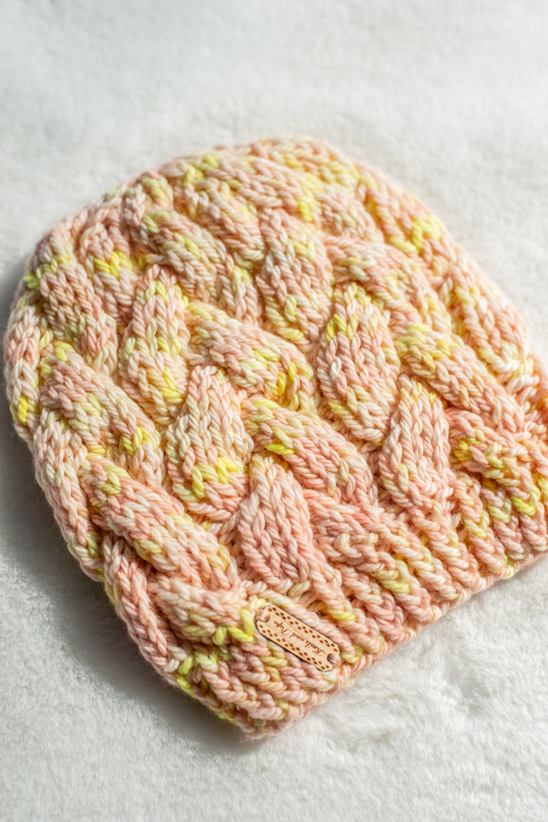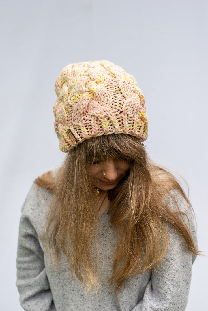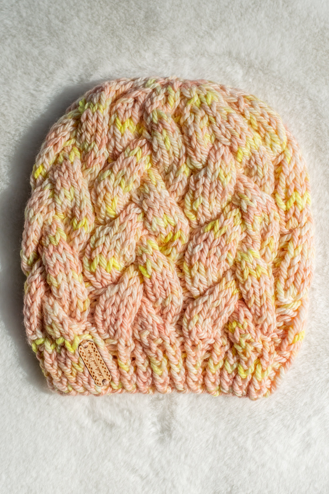 All one of a kind hats are knit with hand dyed, 100% merino wool. Because of how the wool we use is dyed by hand, each skein is unique. Combined with the braided pattern, even if we use the same colorway, each hat is totally one of a kind.