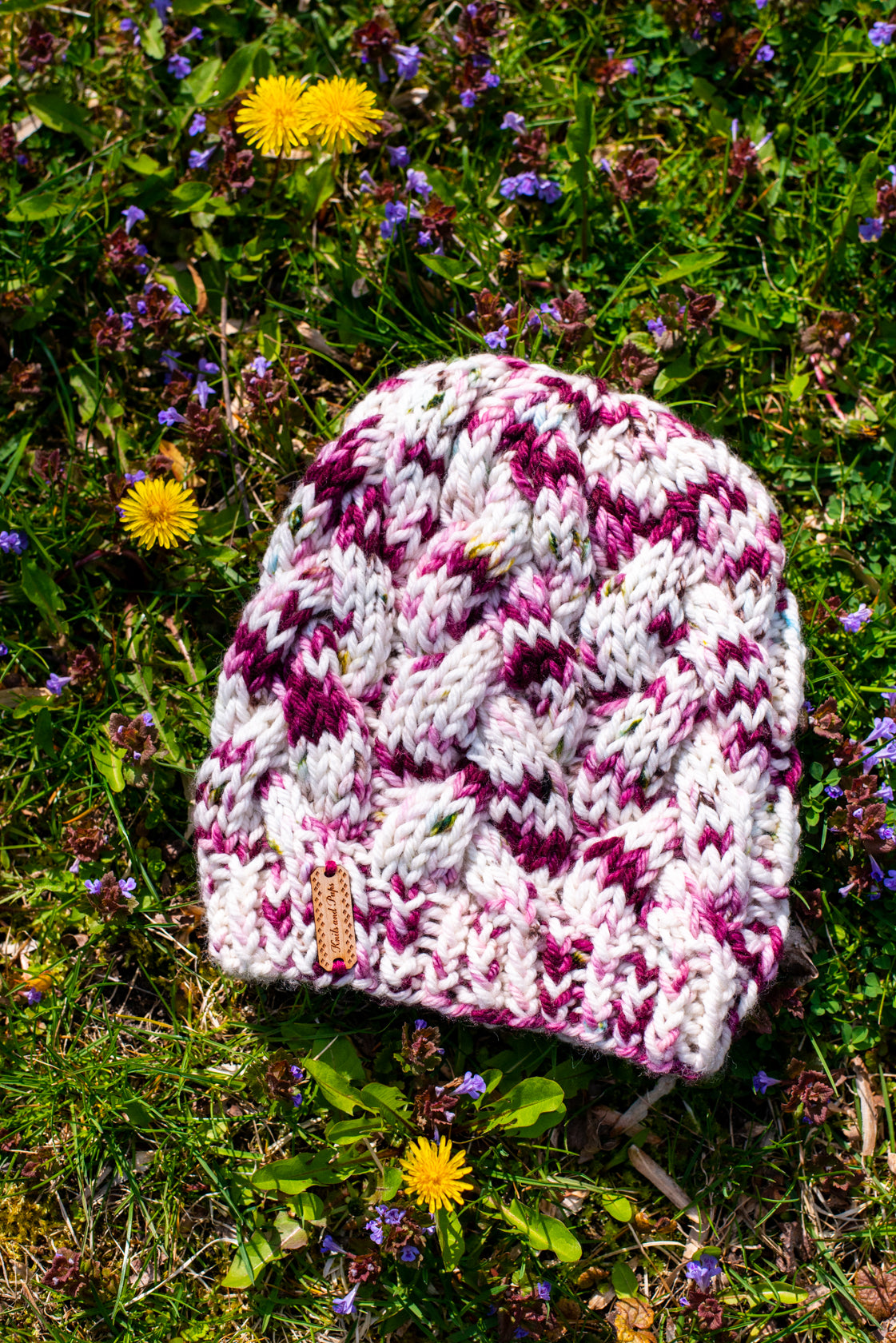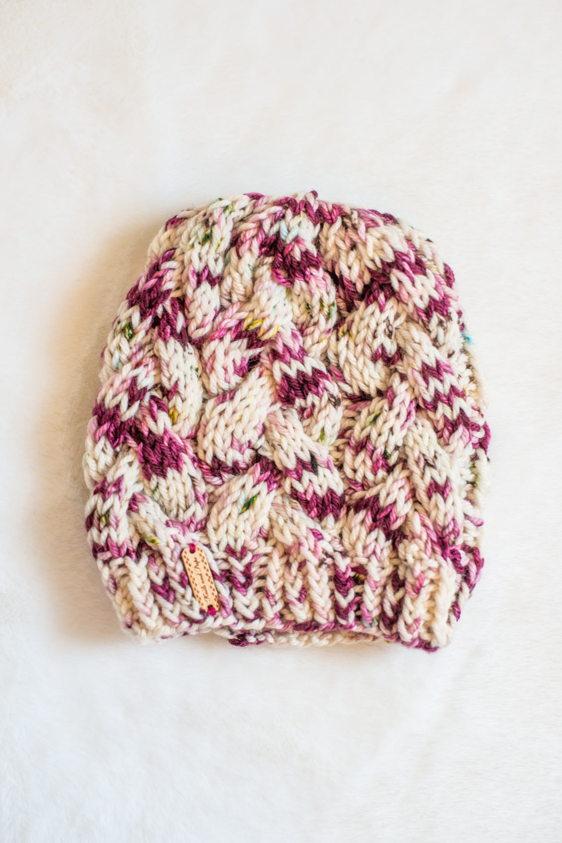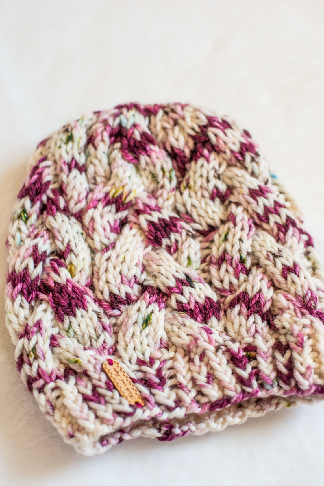 All one of a kind hats are knit with hand dyed, 100% merino wool. Because of how the wool we use is dyed by hand, each skein is unique. Combined with the braided pattern, even if we use the same colorway, each hat is totally one of a kind.