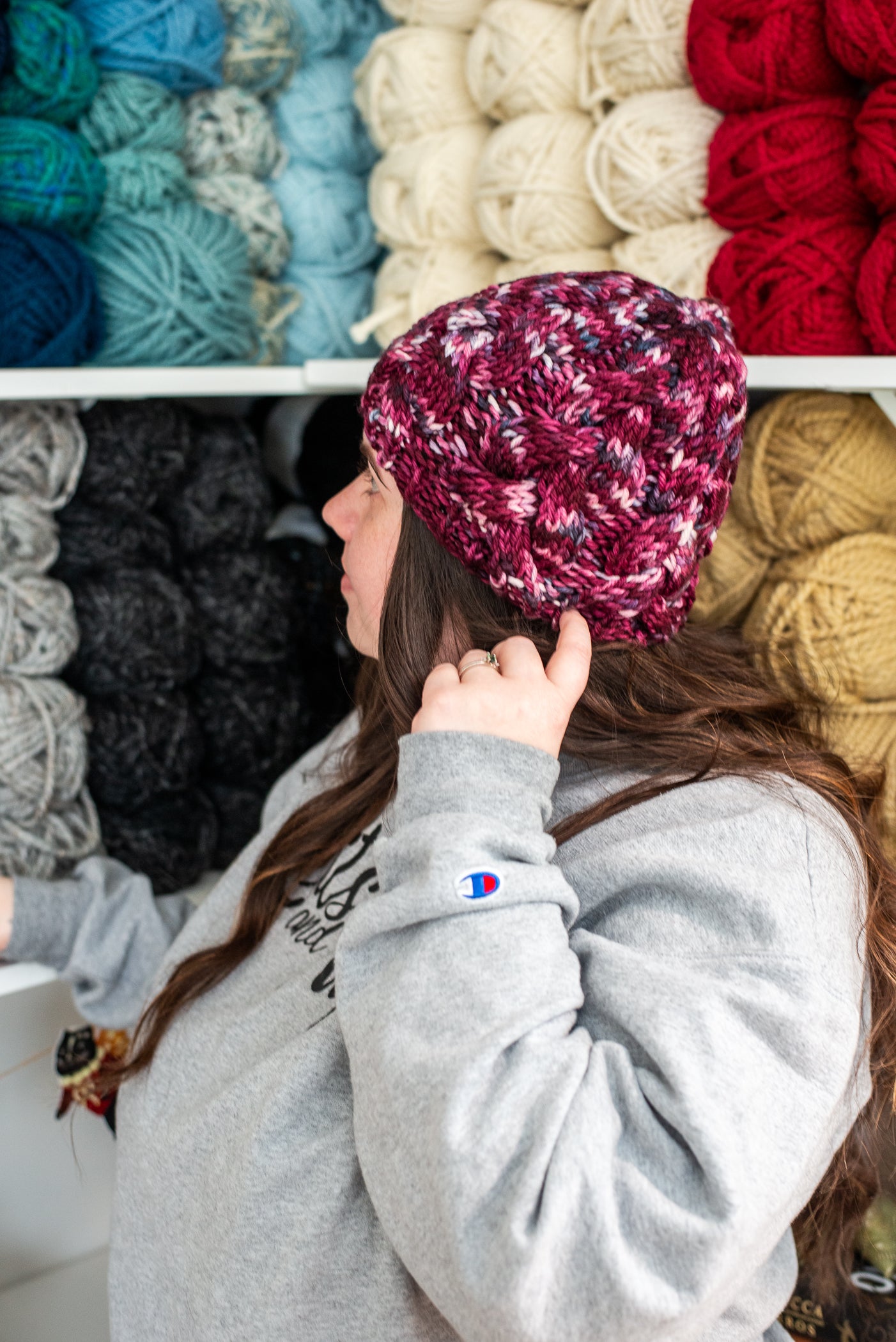 All one of a kind hats are knit with hand dyed, 100% merino wool. Because of how the wool we use is dyed by hand, each skein is unique. Combined with the braided pattern, even if we use the same colorway, each hat is totally one of a kind.