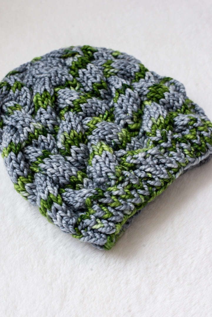 All one of a kind hats are knit with hand dyed, 100% merino wool. Because of how the wool we use is dyed by hand, each skein is unique. Combined with the braided pattern, even if we use the same colorway, each hat is totally one of a kind.