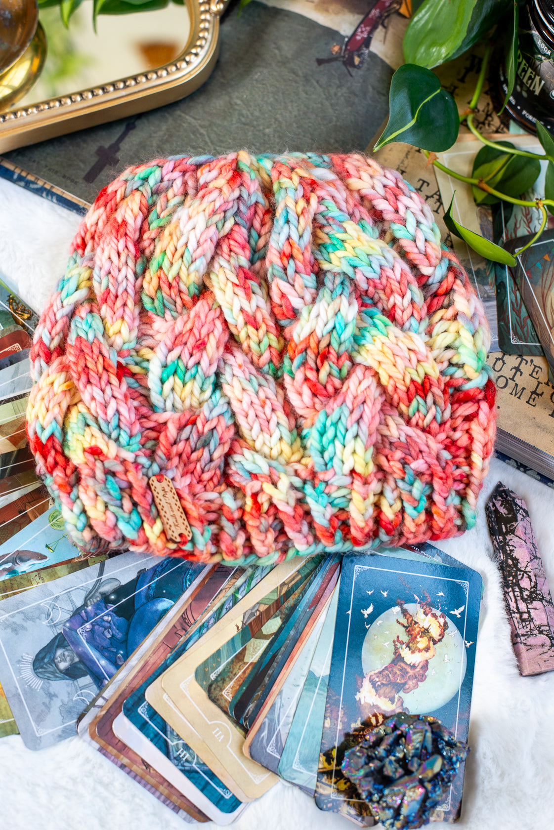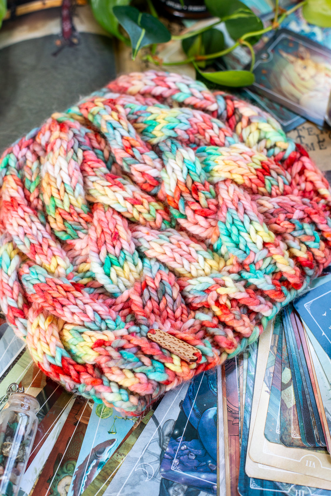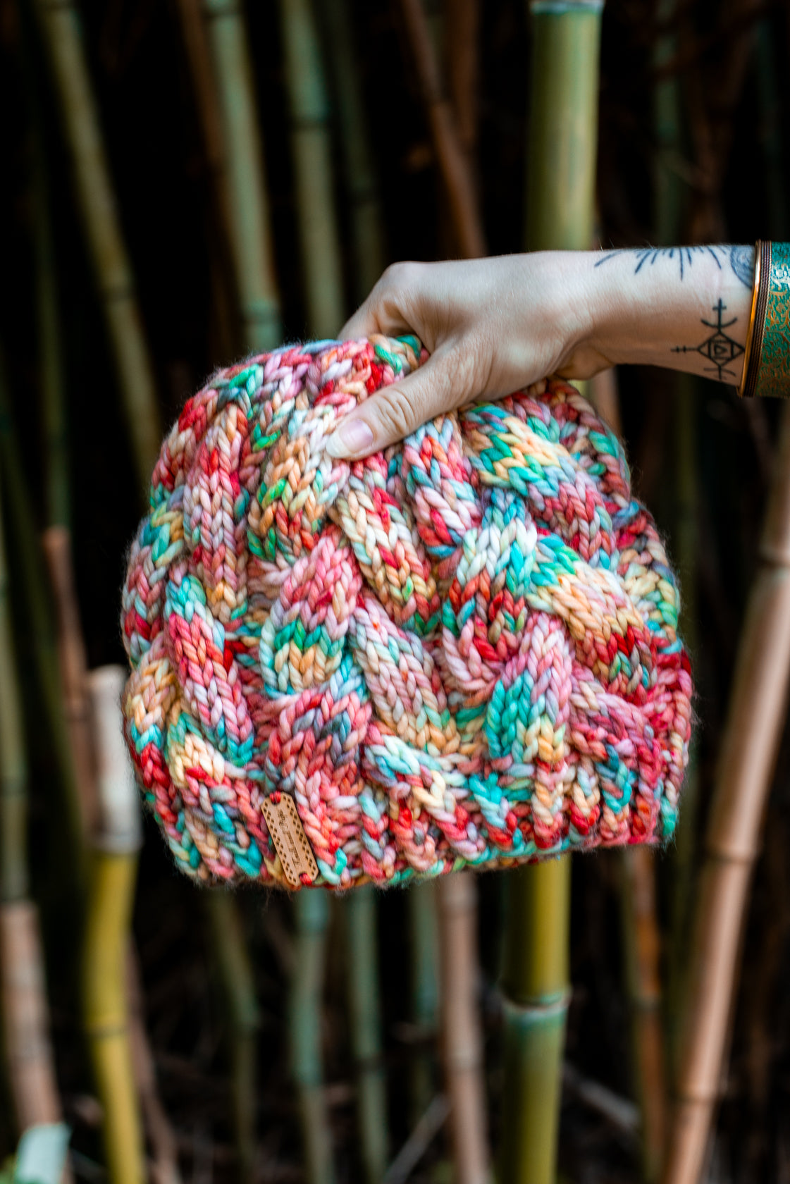 All one of a kind hats are knit with hand dyed, 100% merino wool. Because of how the wool we use is dyed by hand, each skein is unique. Combined with the braided pattern, even if we use the same colorway, each hat is totally one of a kind.