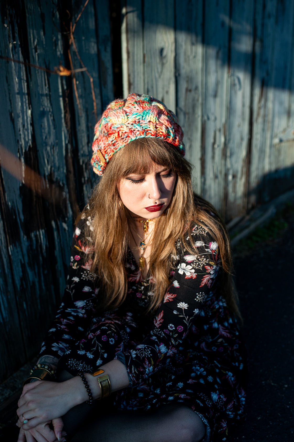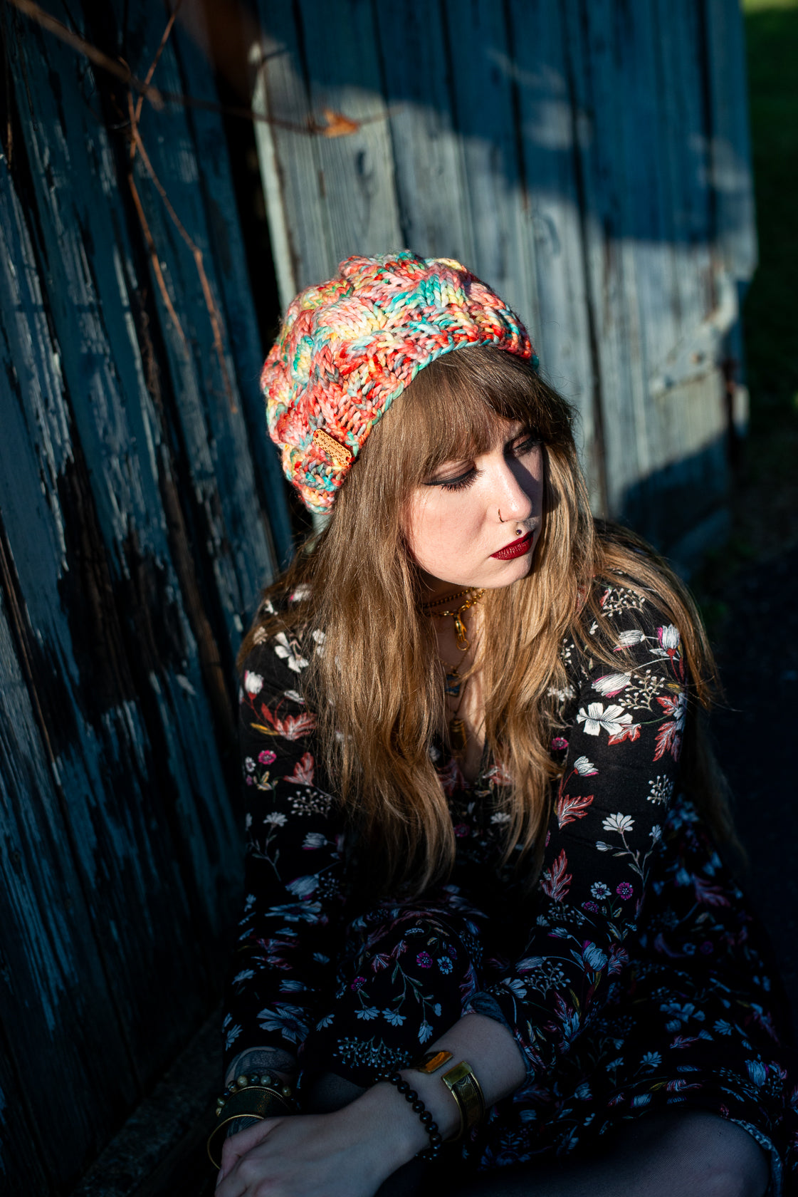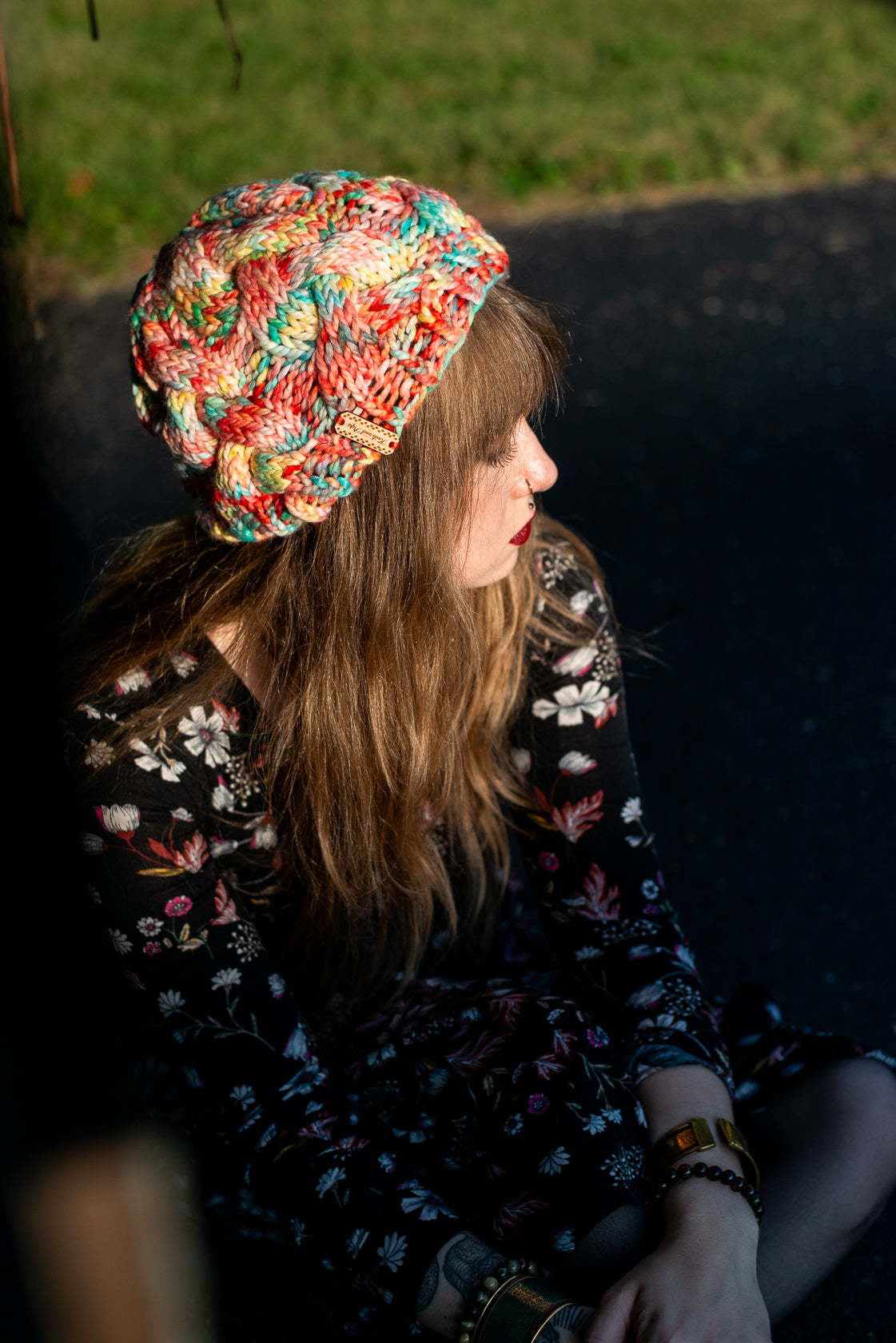 All one of a kind hats are knit with hand dyed, 100% merino wool. Because of how the wool we use is dyed by hand, each skein is unique. Combined with the braided pattern, even if we use the same colorway, each hat is totally one of a kind.