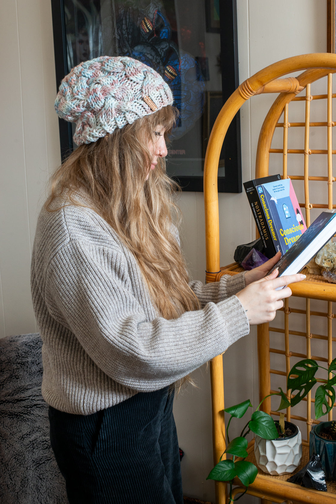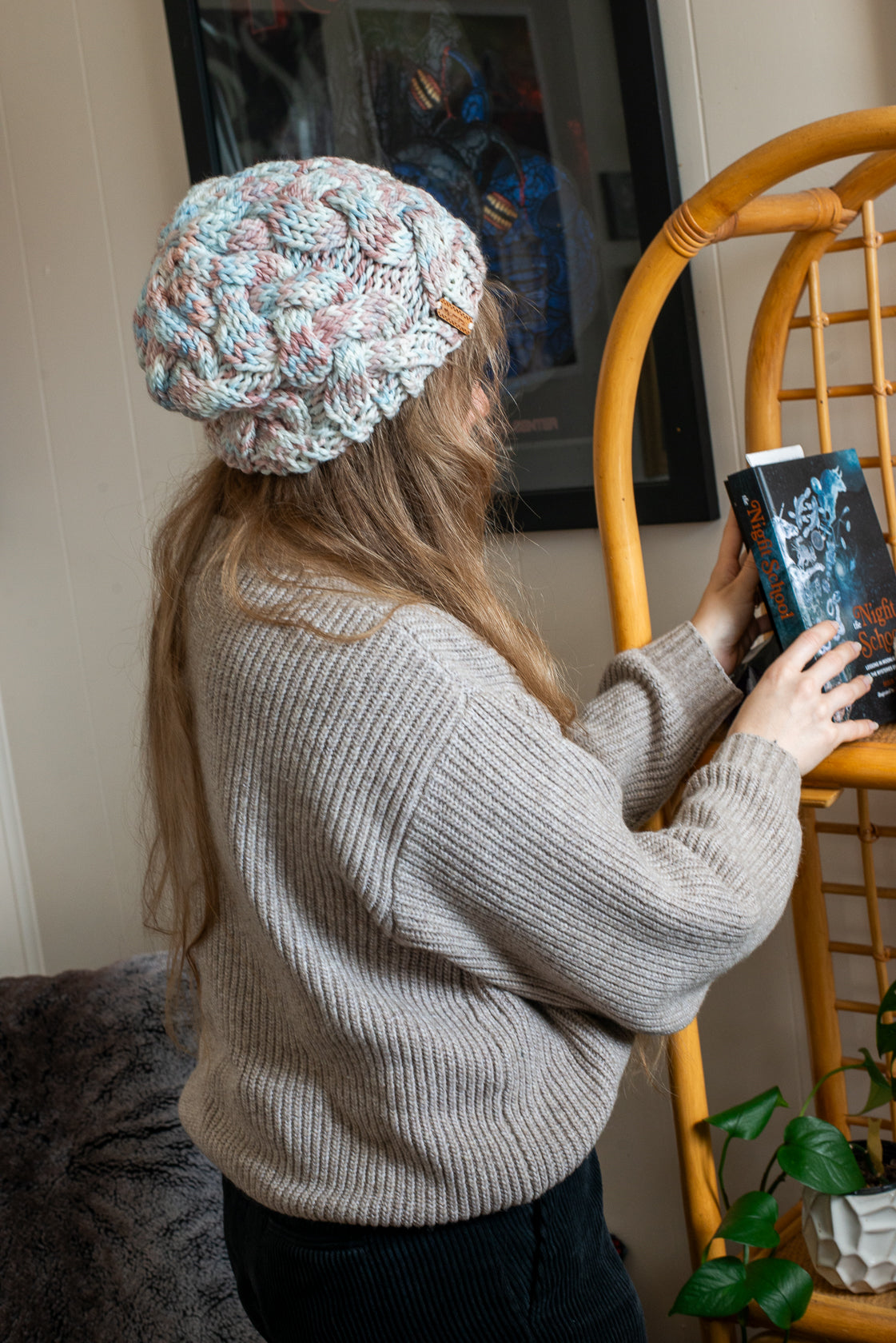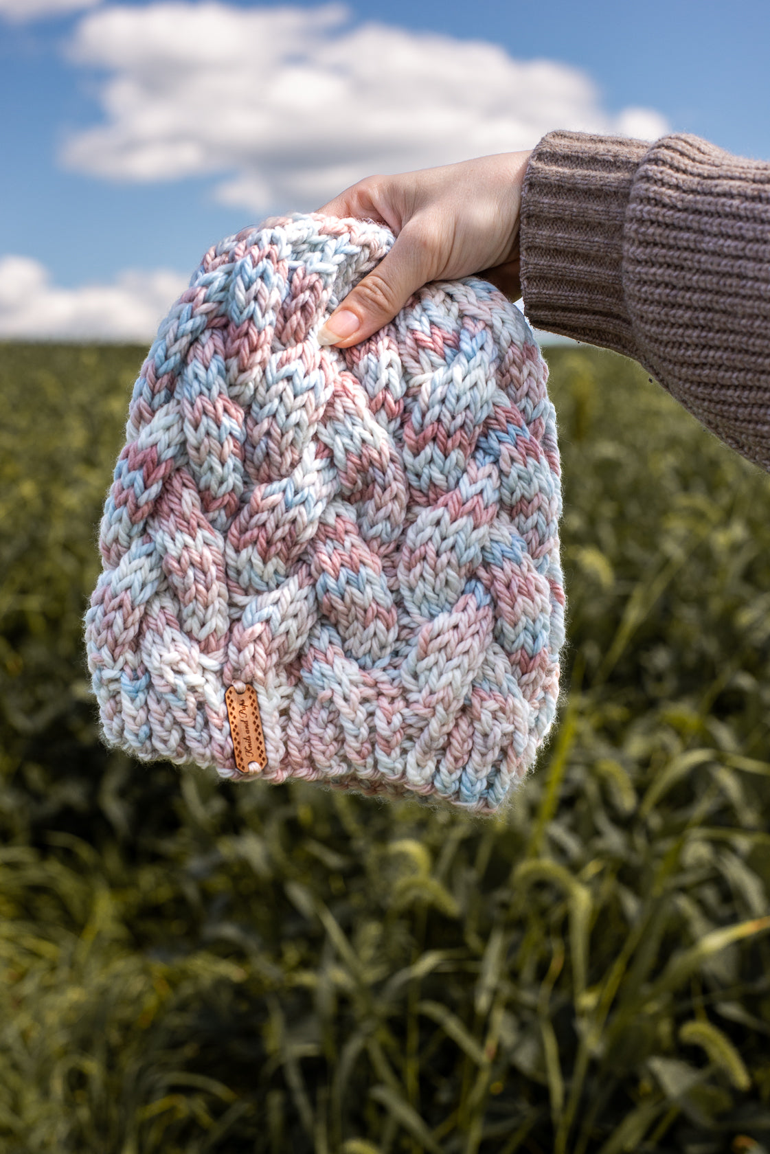 All one of a kind hats are knit with hand dyed, 100% merino wool. Because of how the wool we use is dyed by hand, each skein is unique. Combined with the braided pattern, even if we use the same colorway, each hat is totally one of a kind.