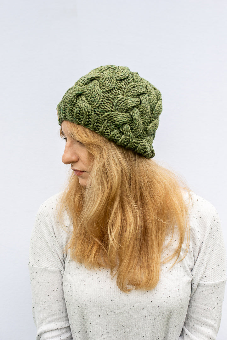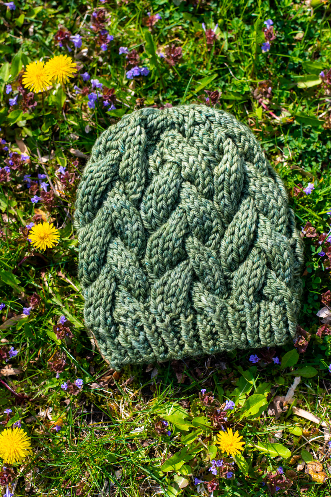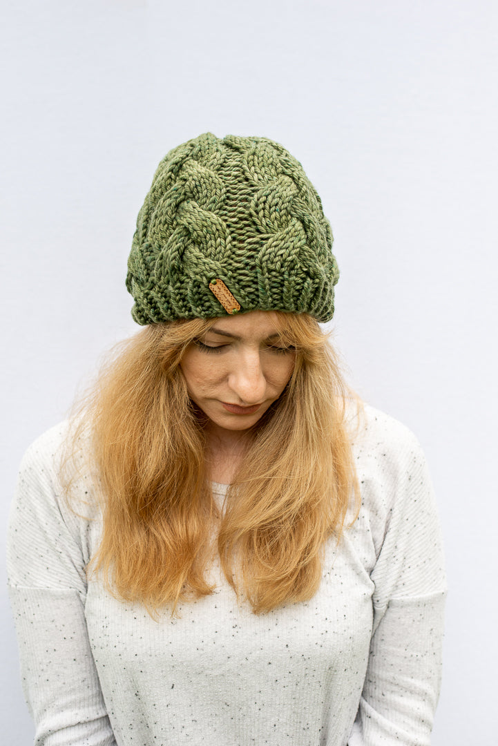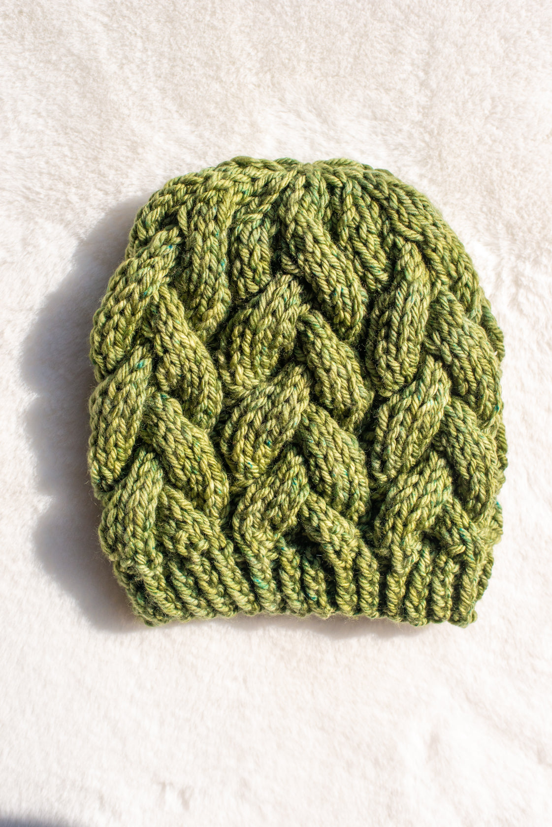 All one of a kind hats are knit with hand dyed, 100% merino wool. Because of how the wool we use is dyed by hand, each skein is unique. Combined with the braided pattern, even if we use the same colorway, each hat is totally one of a kind.