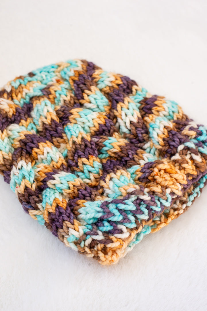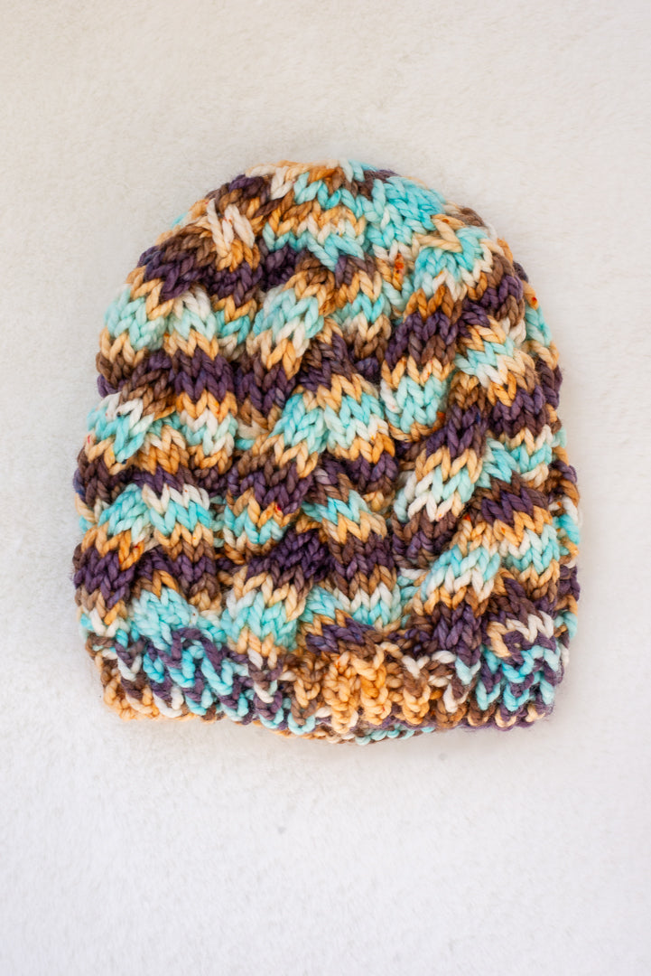 All one of a kind hats are knit with hand dyed, 100% merino wool. Because of how the wool we use is dyed by hand, each skein is unique. Combined with the braided pattern, even if we use the same colorway, each hat is totally one of a kind.