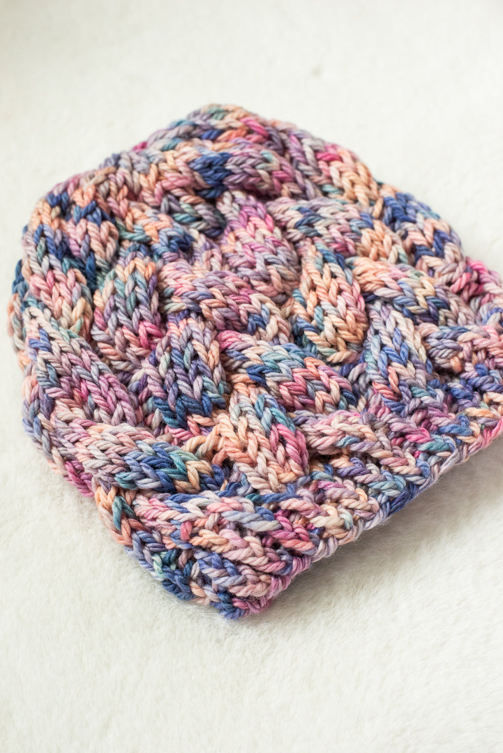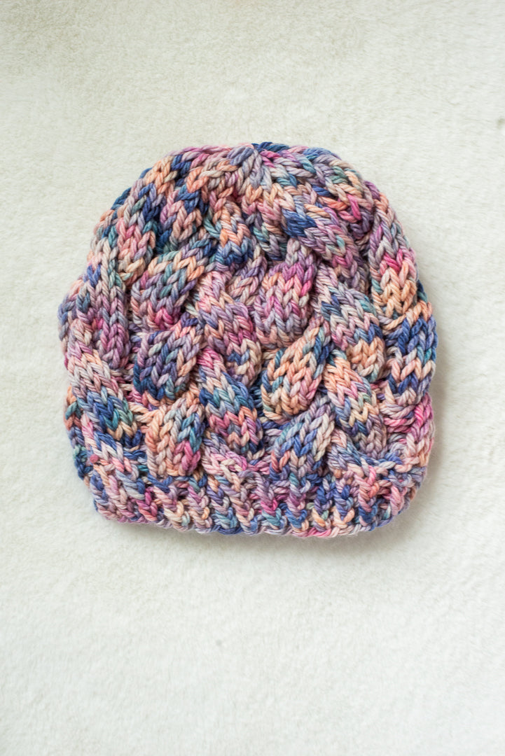 All one of a kind hats are knit with hand dyed, 100% merino wool. Because of how the wool we use is dyed by hand, each skein is unique. Combined with the braided pattern, even if we use the same colorway, each hat is totally one of a kind.