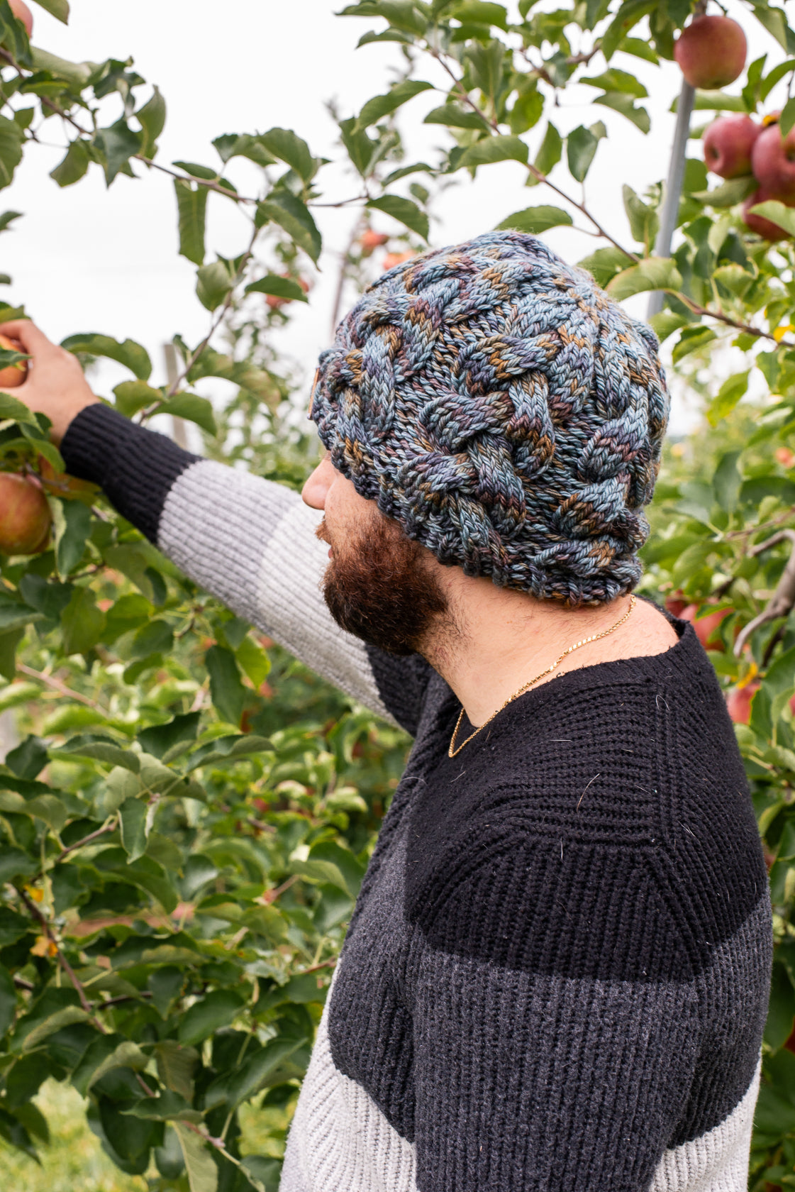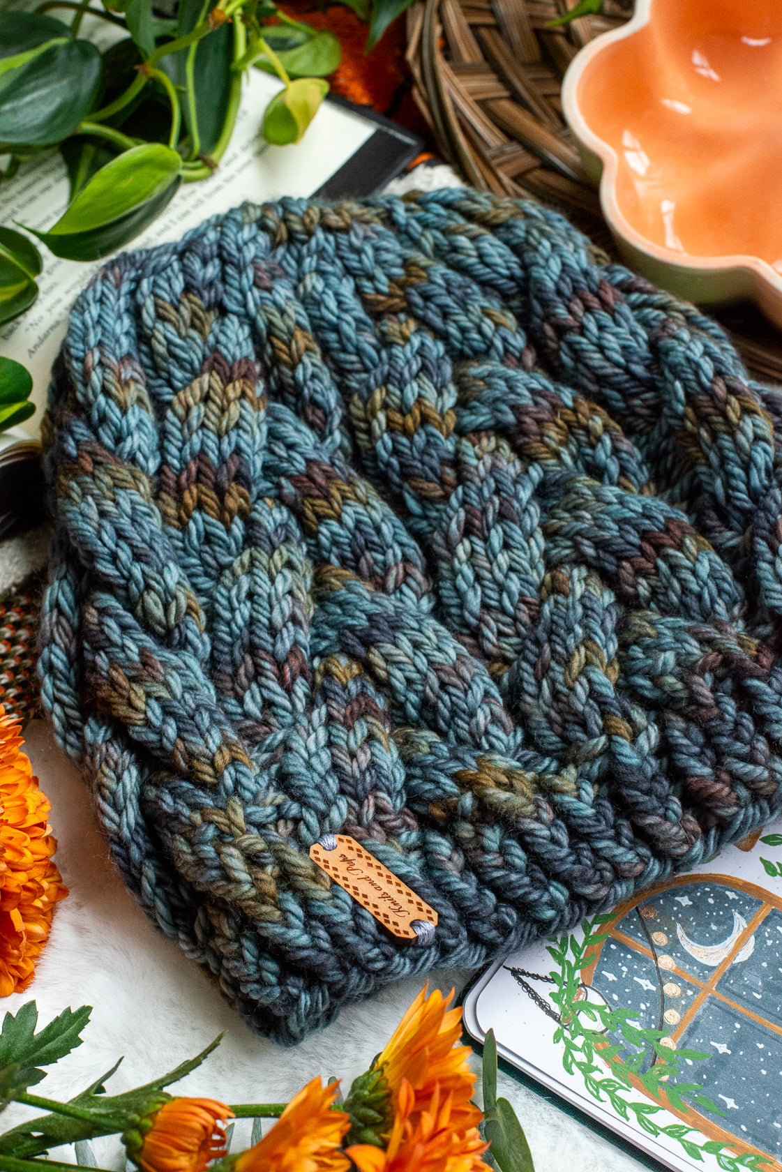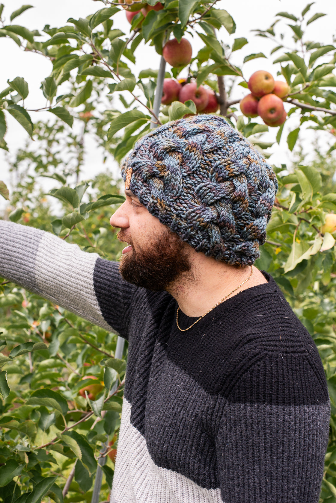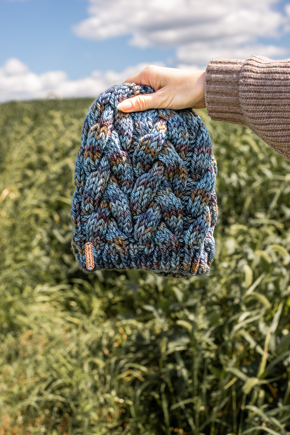 All one of a kind hats are knit with hand dyed, 100% merino wool. Because of how the wool we use is dyed by hand, each skein is unique. Combined with the braided pattern, even if we use the same colorway, each hat is totally one of a kind.