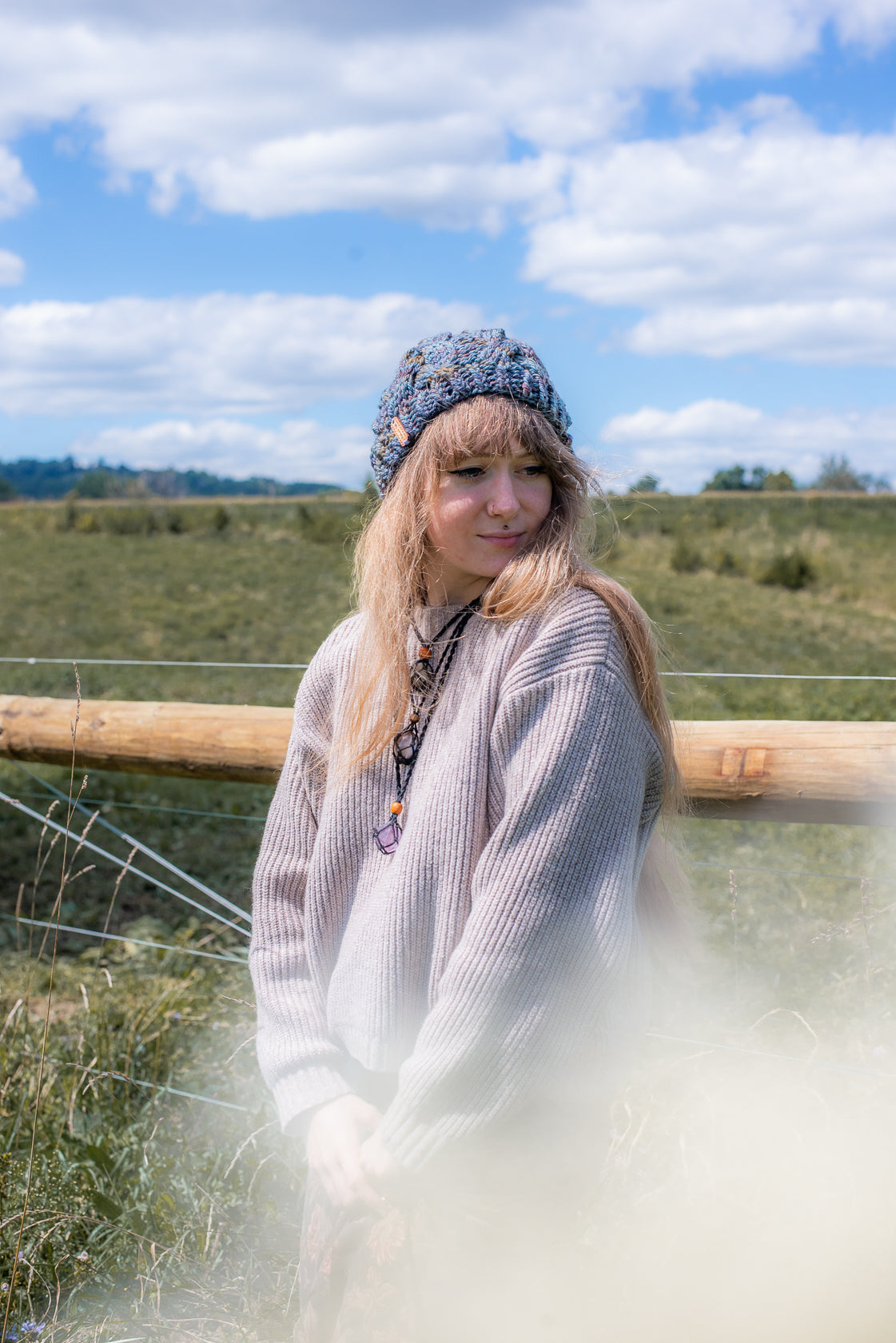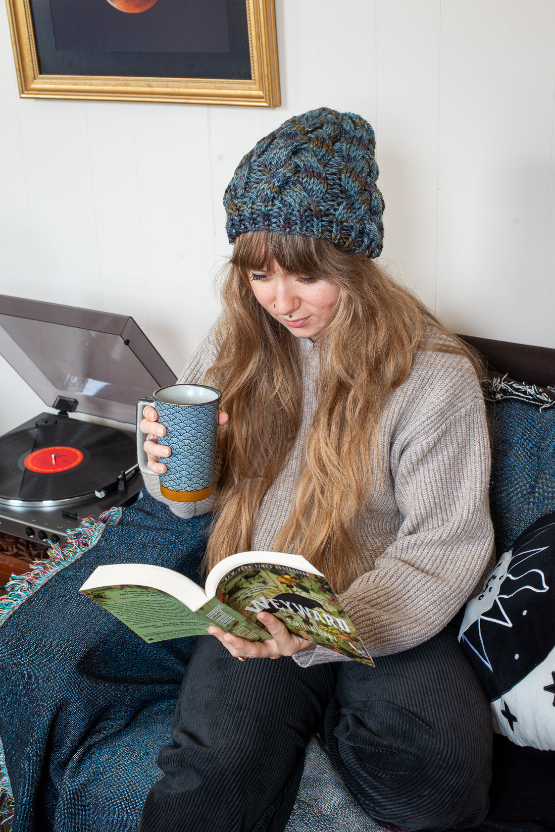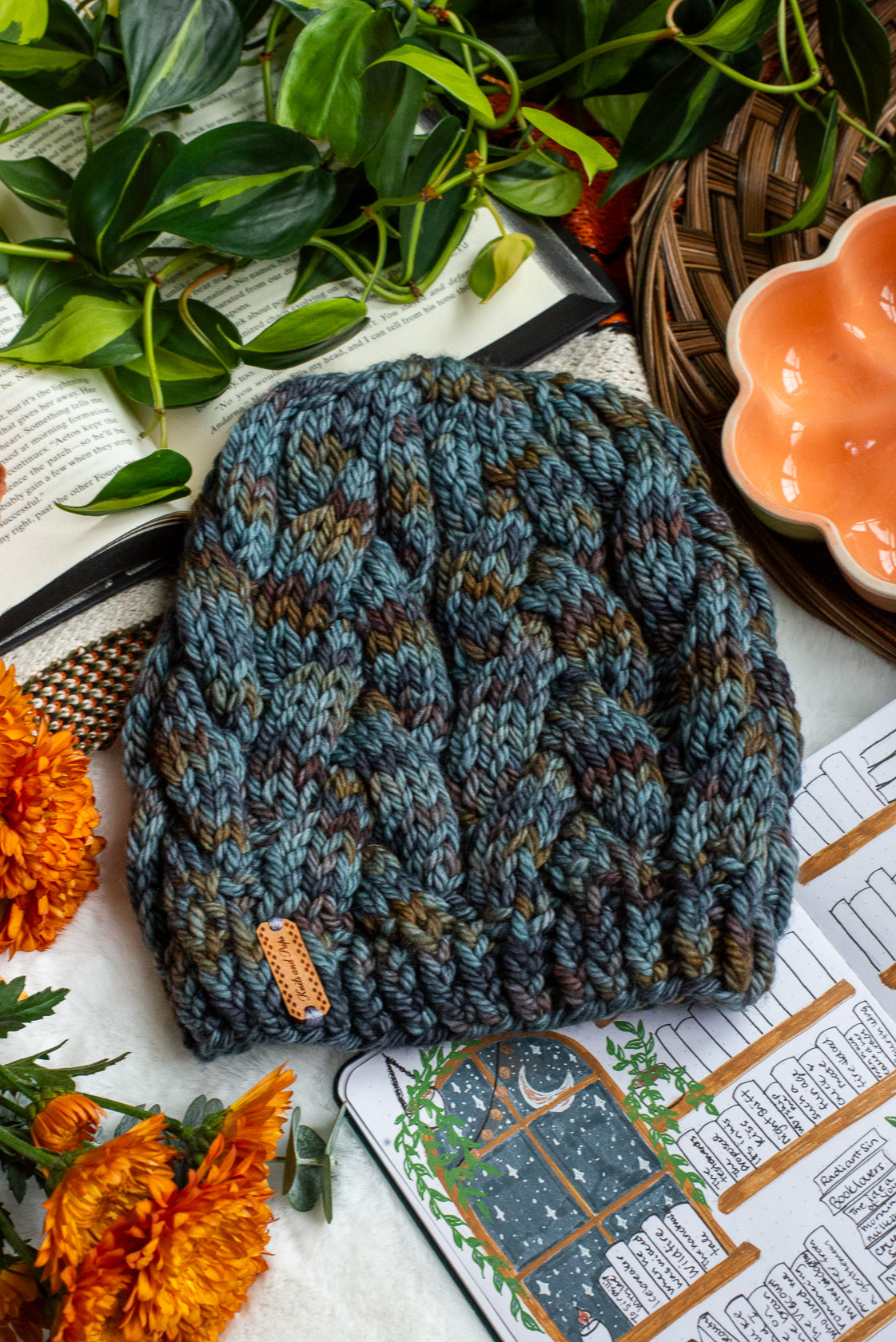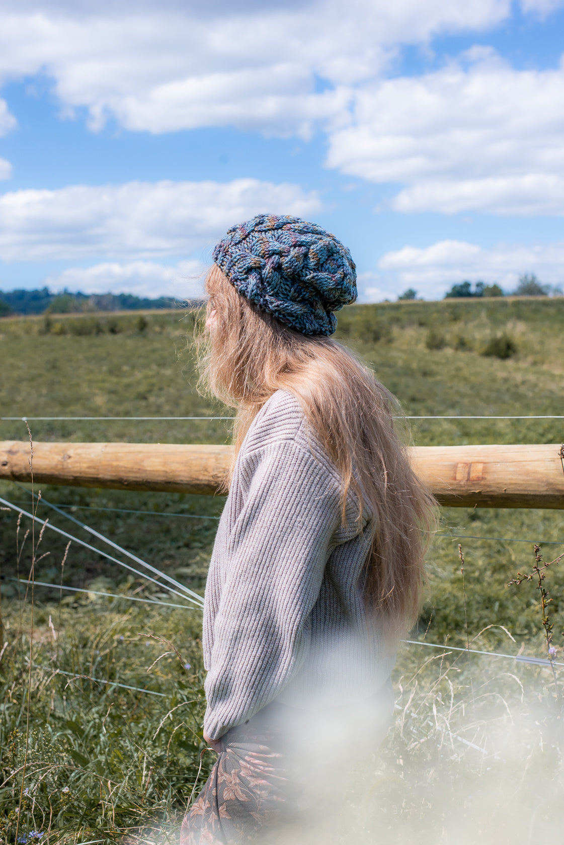 All one of a kind hats are knit with hand dyed, 100% merino wool. Because of how the wool we use is dyed by hand, each skein is unique. Combined with the braided pattern, even if we use the same colorway, each hat is totally one of a kind.