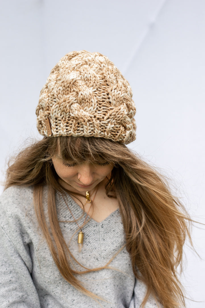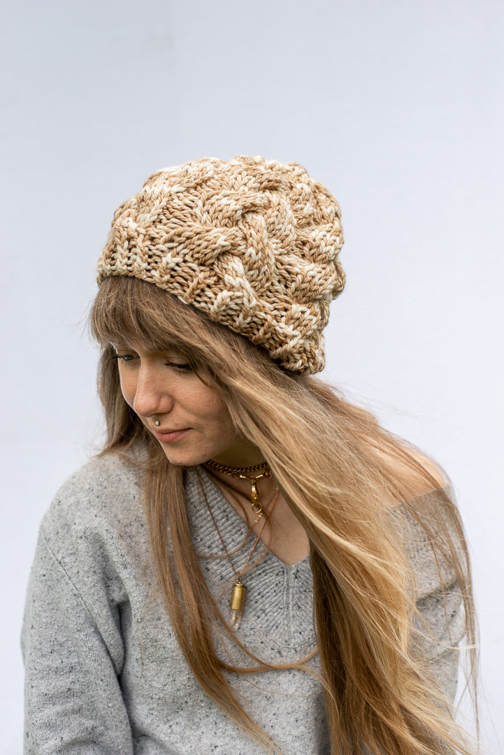 All one of a kind hats are knit with hand dyed, 100% merino wool. Because of how the wool we use is dyed by hand, each skein is unique. Combined with the braided pattern, even if we use the same colorway, each hat is totally one of a kind.