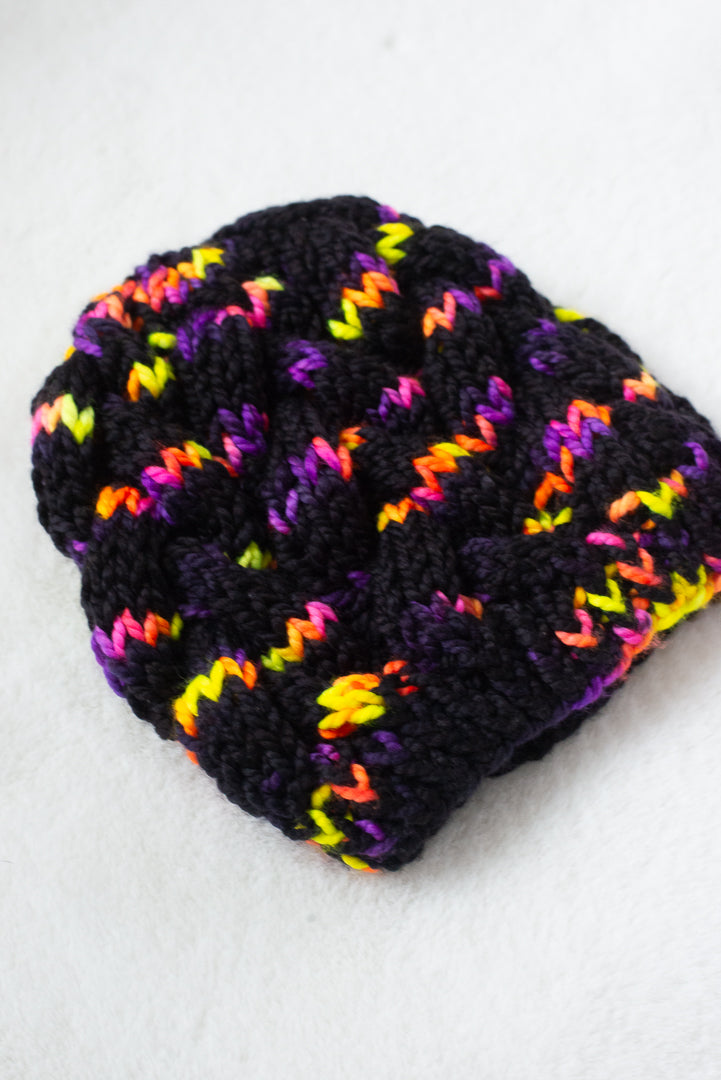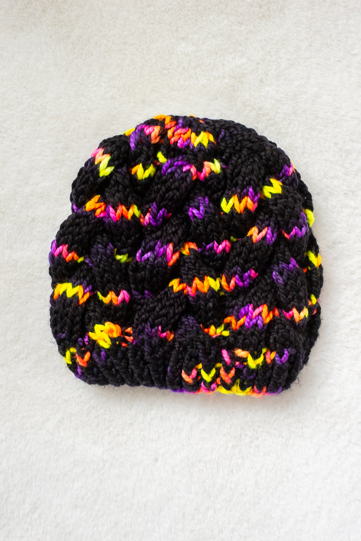 All one of a kind hats are knit with hand dyed, 100% merino wool. Because of how the wool we use is dyed by hand, each skein is unique. Combined with the braided pattern, even if we use the same colorway, each hat is totally one of a kind.