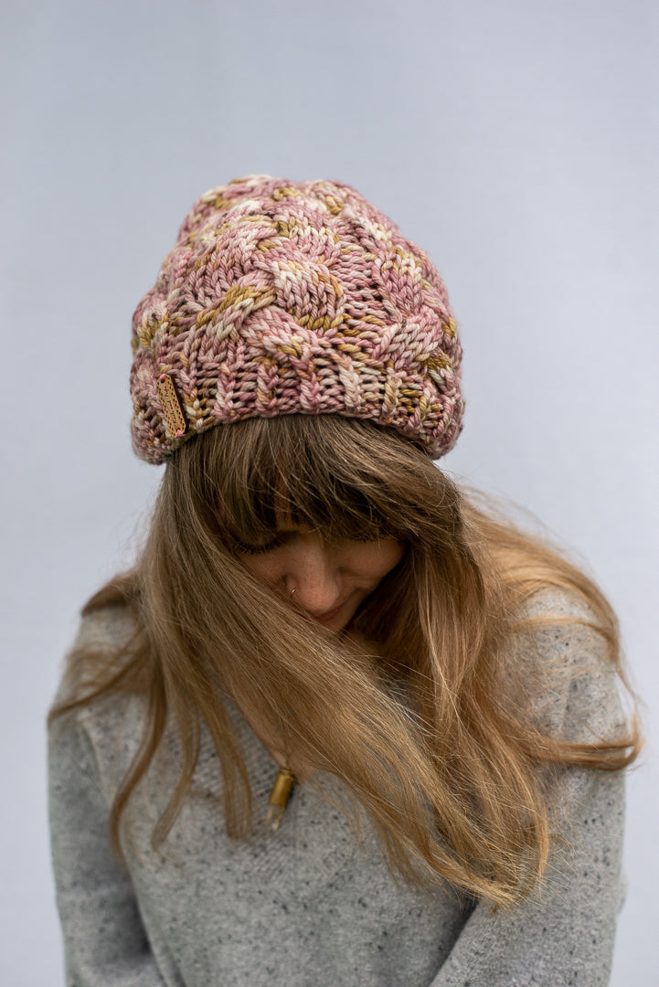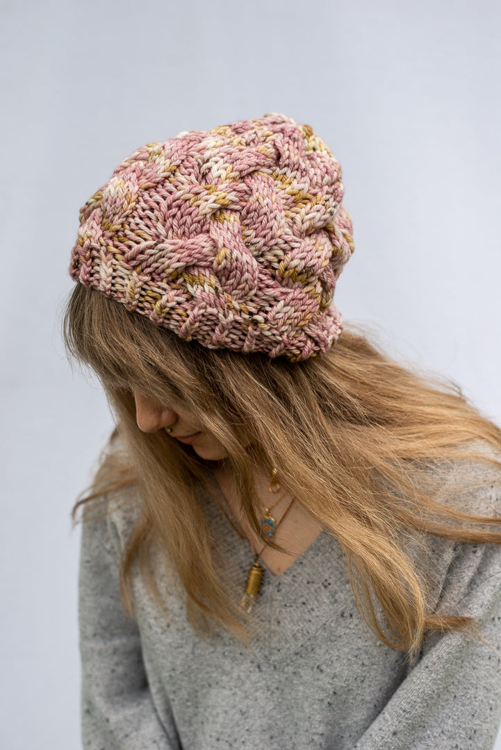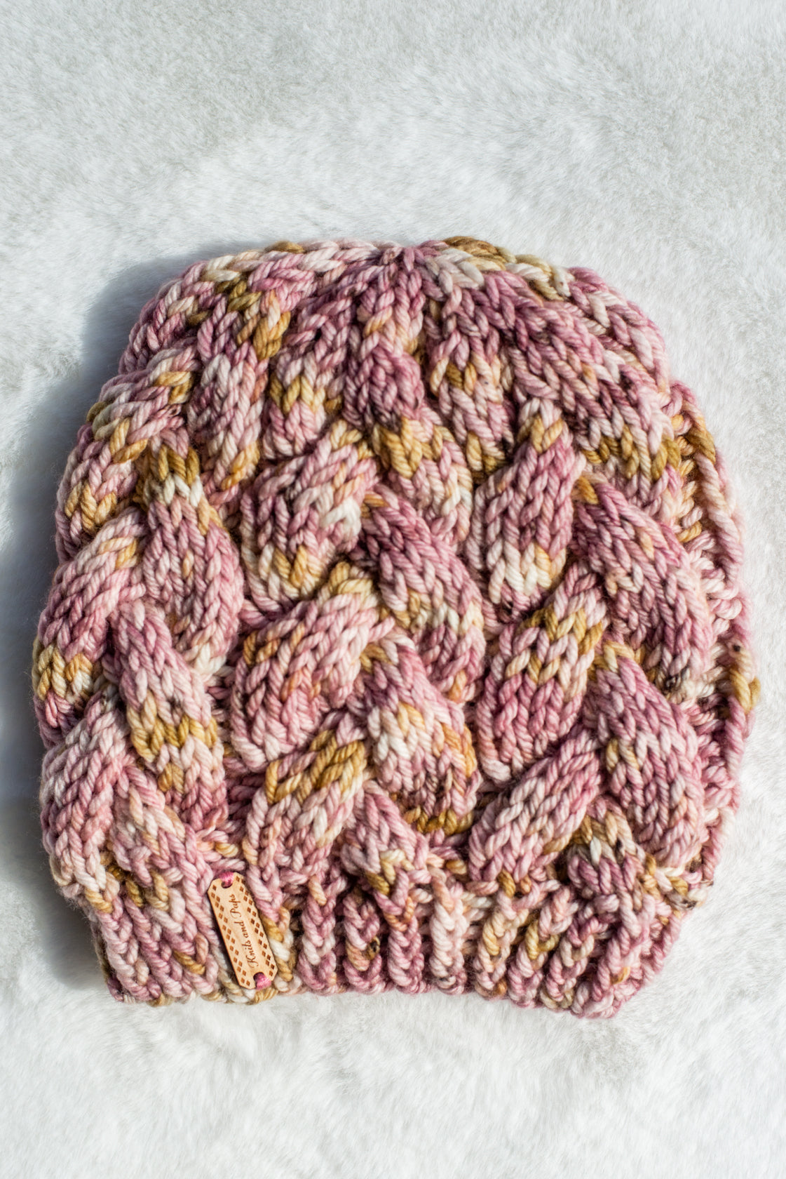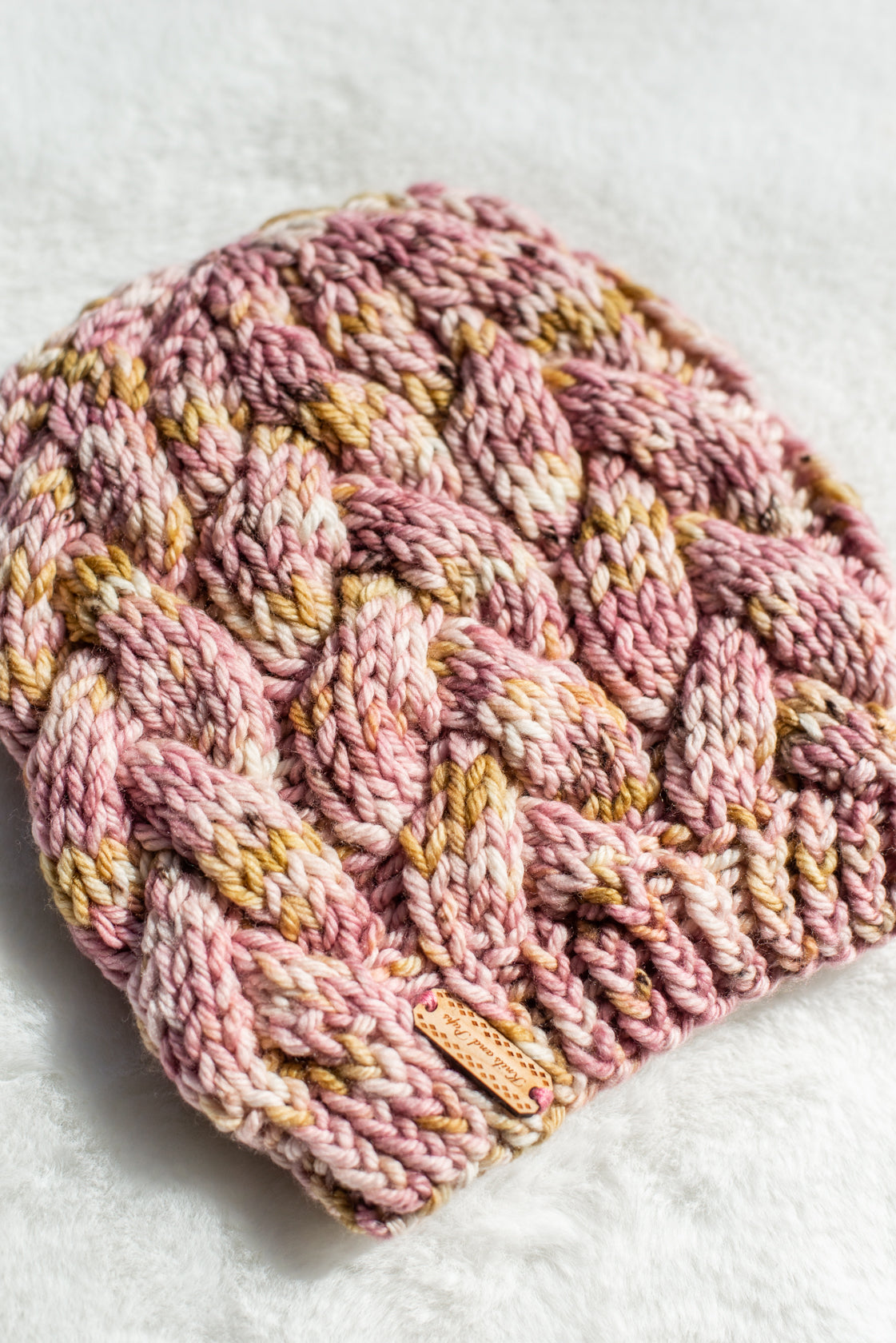 All one of a kind hats are knit with hand dyed, 100% merino wool. Because of how the wool we use is dyed by hand, each skein is unique. Combined with the braided pattern, even if we use the same colorway, each hat is totally one of a kind.