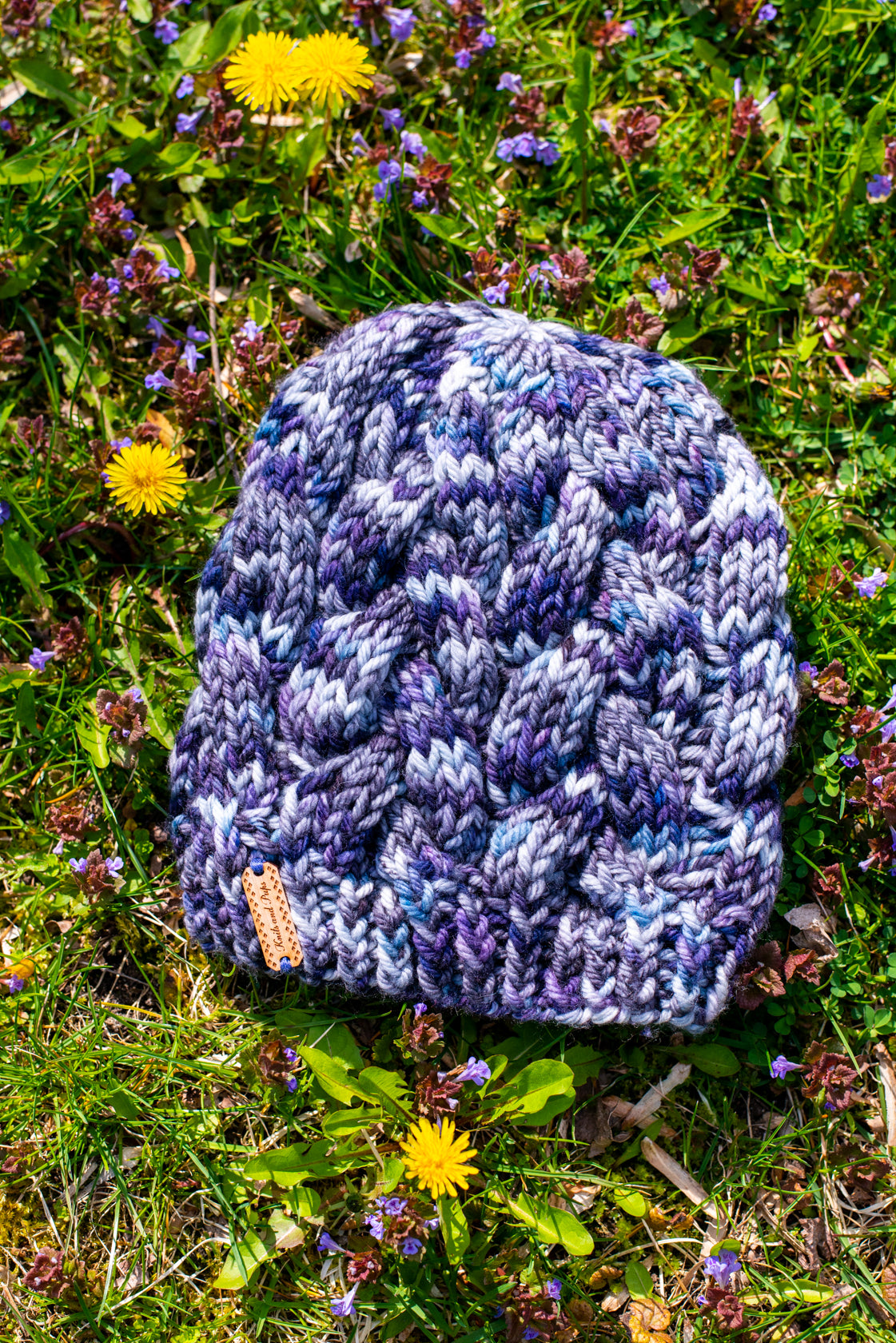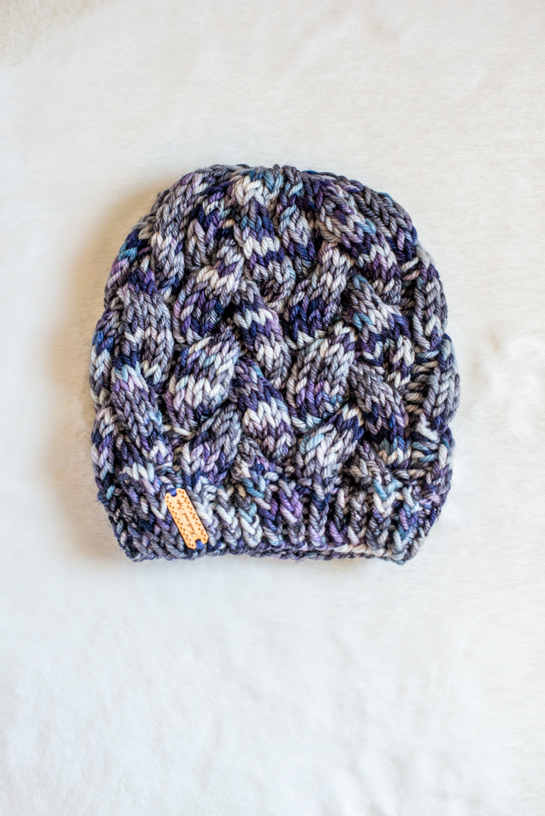 All one of a kind hats are knit with hand dyed, 100% merino wool. Because of how the wool we use is dyed by hand, each skein is unique. Combined with the braided pattern, even if we use the same colorway, each hat is totally one of a kind.