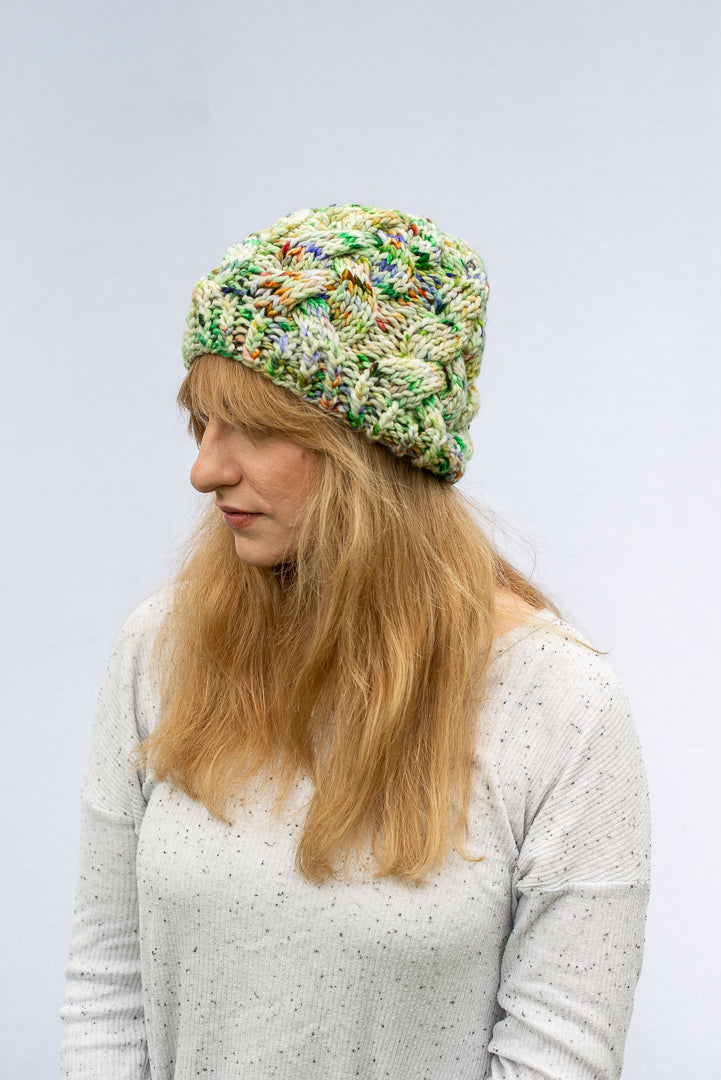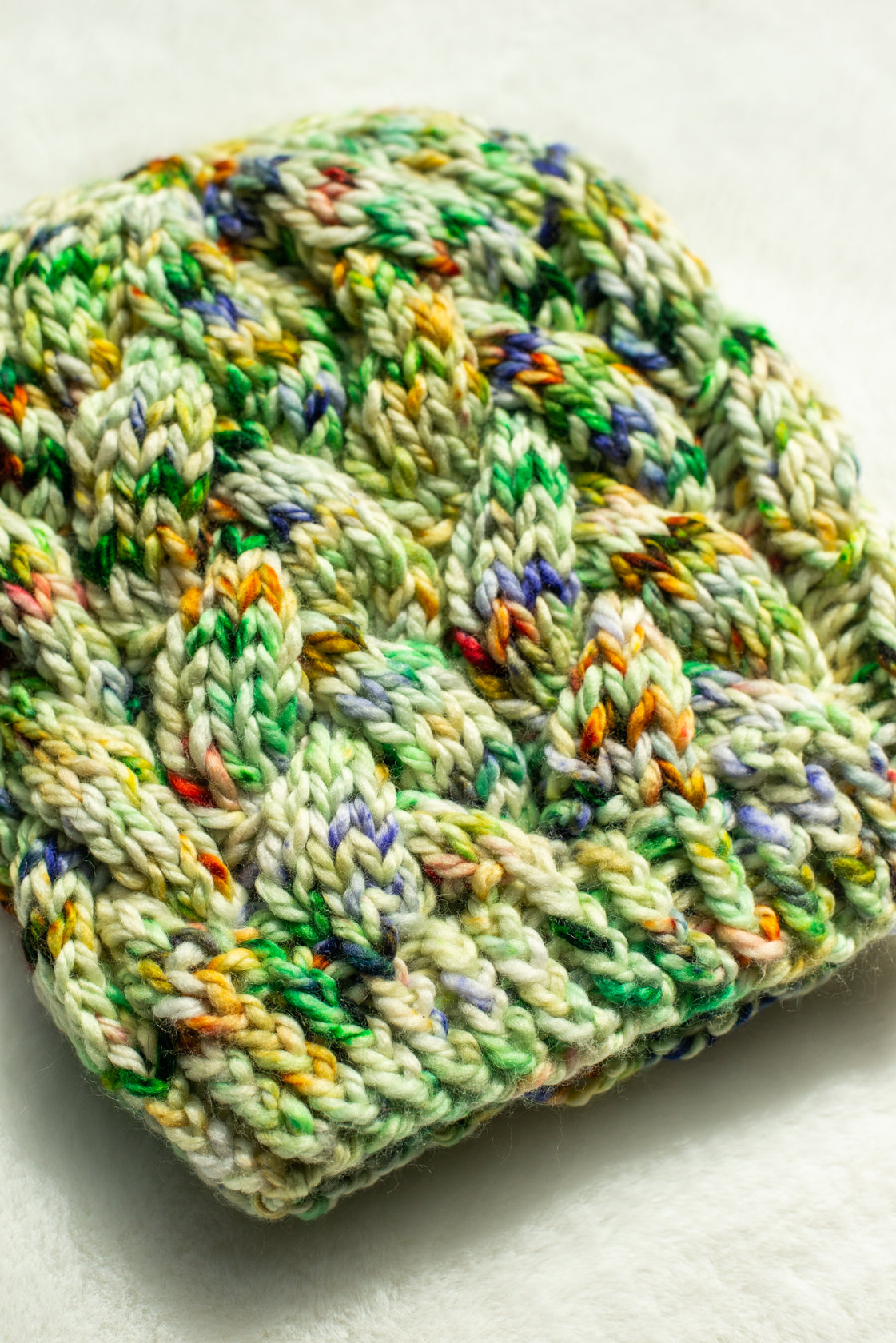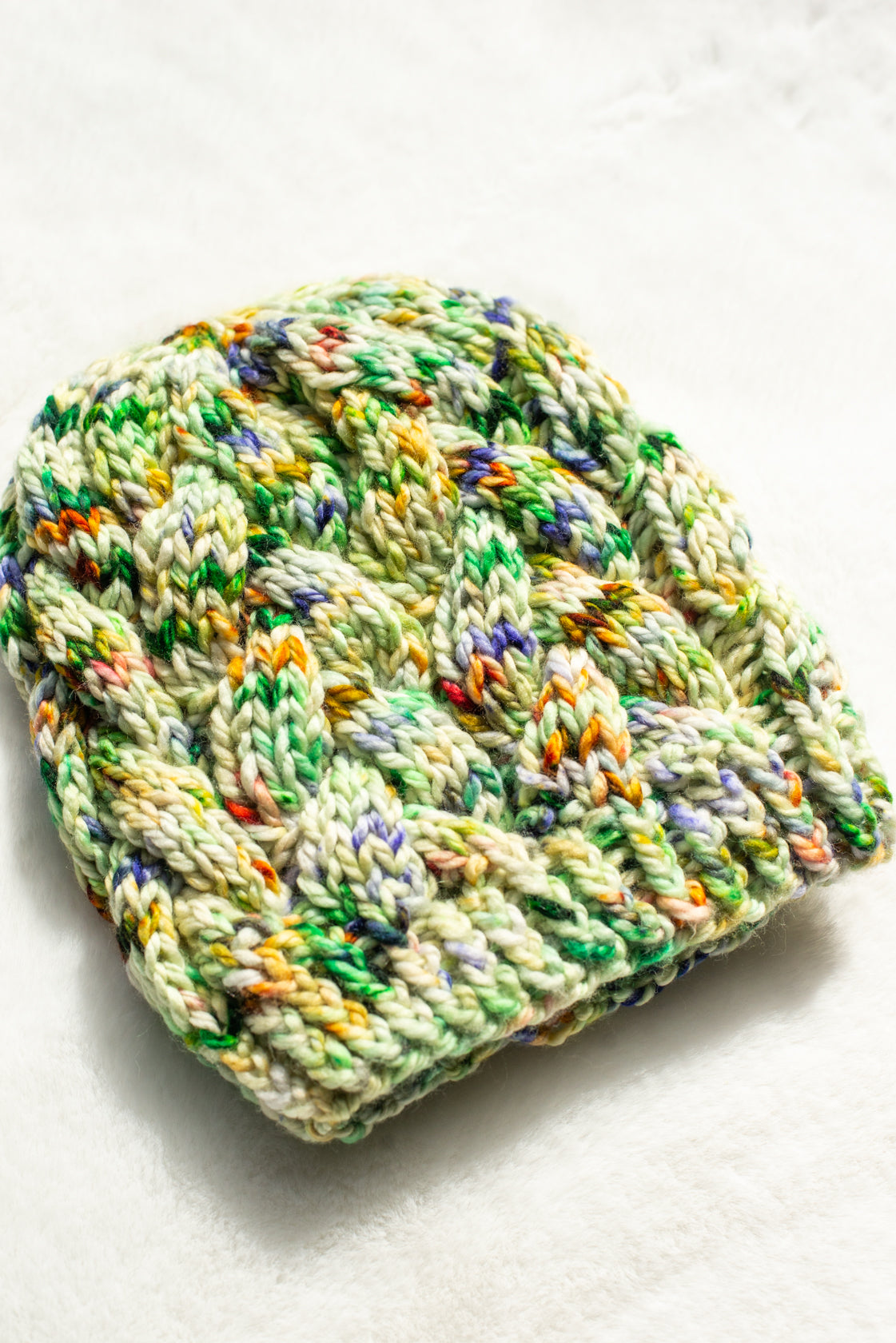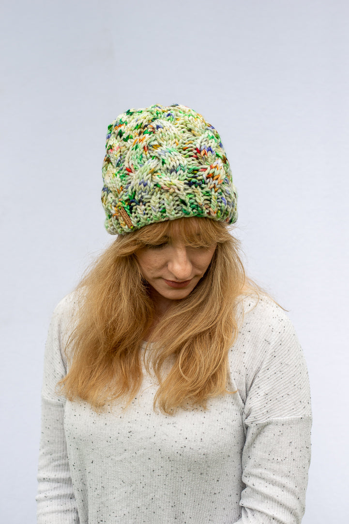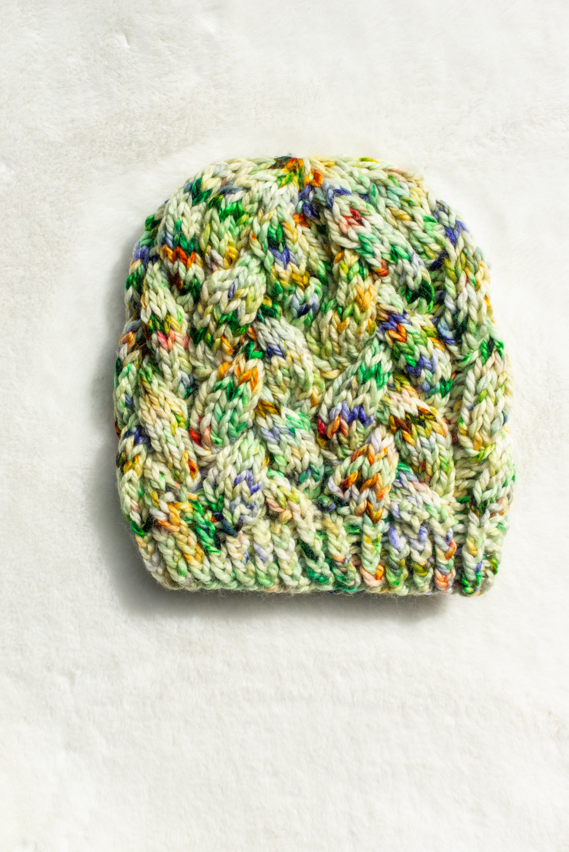 All one of a kind hats are knit with hand dyed, 100% merino wool. Because of how the wool we use is dyed by hand, each skein is unique. Combined with the braided pattern, even if we use the same colorway, each hat is totally one of a kind.