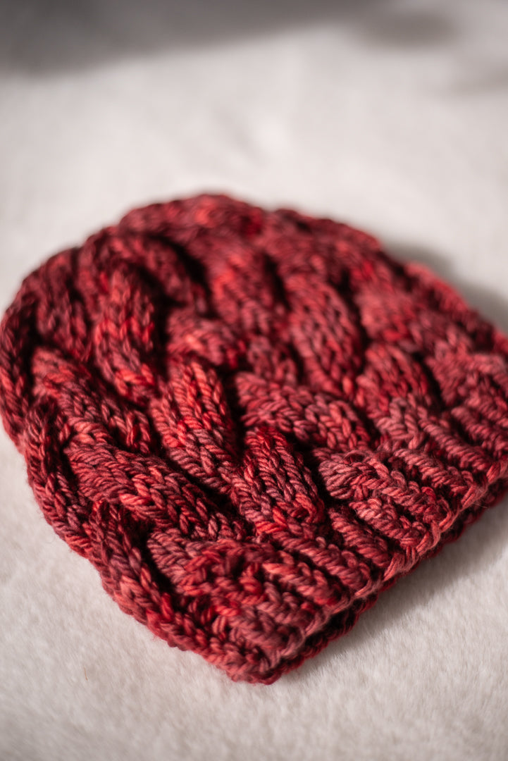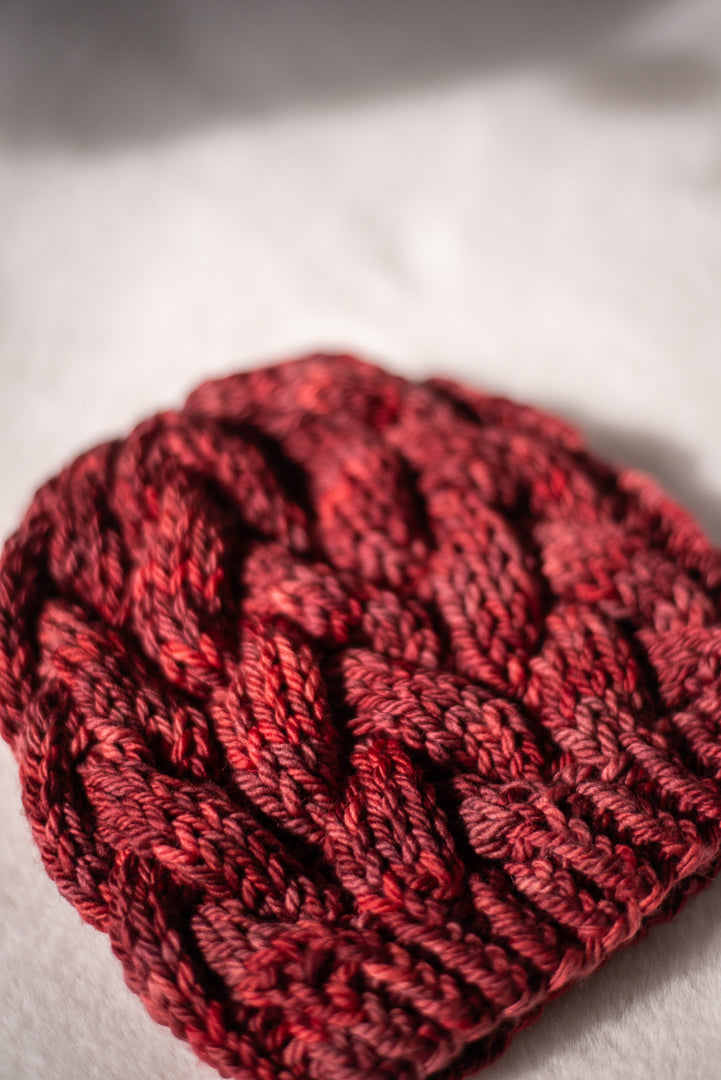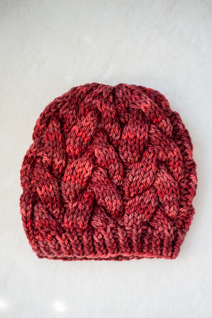 All one of a kind hats are knit with hand dyed, 100% merino wool. Because of how the wool we use is dyed by hand, each skein is unique. Combined with the braided pattern, even if we use the same colorway, each hat is totally one of a kind.