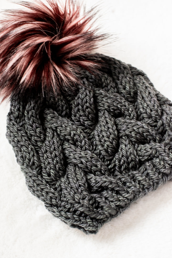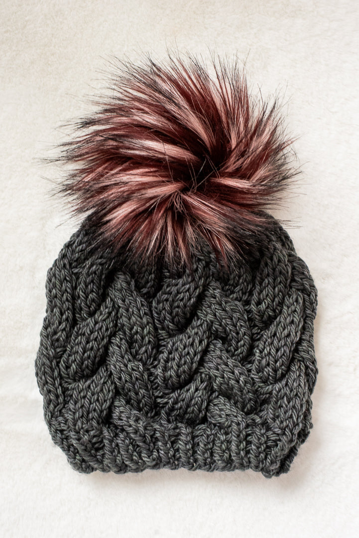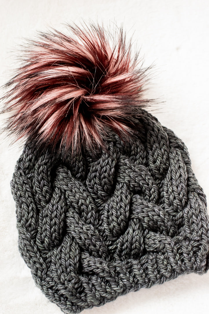 All one of a kind hats are knit with hand dyed, 100% merino wool. Because of how the wool we use is dyed by hand, each skein is unique. Combined with the braided pattern, even if we use the same colorway, each hat is totally one of a kind.