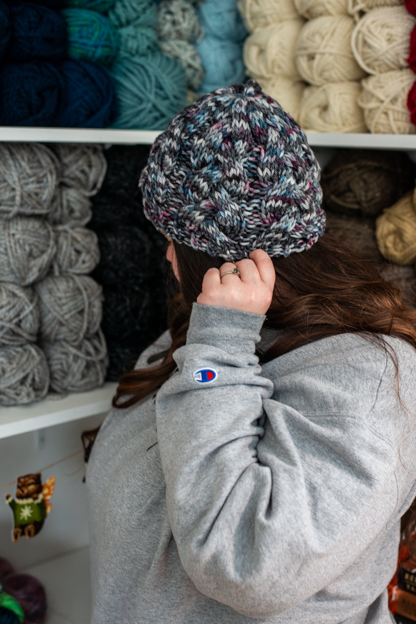 All one of a kind hats are knit with hand dyed, 100% merino wool. Because of how the wool we use is dyed by hand, each skein is unique. Combined with the braided pattern, even if we use the same colorway, each hat is totally one of a kind.