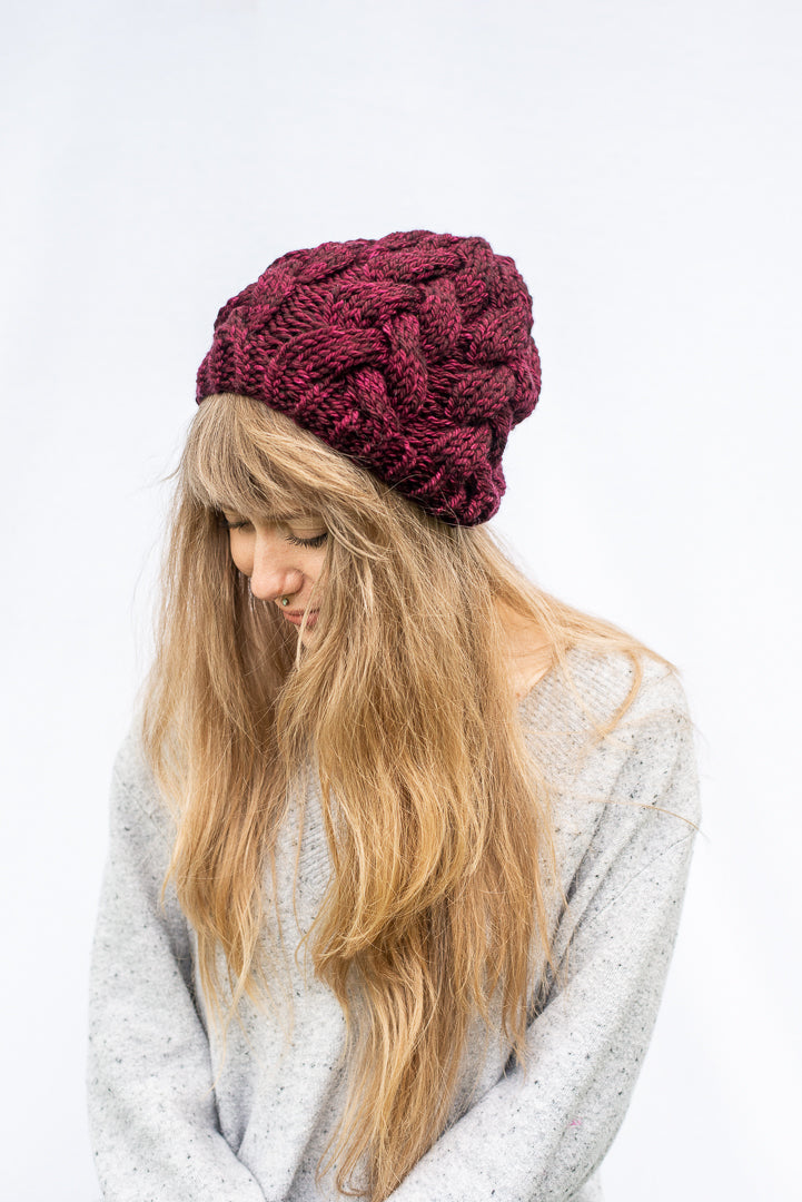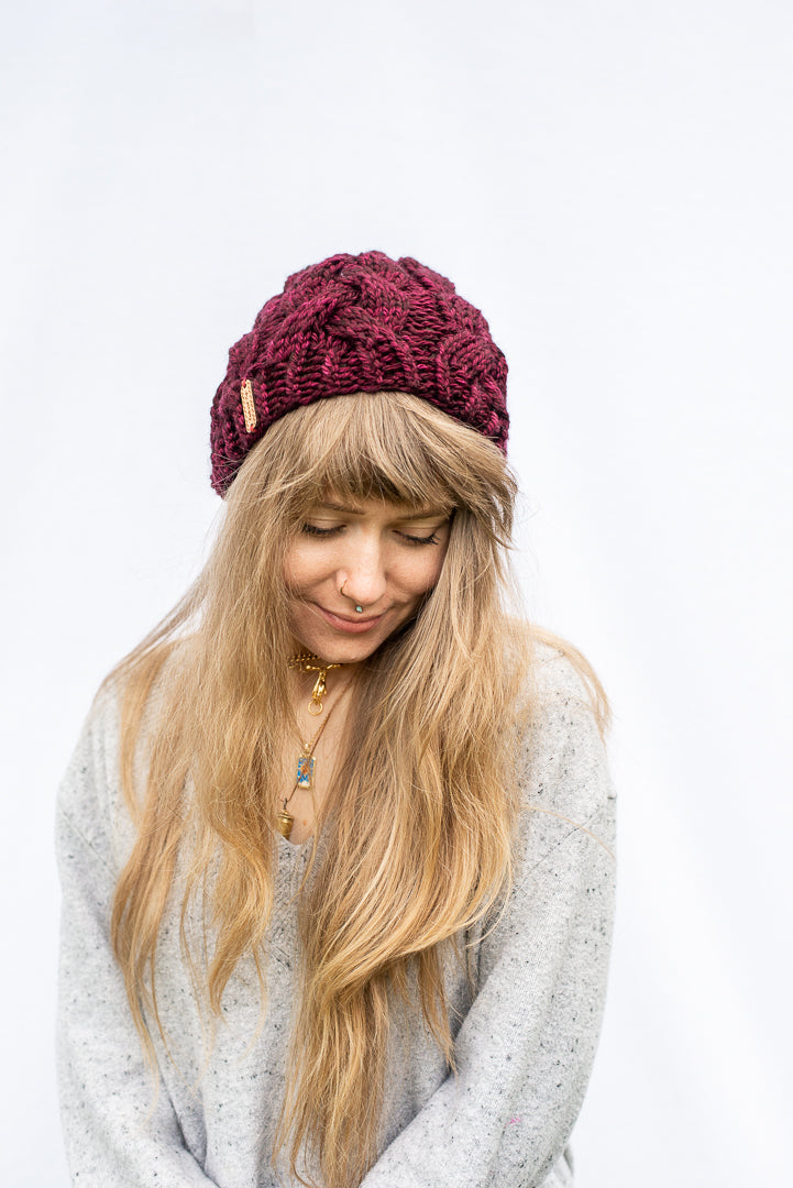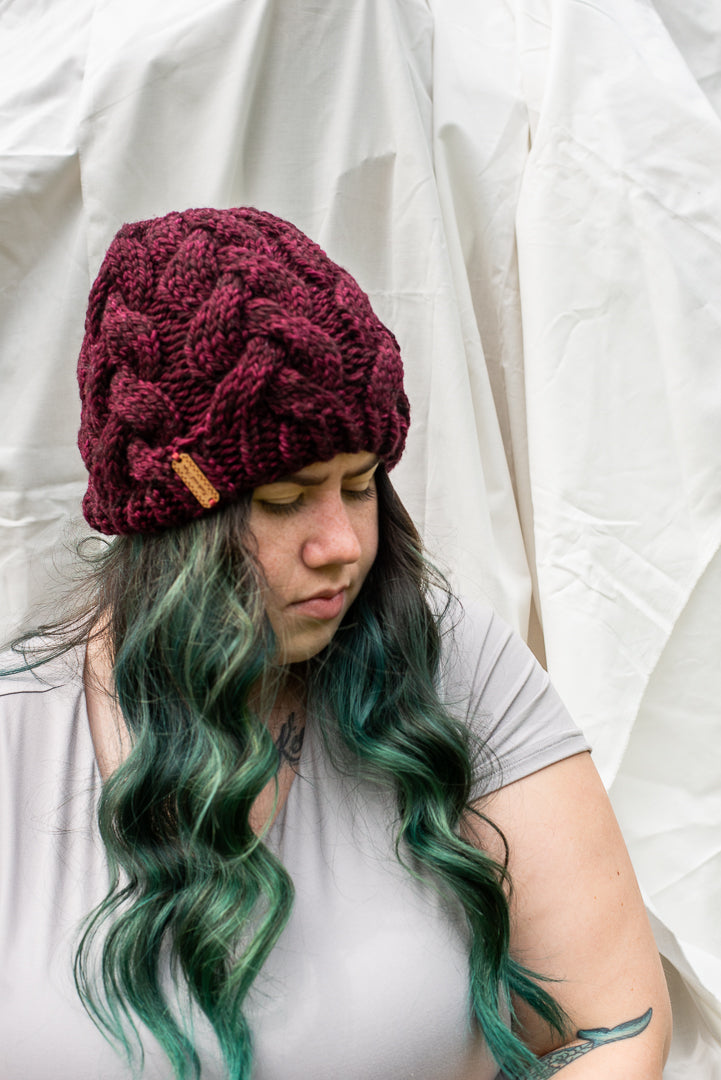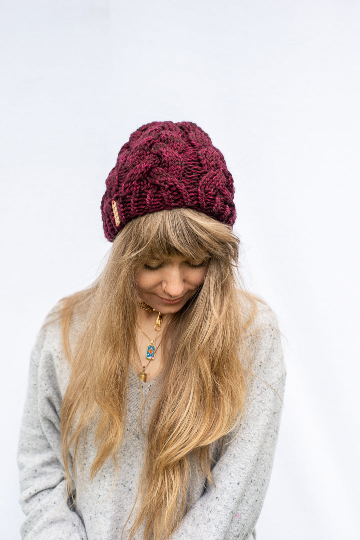 All one of a kind hats are knit with hand dyed, 100% merino wool. Because of how the wool we use is dyed by hand, each skein is unique. Combined with the braided pattern, even if we use the same colorway, each hat is totally one of a kind.