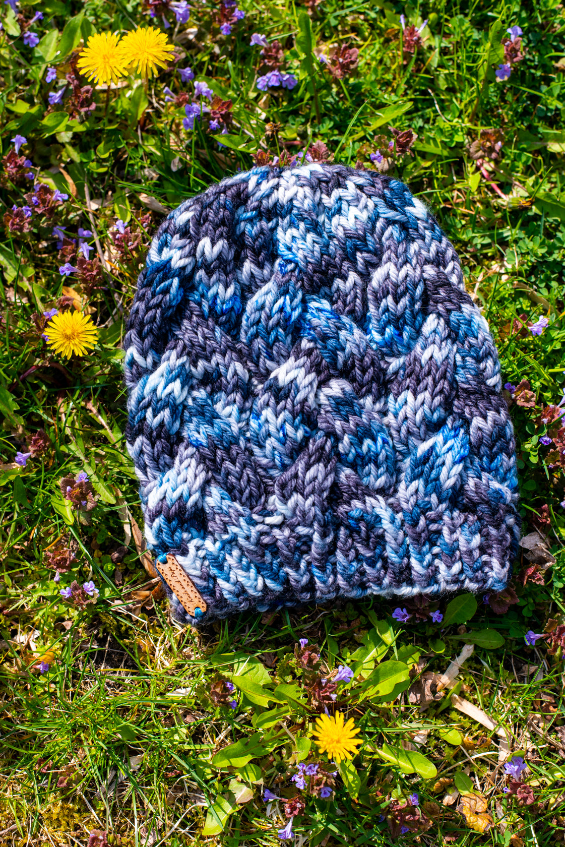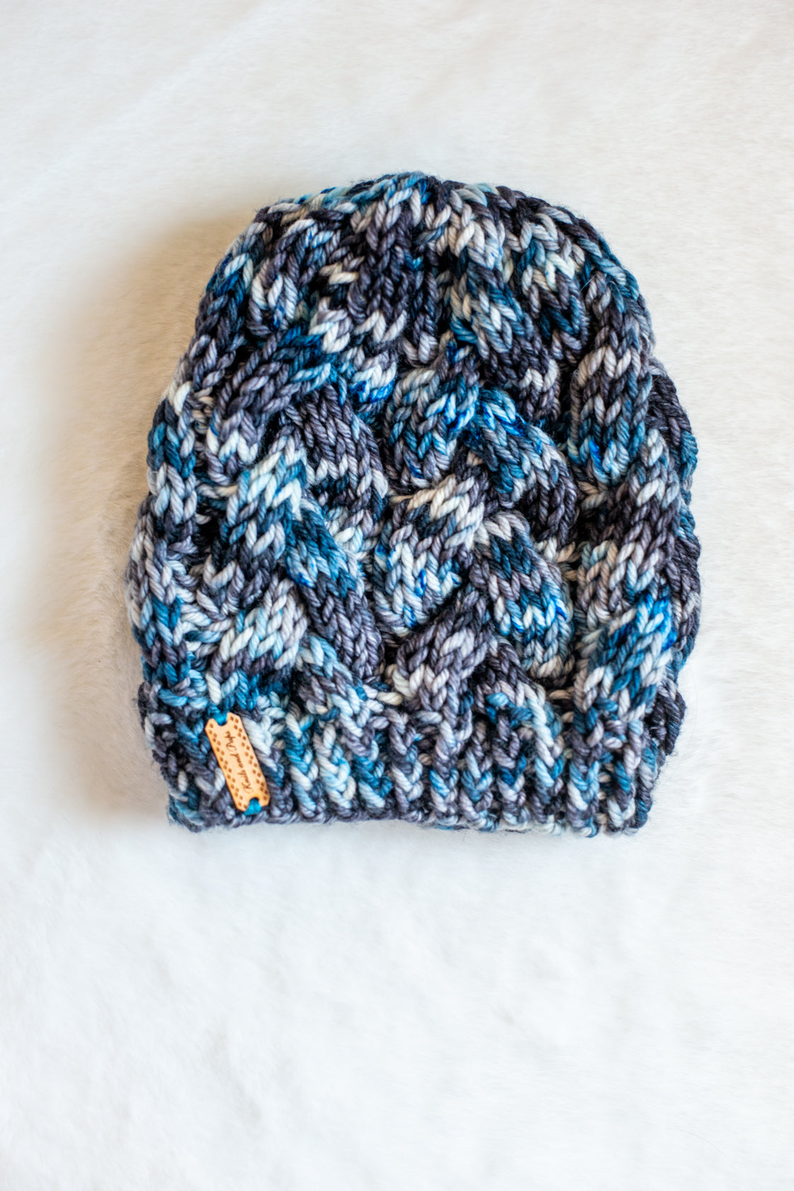 All one of a kind hats are knit with hand dyed, 100% merino wool. Because of how the wool we use is dyed by hand, each skein is unique. Combined with the braided pattern, even if we use the same colorway, each hat is totally one of a kind.