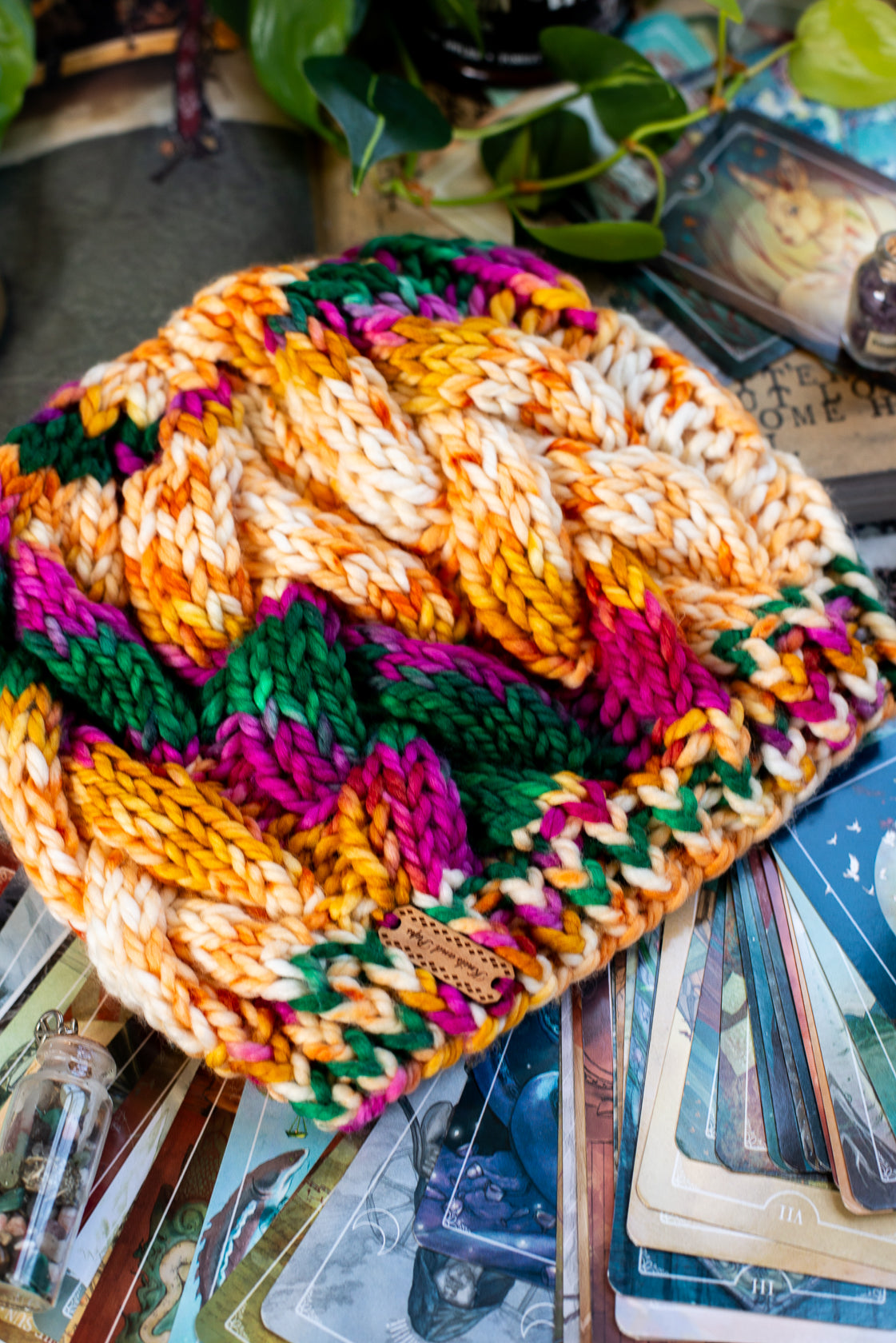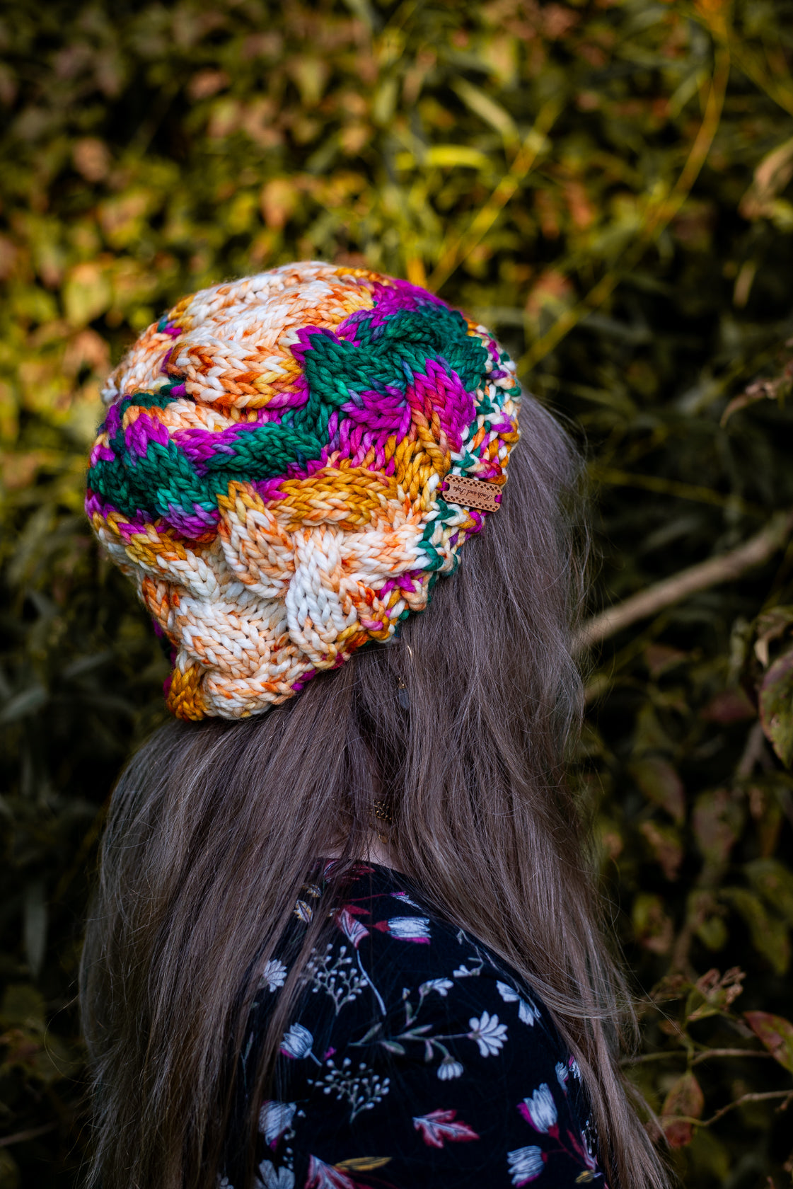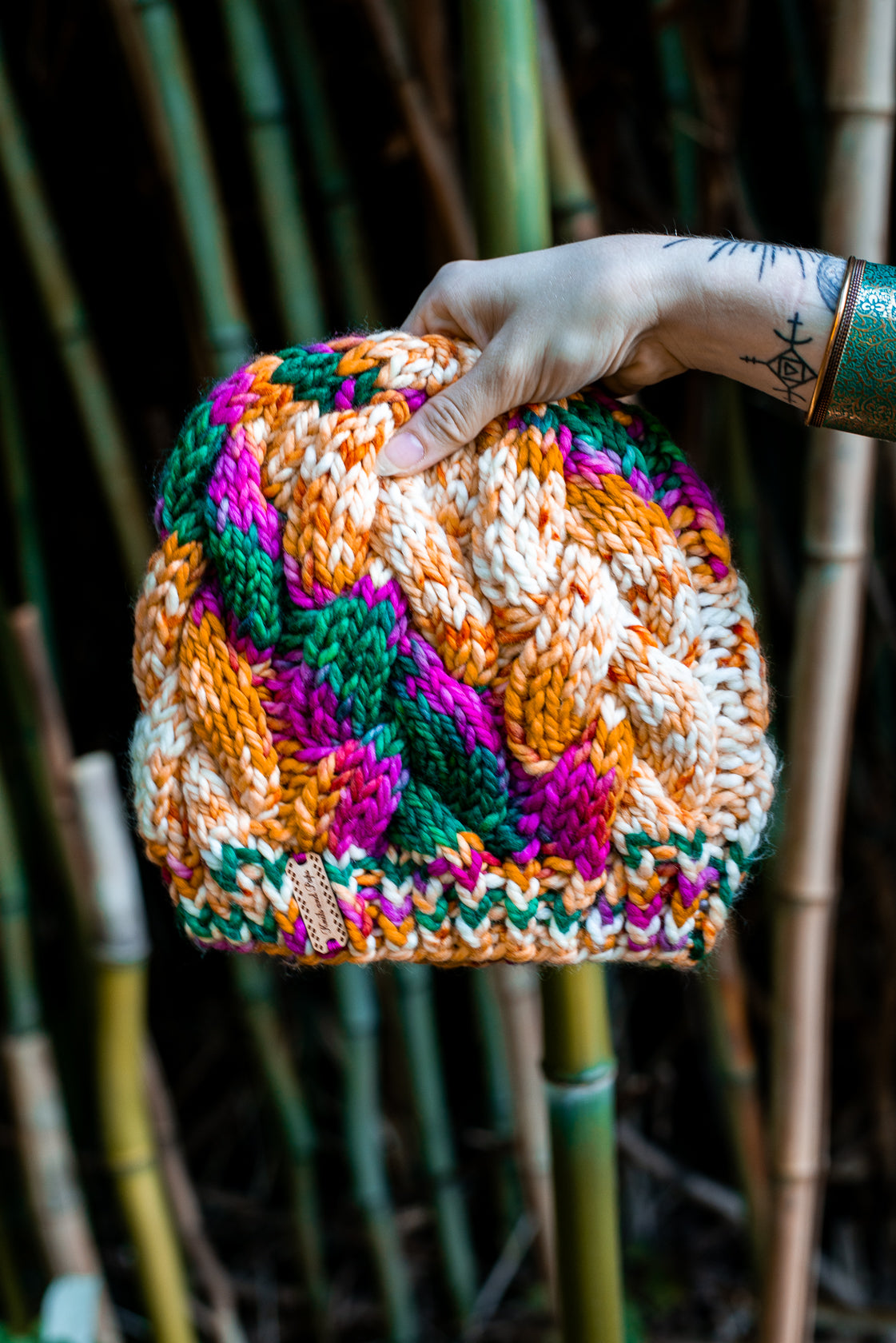 All one of a kind hats are knit with hand dyed, 100% merino wool. Because of how the wool we use is dyed by hand, each skein is unique. Combined with the braided pattern, even if we use the same colorway, each hat is totally one of a kind.