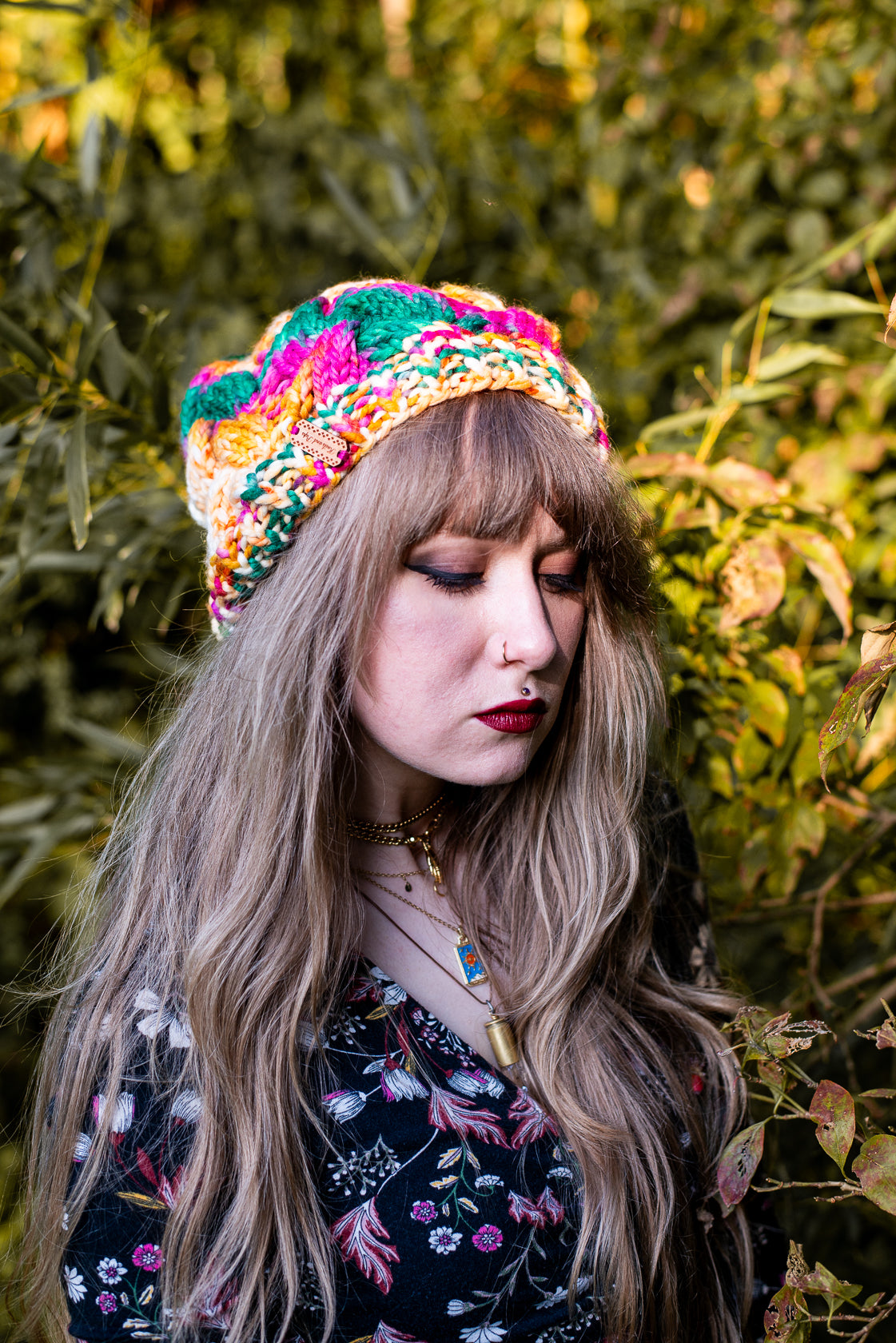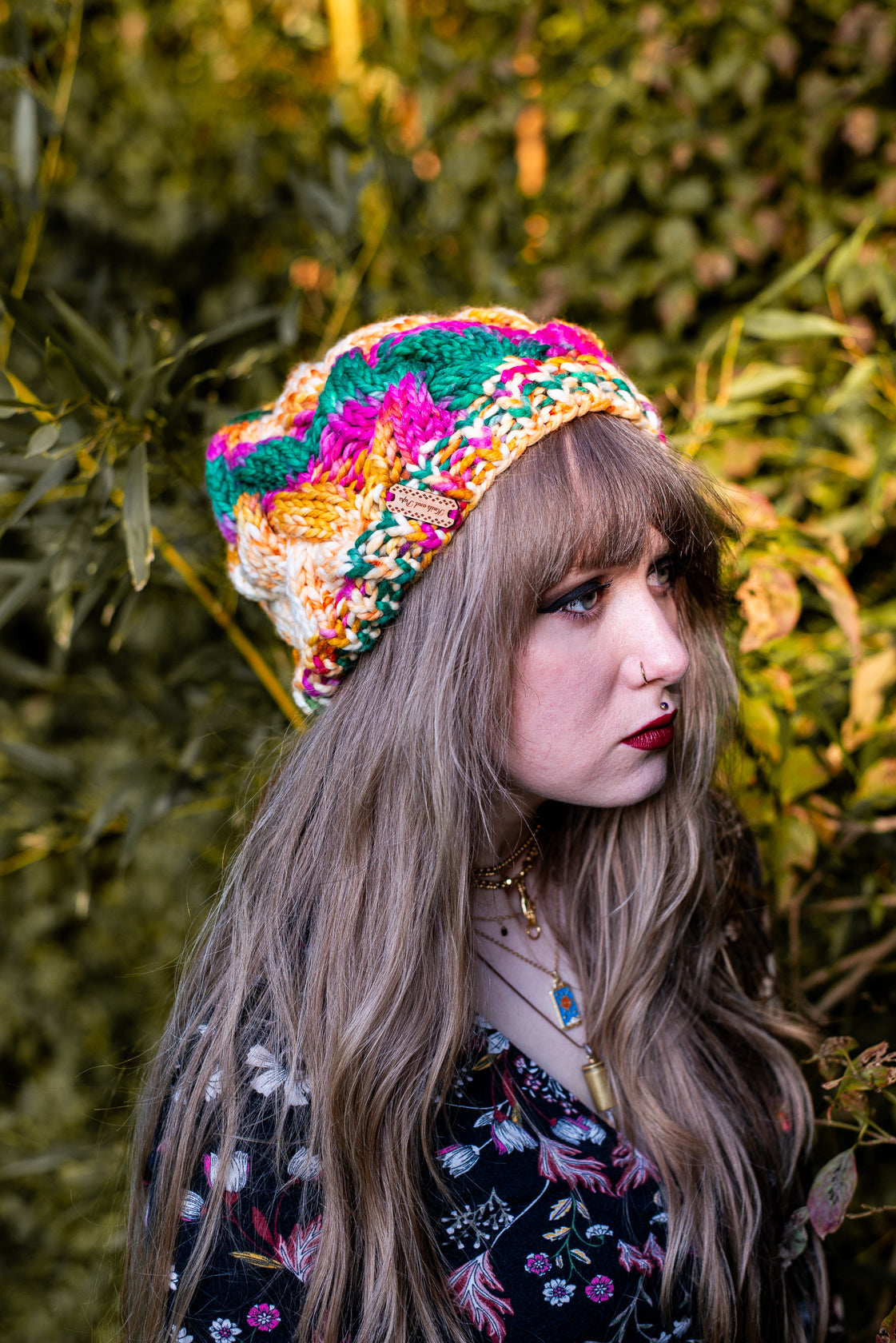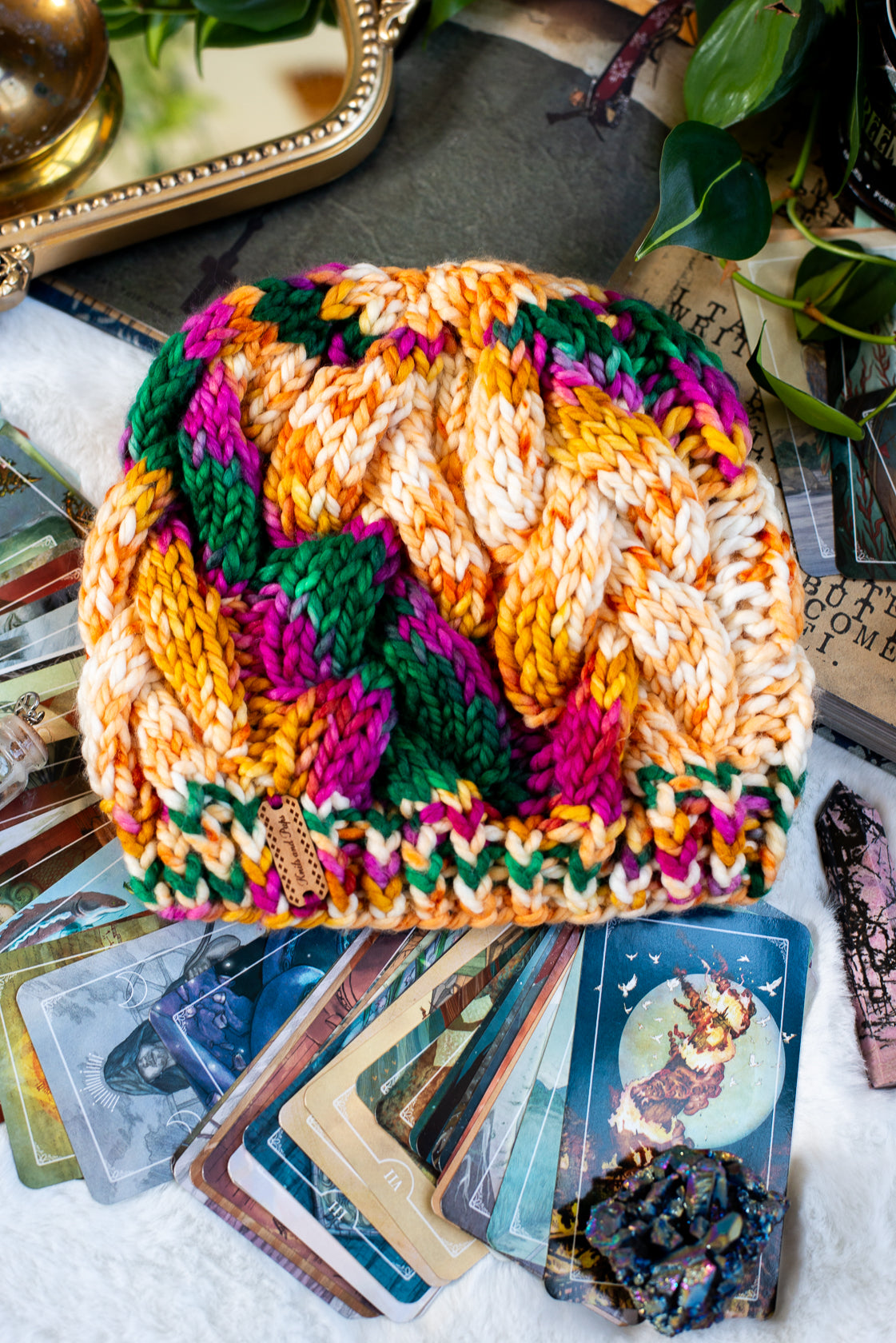 All one of a kind hats are knit with hand dyed, 100% merino wool. Because of how the wool we use is dyed by hand, each skein is unique. Combined with the braided pattern, even if we use the same colorway, each hat is totally one of a kind.