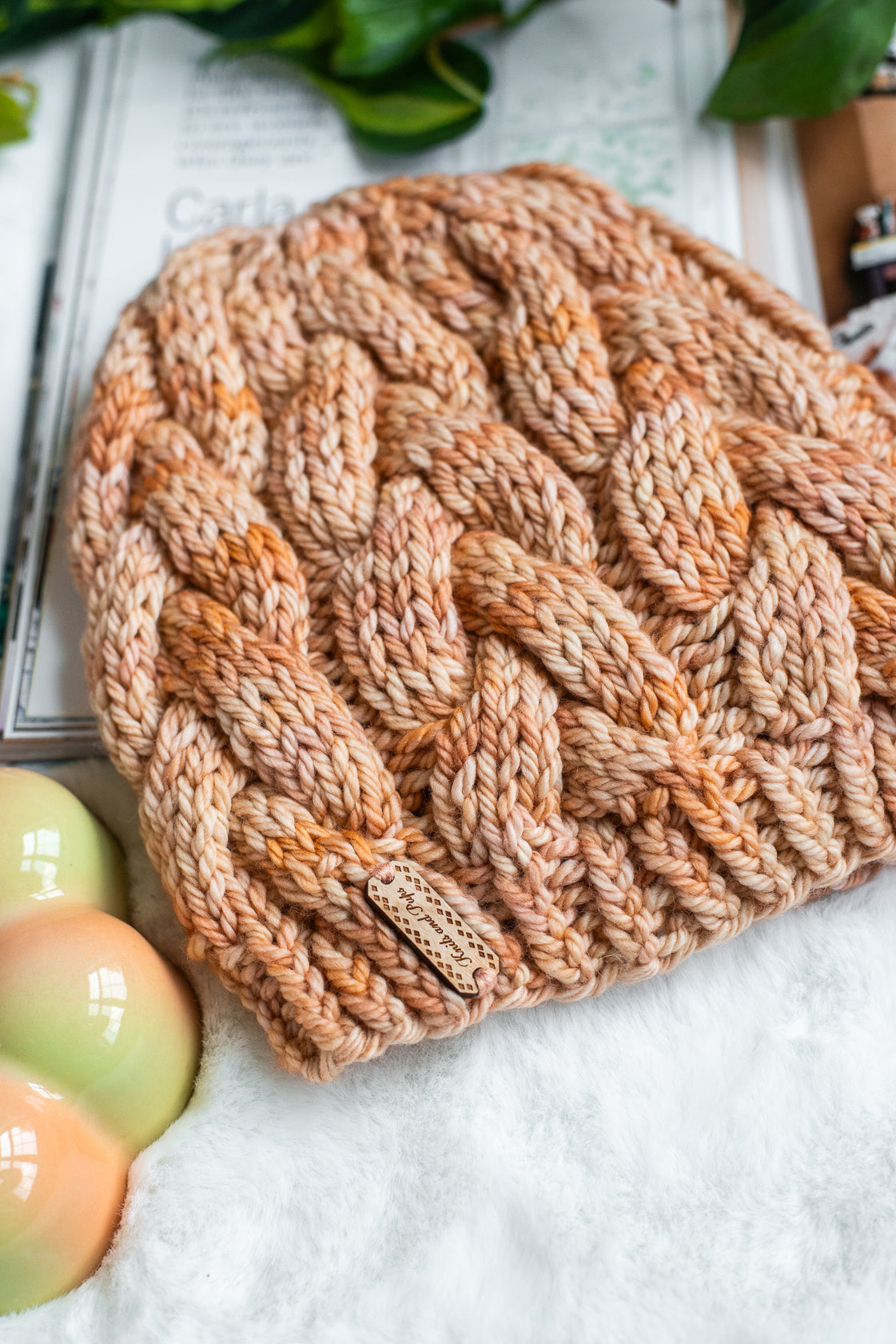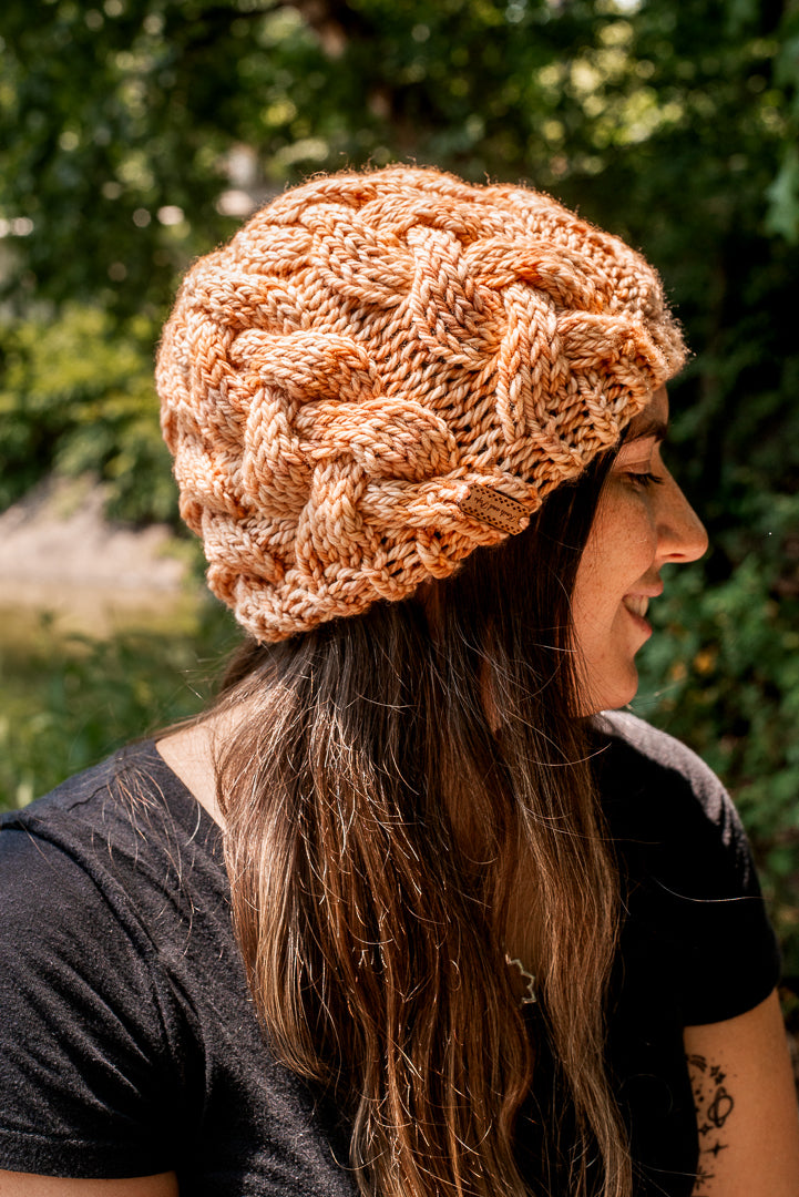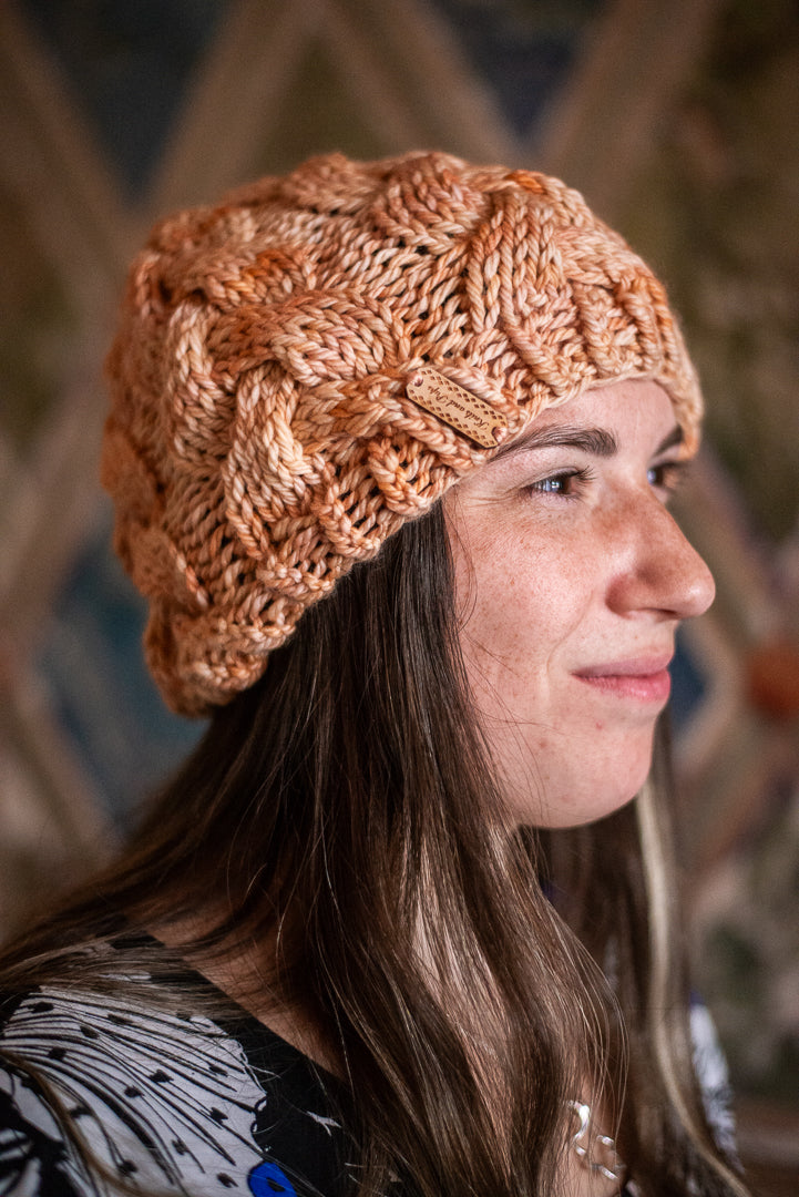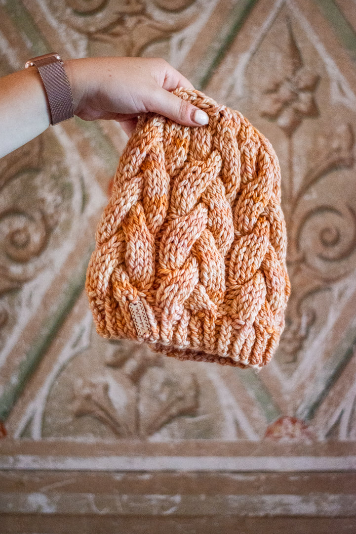 All one of a kind hats are knit with hand dyed, 100% merino wool. Because of how the wool we use is dyed by hand, each skein is unique. Combined with the braided pattern, even if we use the same colorway, each hat is totally one of a kind.