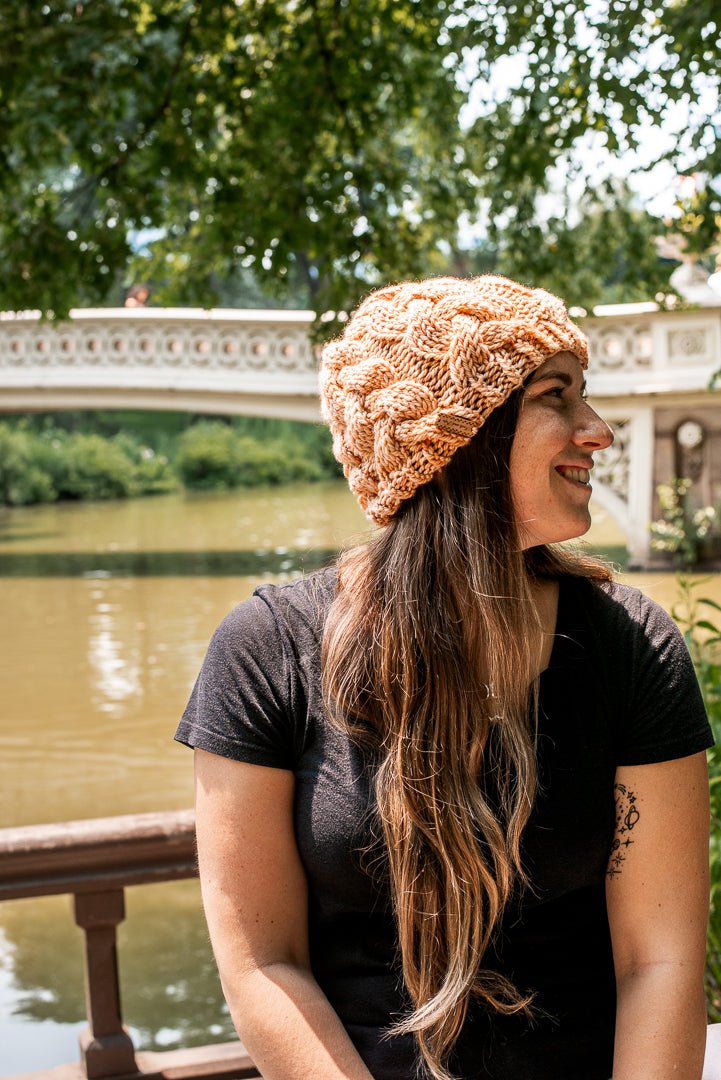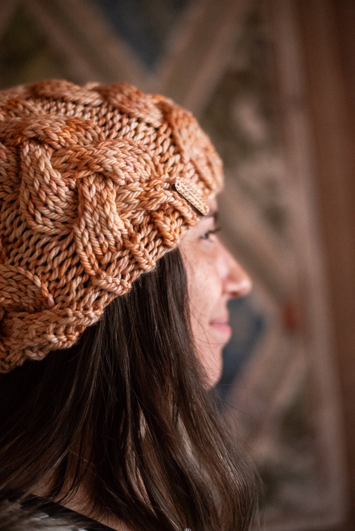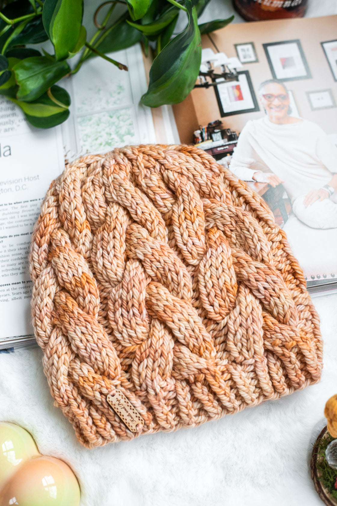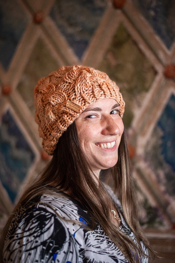 All one of a kind hats are knit with hand dyed, 100% merino wool. Because of how the wool we use is dyed by hand, each skein is unique. Combined with the braided pattern, even if we use the same colorway, each hat is totally one of a kind.