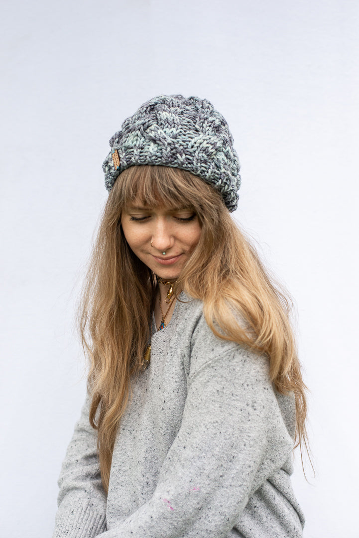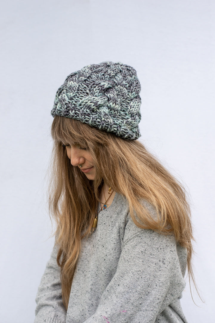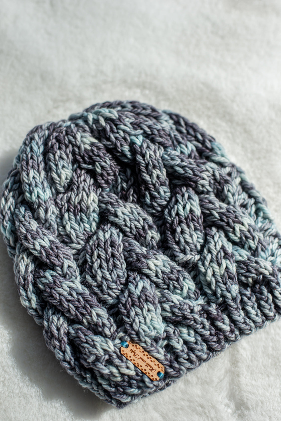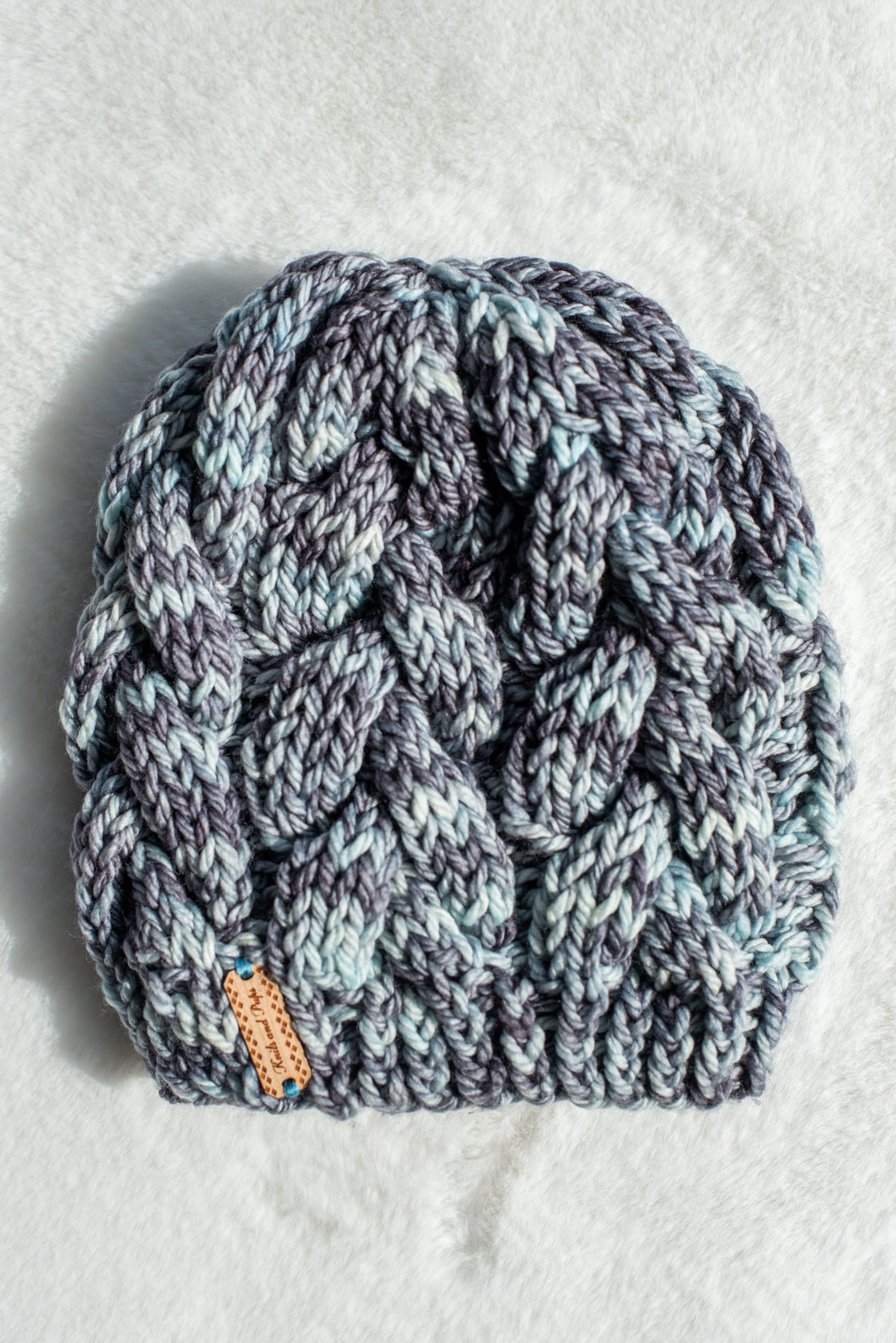 All one of a kind hats are knit with hand dyed, 100% merino wool. Because of how the wool we use is dyed by hand, each skein is unique. Combined with the braided pattern, even if we use the same colorway, each hat is totally one of a kind.