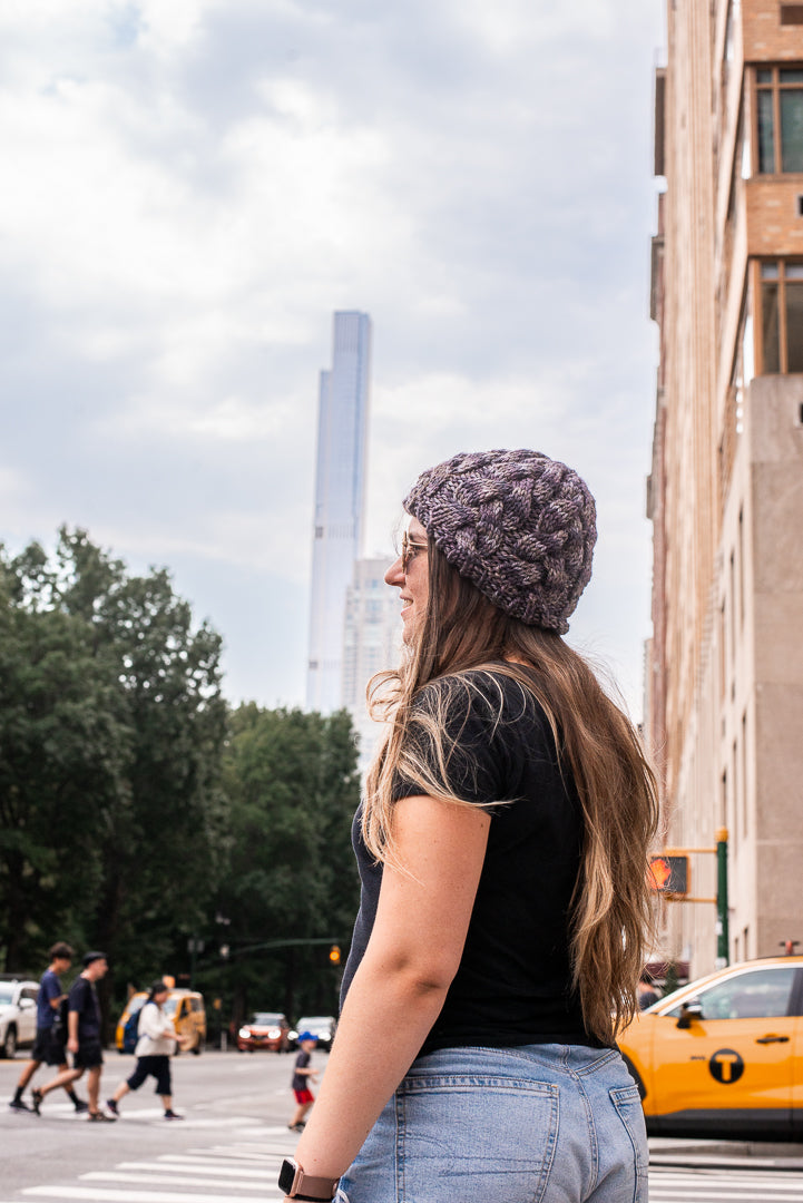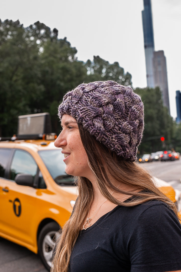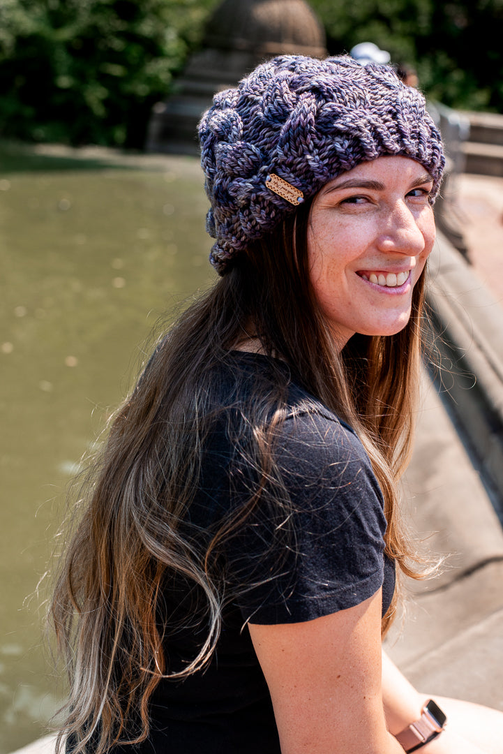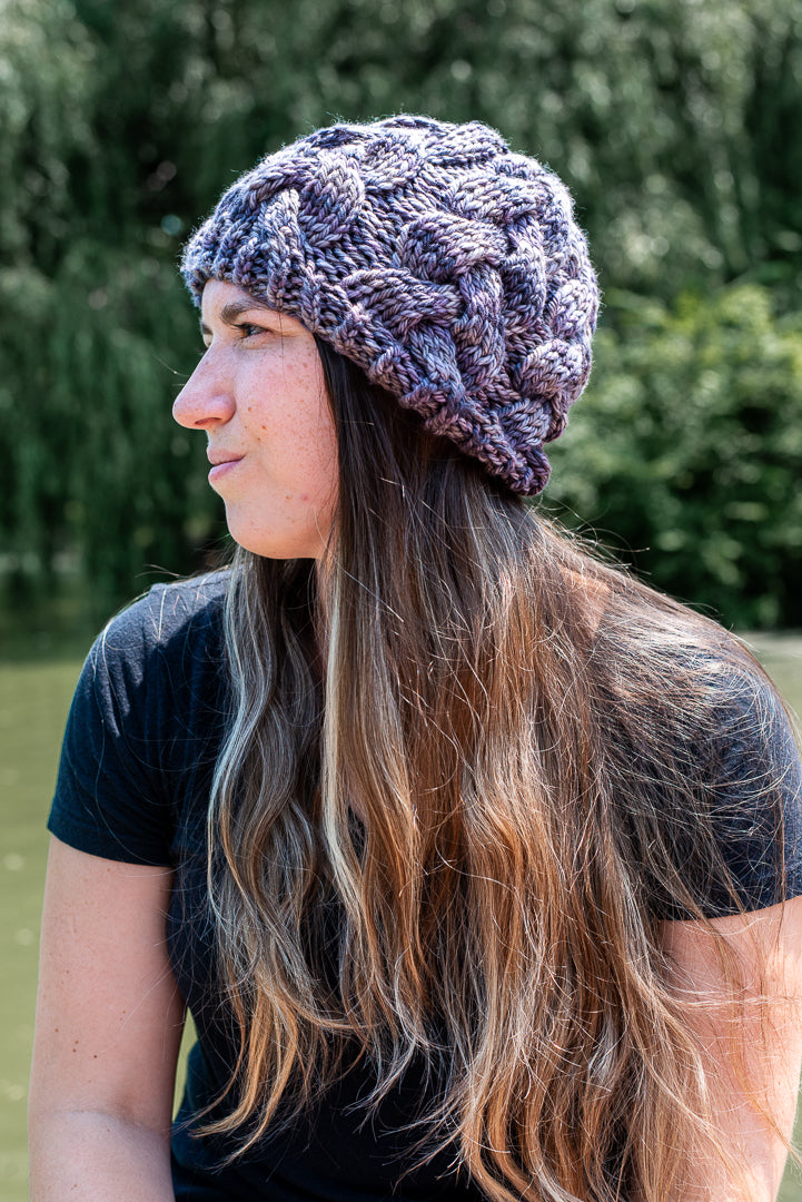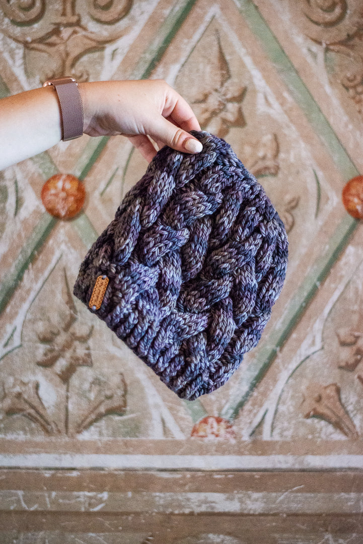 All one of a kind hats are knit with hand dyed, 100% merino wool. Because of how the wool we use is dyed by hand, each skein is unique. Combined with the braided pattern, even if we use the same colorway, each hat is totally one of a kind.